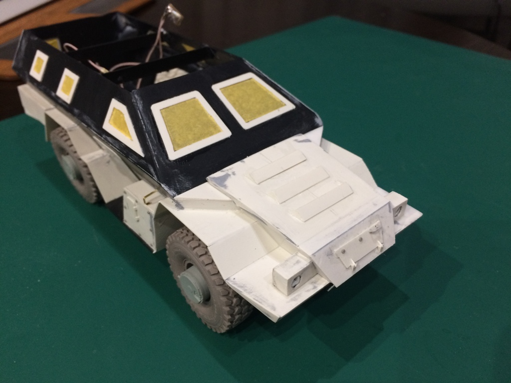 Почти закончил правую сторону. Передние крылья, бак, дверь. Пришлось переделать заднее крыло, не знаю как я просмотрел. Думал, что только у первых модификаций с такой формой задние крылья, а потом прямые пошли, но все таки ошибся, правый борт у всех изломан, там выхлоп идет. Просто в сети еще много зеркаленных фото, это хорошо просматривается по дворникам и шноркелю