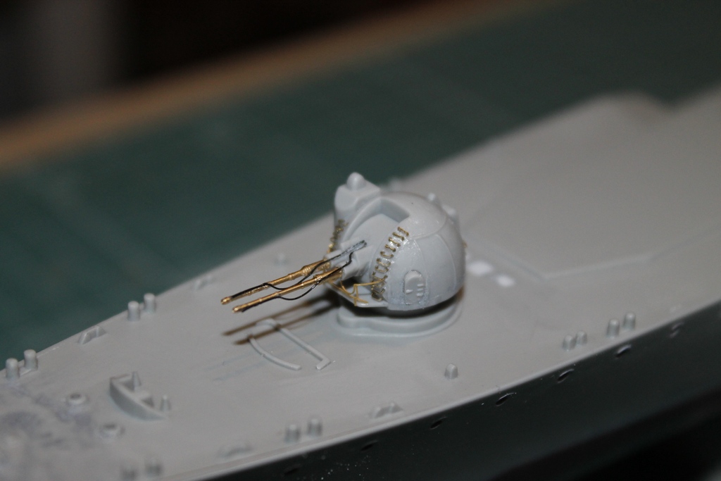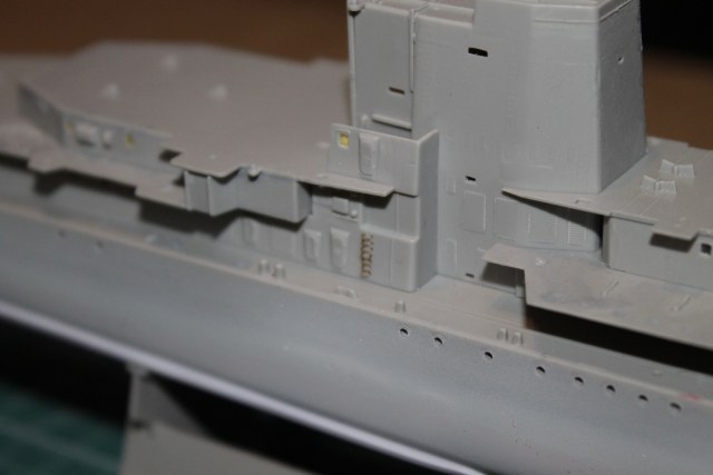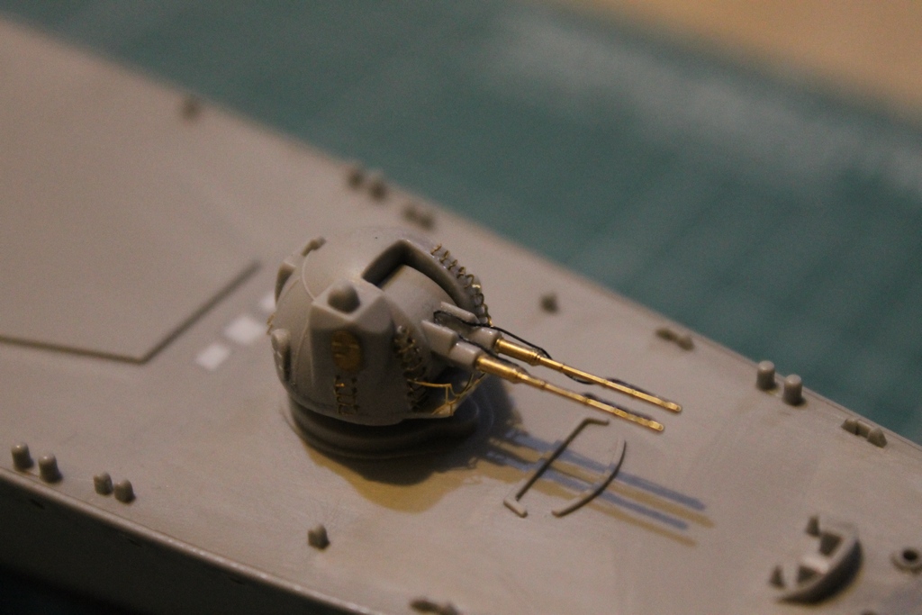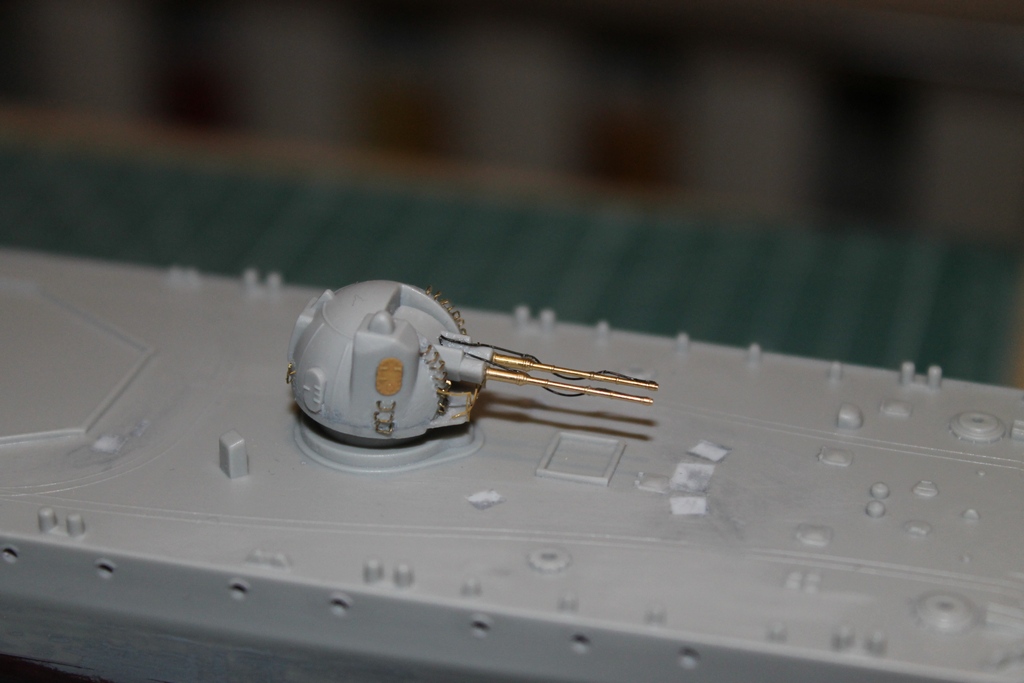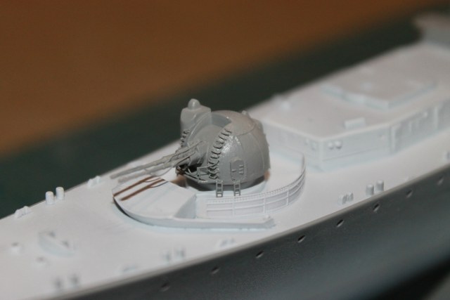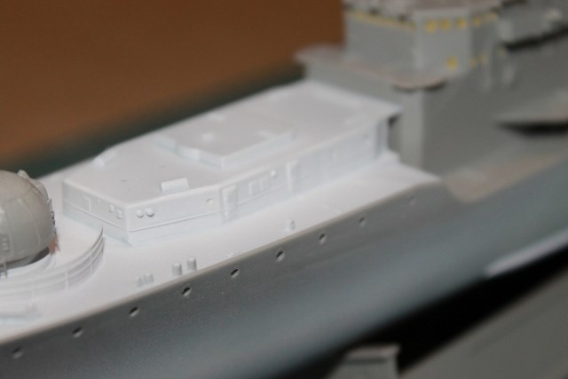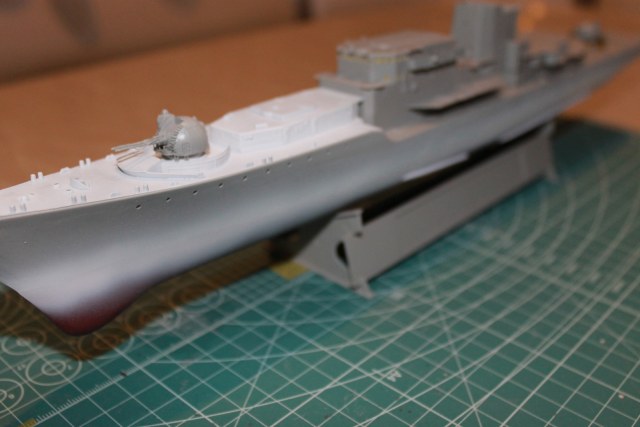 Вчерновую склеил практически все надстройки, на месте иллюминаторов вклеил прозрачный пластик и замаскировал скотчем от тамии для дальнейшей окраски. Пока доделал и окрасил 1 из ак130 - хочу сделать их хотя бы вращающимися. Самую переднюю надстройку а также все что вокруг носовой ак130 приклеил намертво, загрунтовал, заново зашпаклевал проявившиеся щели, загрунтовал по новой - остался удовлетворен результатом.