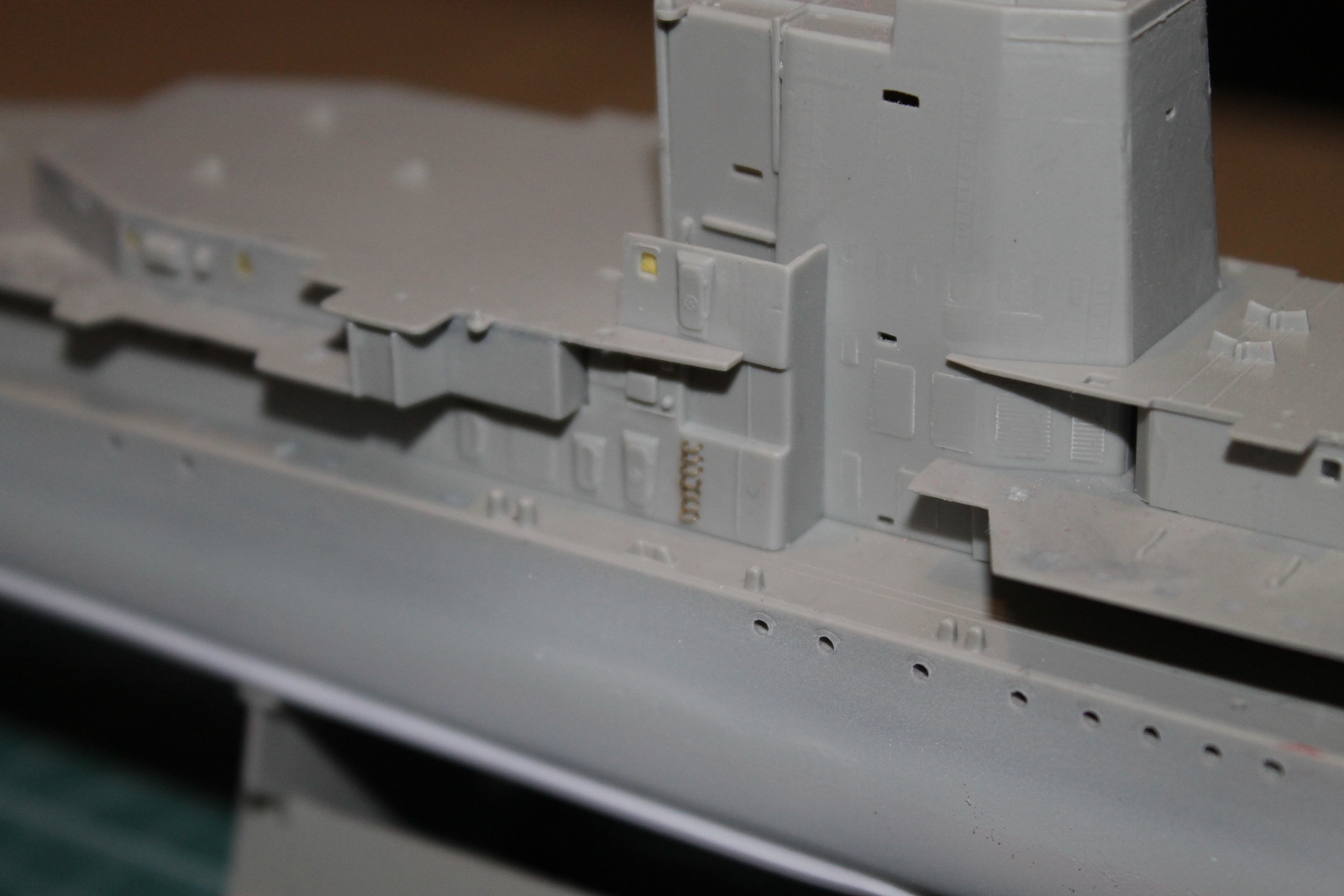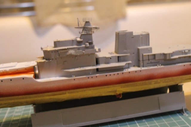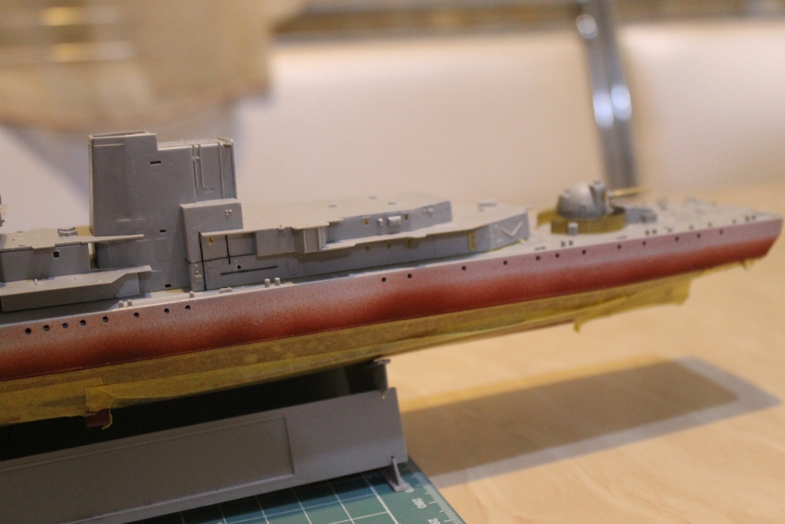 В общем, на сегодня продвижение такое: окончательно загрунтовал и покрасил корпус ниже ватерлинии, проделал отверстия для будущей проводки, серую область оставил на потом во-первых чтобы не заляпать, во-вторых судя по фотографиям и схеме, некоторые надстройки будут идти вровень с корпусом, поэтому кое-где явно придется еще и шпаклевать и только потом красить.
