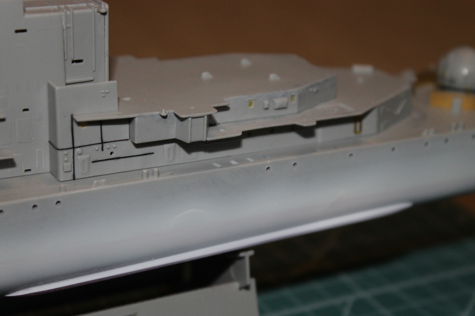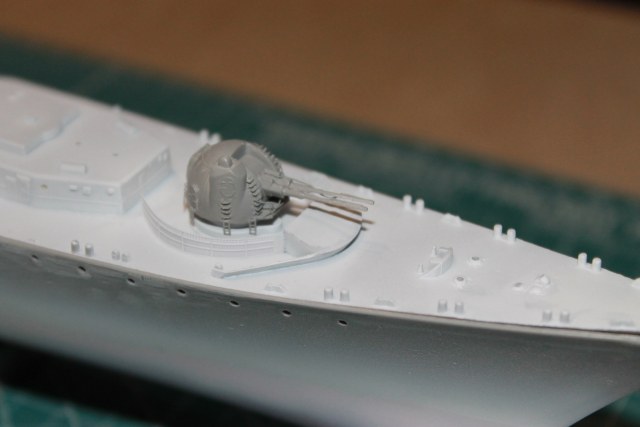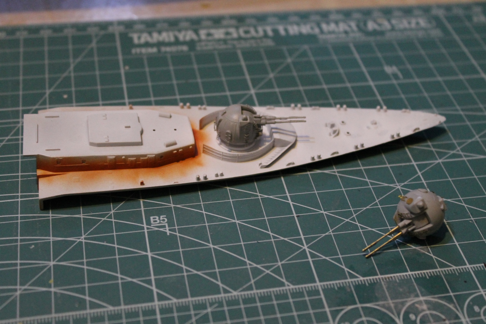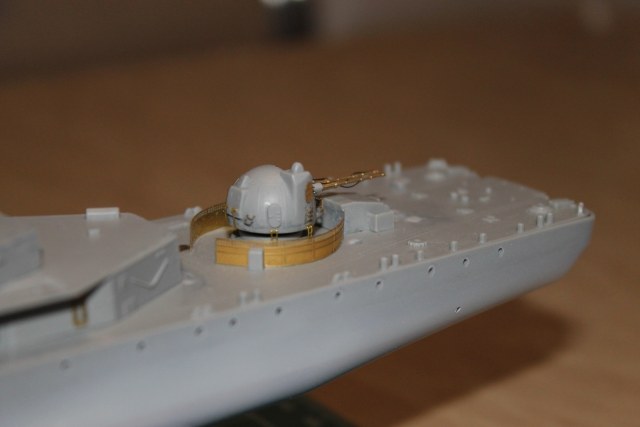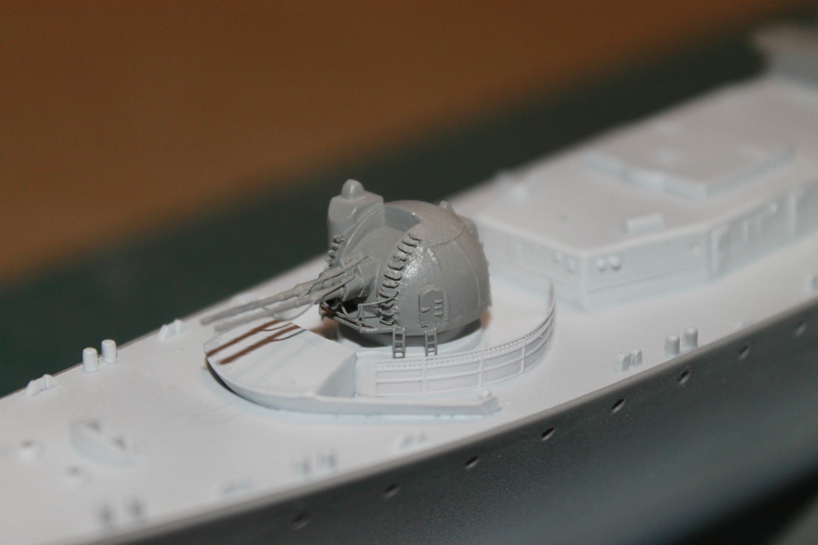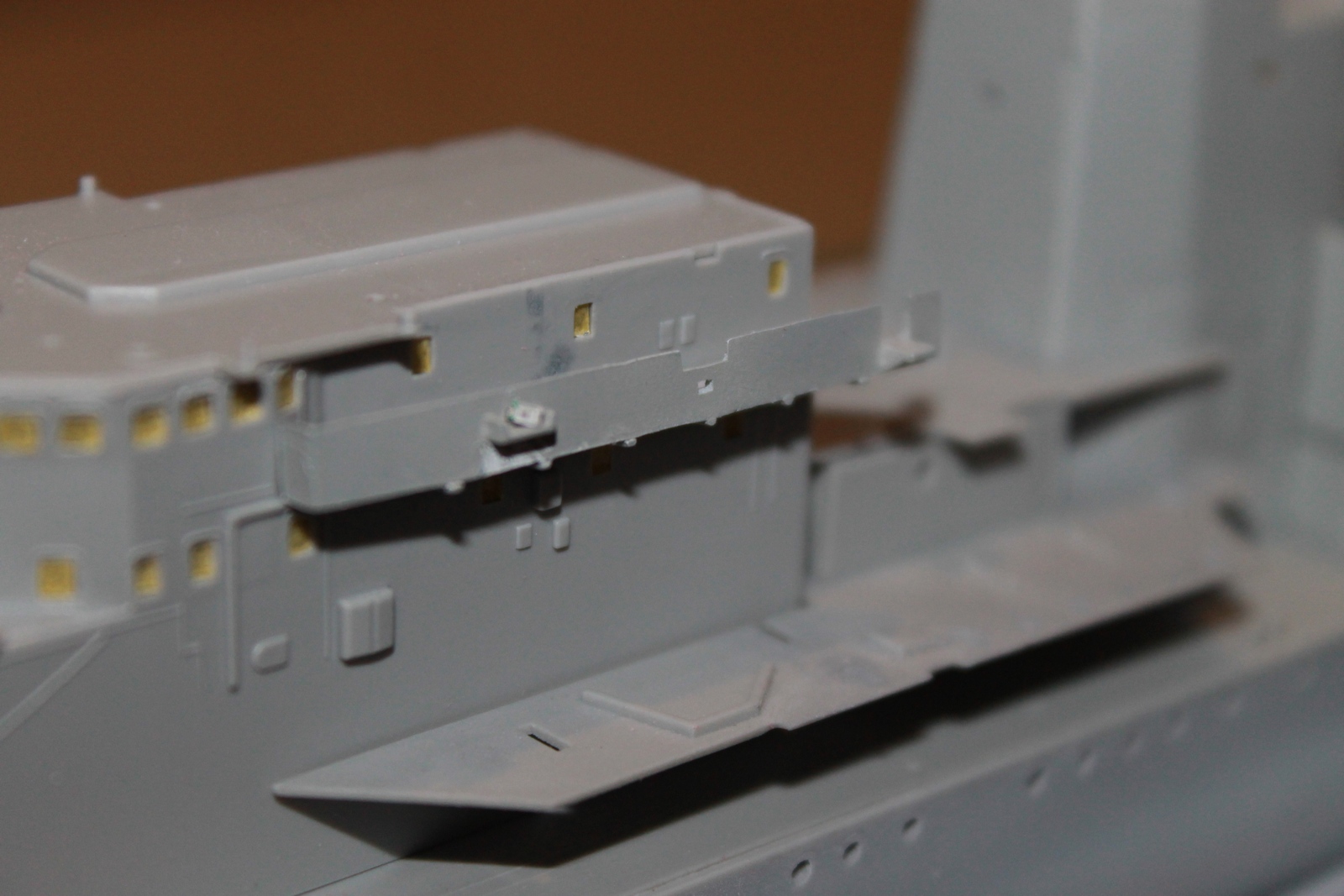 Затем склеил, зашпаклевал, загрунтовал и покрасил ватервейс (вроде так эта линия на уровне пола зовется?) надстройки на баке. Естественно саму ее приклеил к палубе.