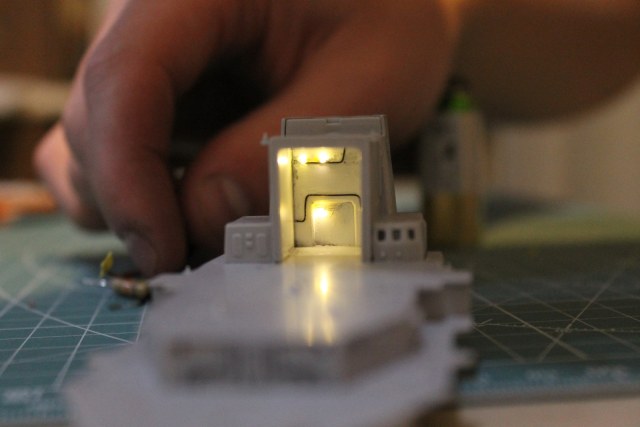 На пробу начал устанавливать освещение - вклеил красны и зеленый огни и попробовал спрятать провода - получилось) провода настолько тонкие что свободно помещаются в достаточно неглубоких желобах предварительно выпиленных в деталях. Проверил мультиметром - вроде ничего не перебил и оба диода рабочие.