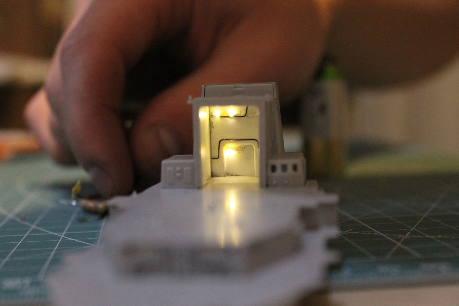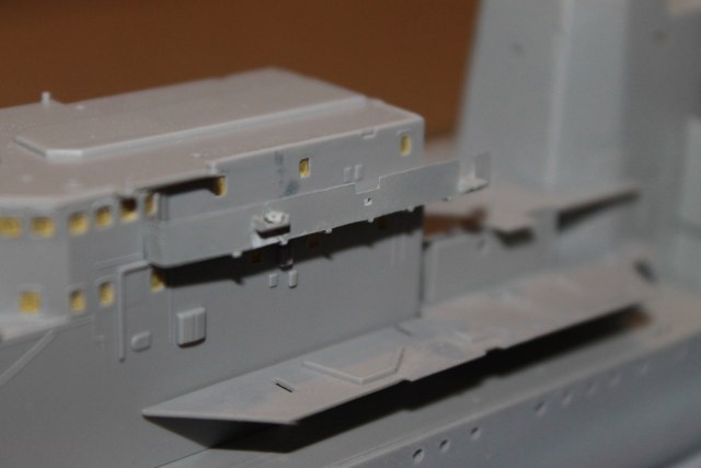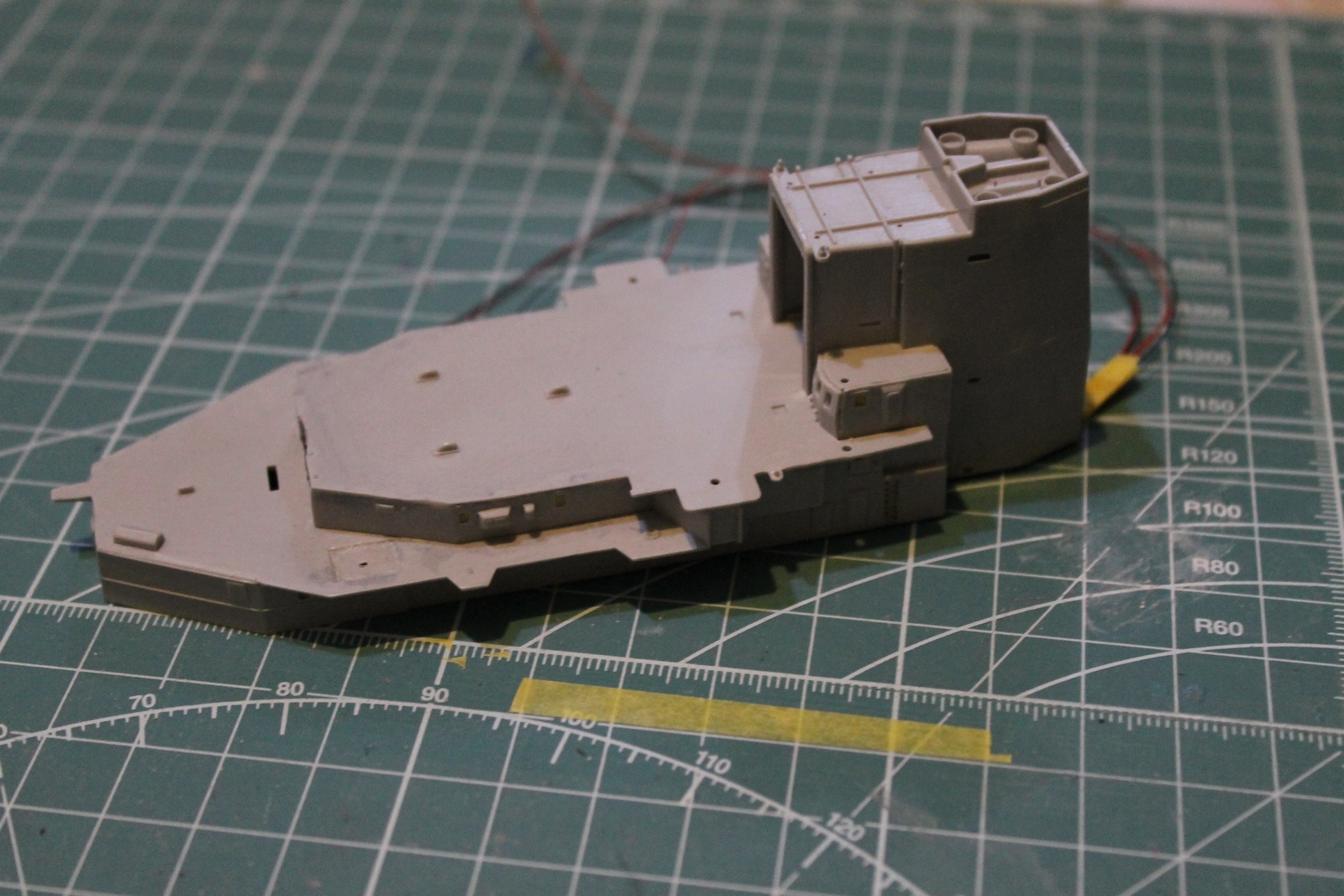 Вчерновую собрал кормовую надстройку и ,основываясь на фотографиях Сергея, приступил к формированию интерьера ангара (благо он вроде бы не особо сложный). Естественно с внутренним освещением. Как только закончу с ним, планирую, делать мачту, размещать оставшиеся 2-3 огня (топовый, кормовой и возможо кильватерный) приклеивать надстройки к палубе, размещать всю проводку под корпусом и вклеивать все это хозяйство в корпус.