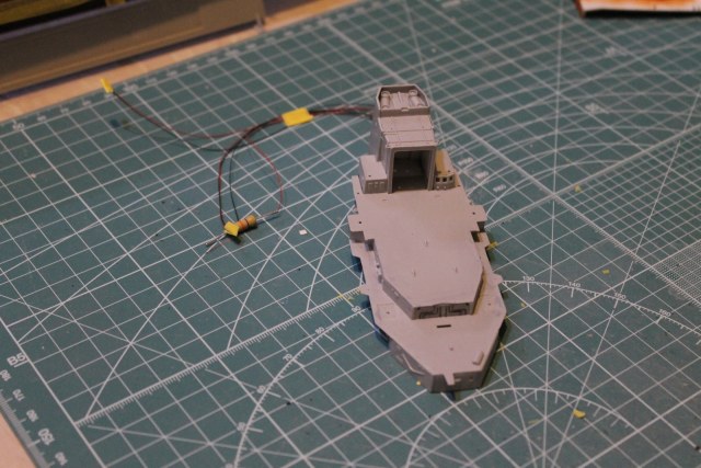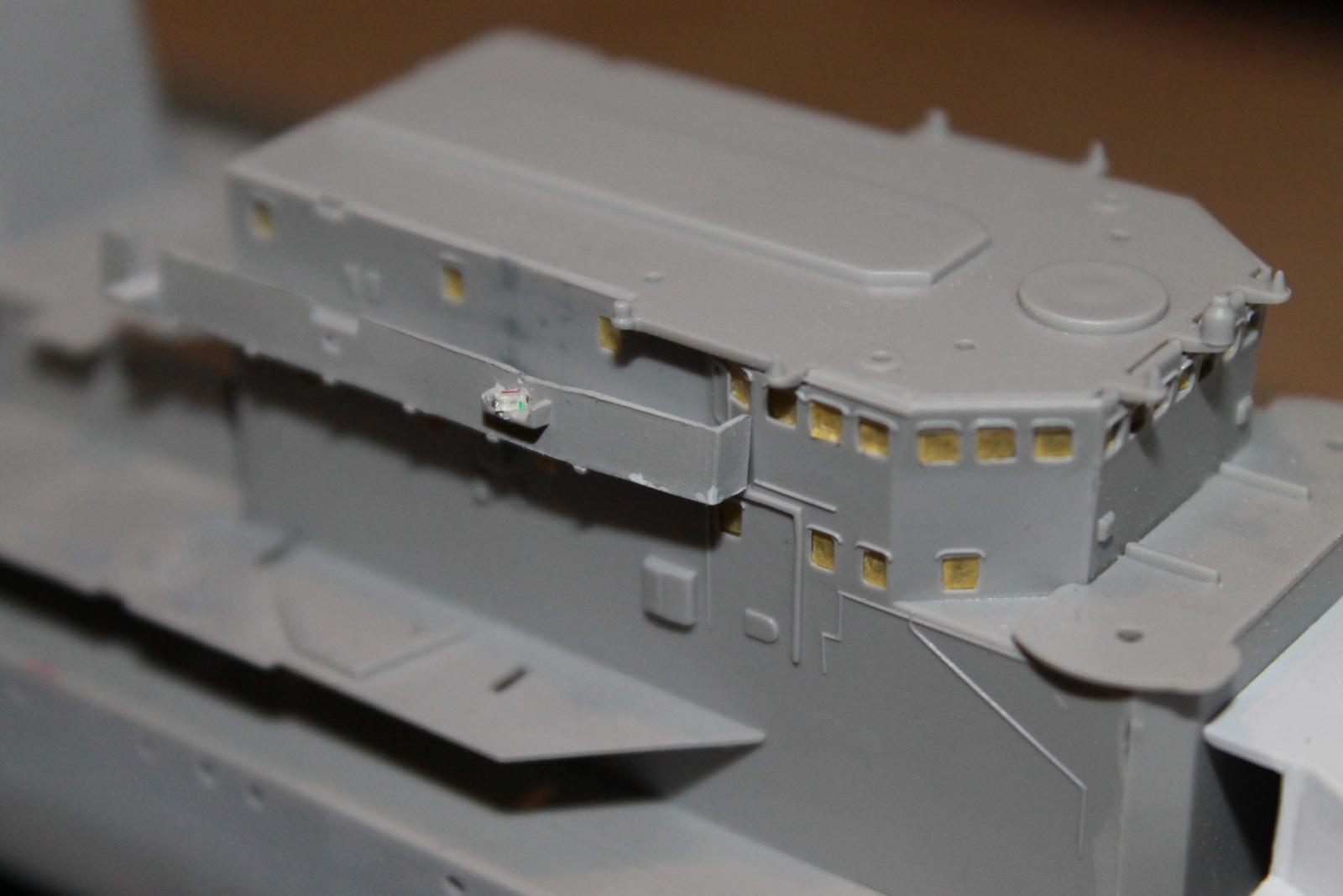 Склеил окончательно большую часть надстройки с мостиком и фокмачты. Волевым решением, а также основываясь на схеме GMM назначил ходовым огнем 2 огонь из предыдущего поста. Сделал 3 светодиод этой надстройки, спрятал провода, все это аккуратно насколько мог загрунтовал и покрасил. Приклеил надстройку к палубе и зашпаклевал щель между ними.