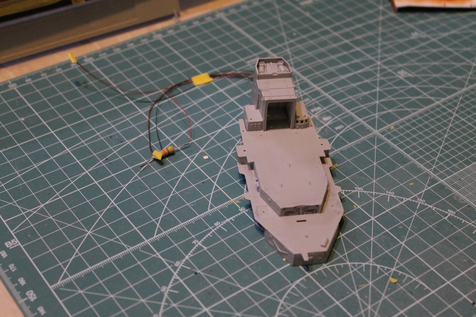 @Борис Волконский написал:Посоветую поставить: позиционные-красный зеленый,топовые,на кормовом флагштоке,на носовом флагштоке,ну еще пару -тройку кильватерных. Прожектор на полетную палубу и слека освещение /синее/ в открытом ангаре. Кстати на носовом и кормовом можно не заморачиваться с упрятыванием кабелей.Сделать однопроводное питаниеОдной ногой диод к конструкции на которой завести минус и проводом ко второй ноге плюс.Для этого конечно надо применять паяные элементы-флагштоки,мачту и прочее. Успехов.