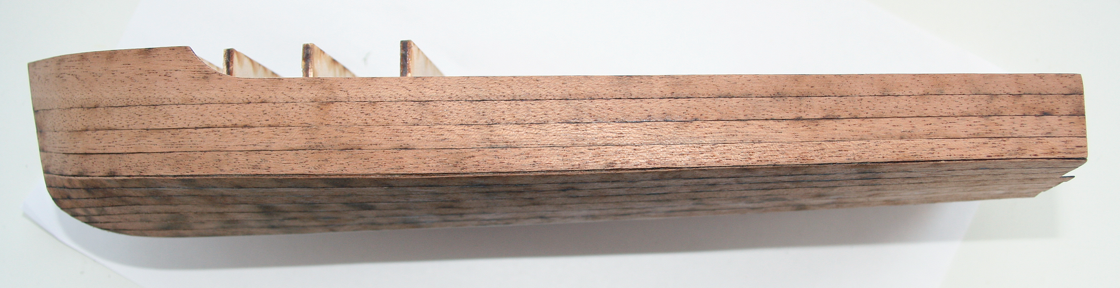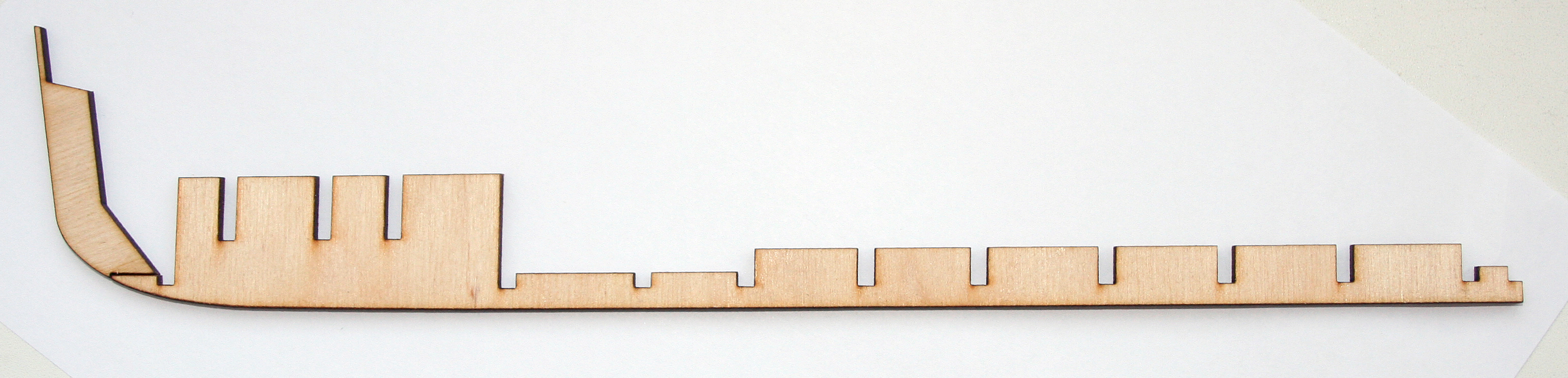 Фальшкиль и шпангоуты вырезаны лазером из фанеры 3мм. Каркас самовыравнивающийся при помощи направлющих прорезей на палубах и шпангоутах.