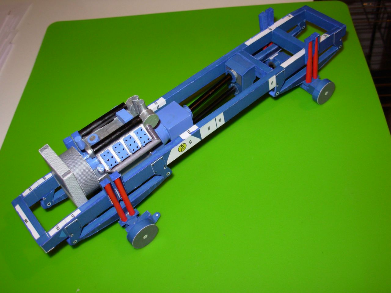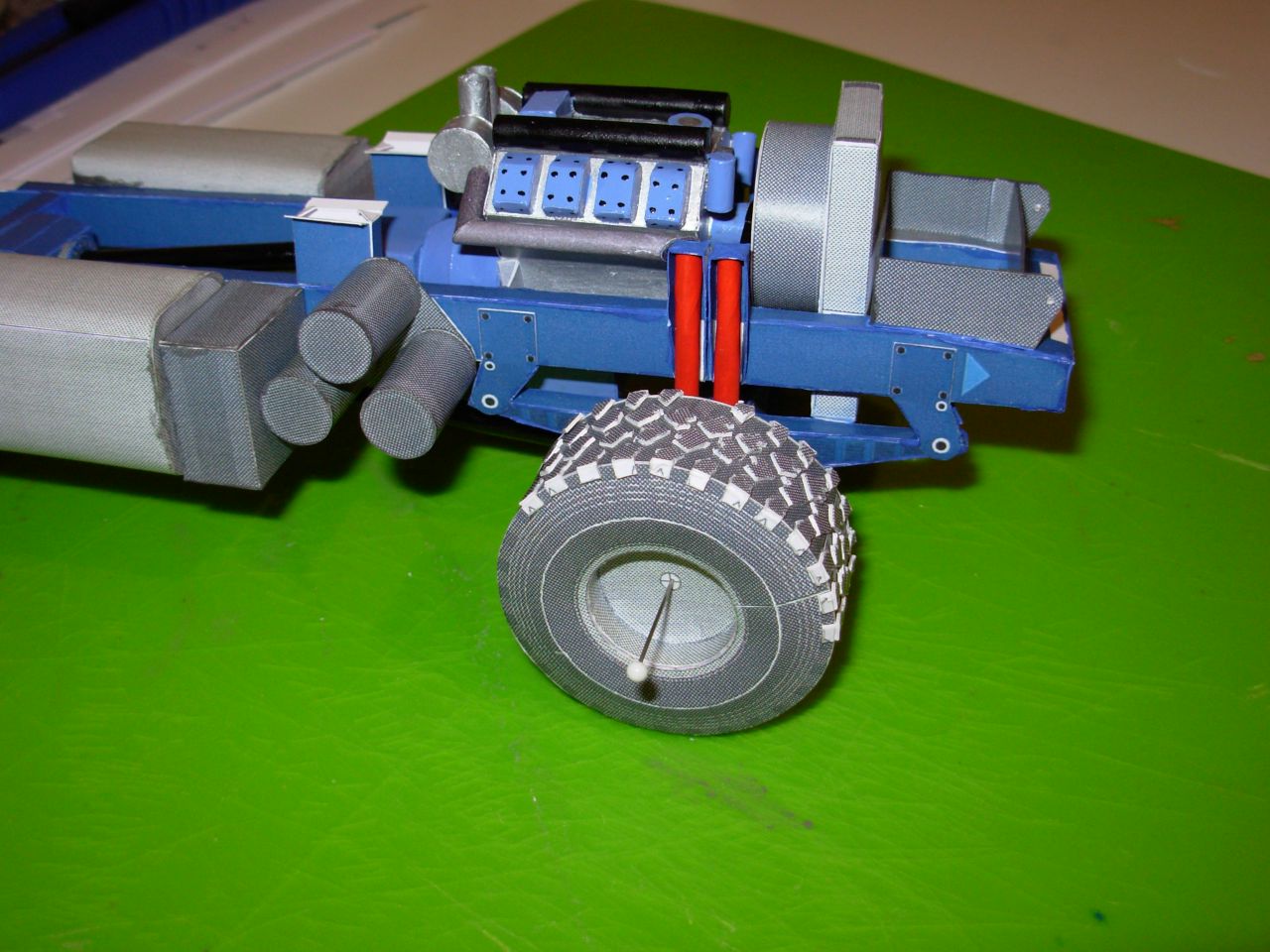 Продолжаем развлекаться. Ура,в моем распоряжении появился фотоаппарат,хоть и старенький,но рабочий. Сделаны карданные валы (из трубок), крепление кабины, ресиверы для тормозной системы, ящики и бензобаки. По раме вроде все,теперь можно приступить к доооолгому изготовлению колес. Колеса будут окрашиваться,поэтому сижу и вырезаю протектор вручную.