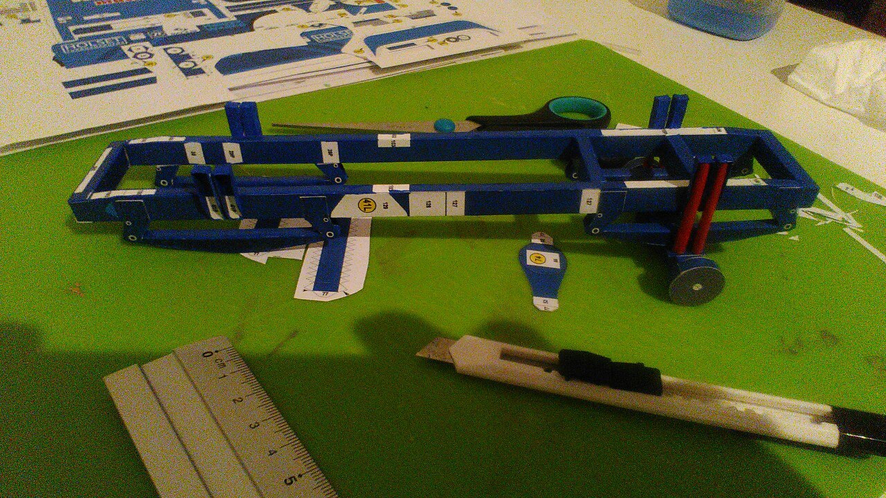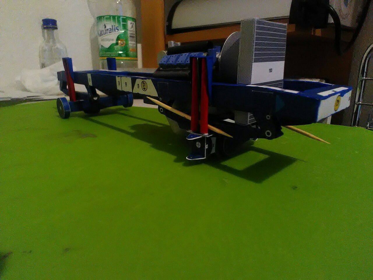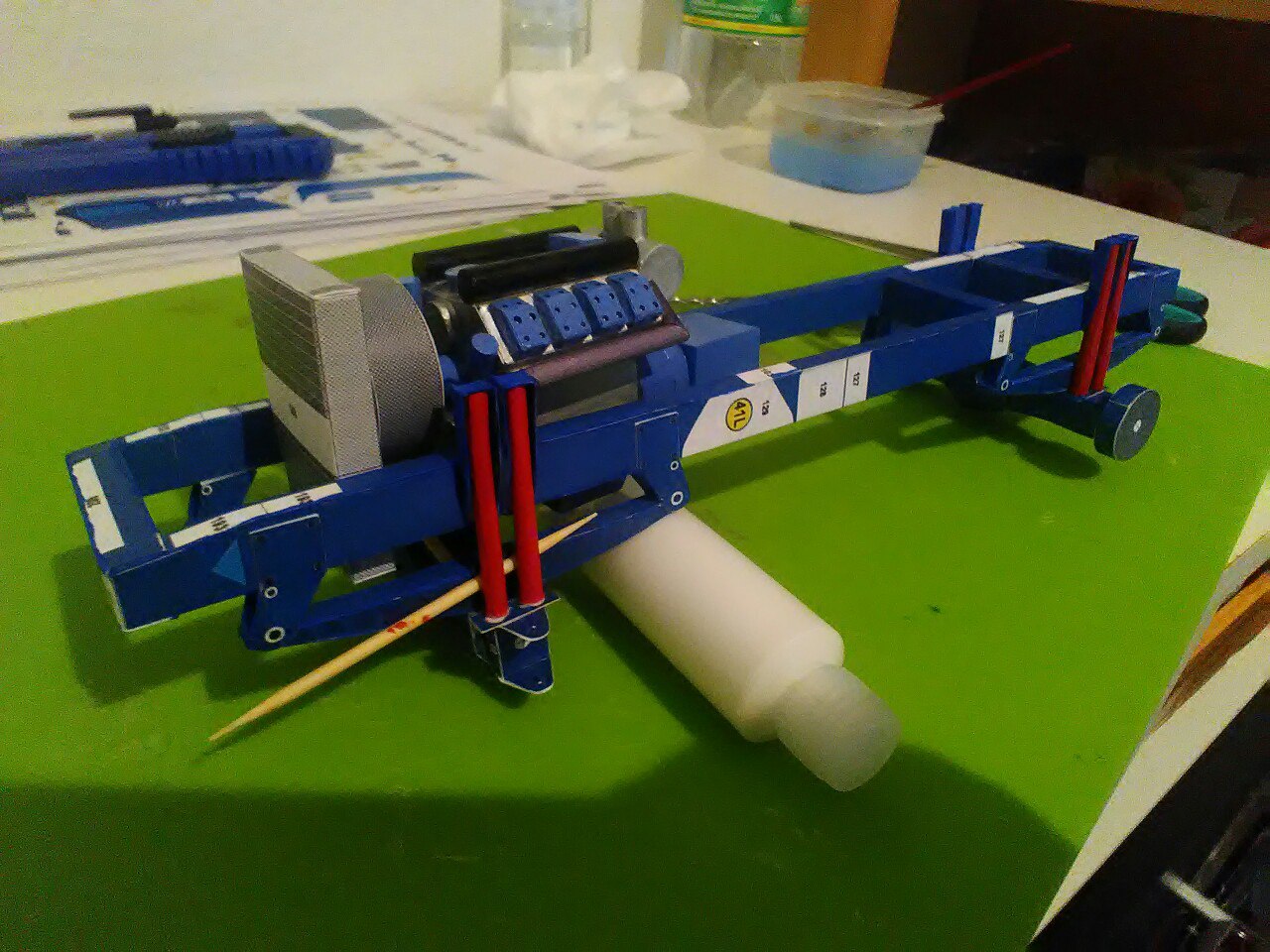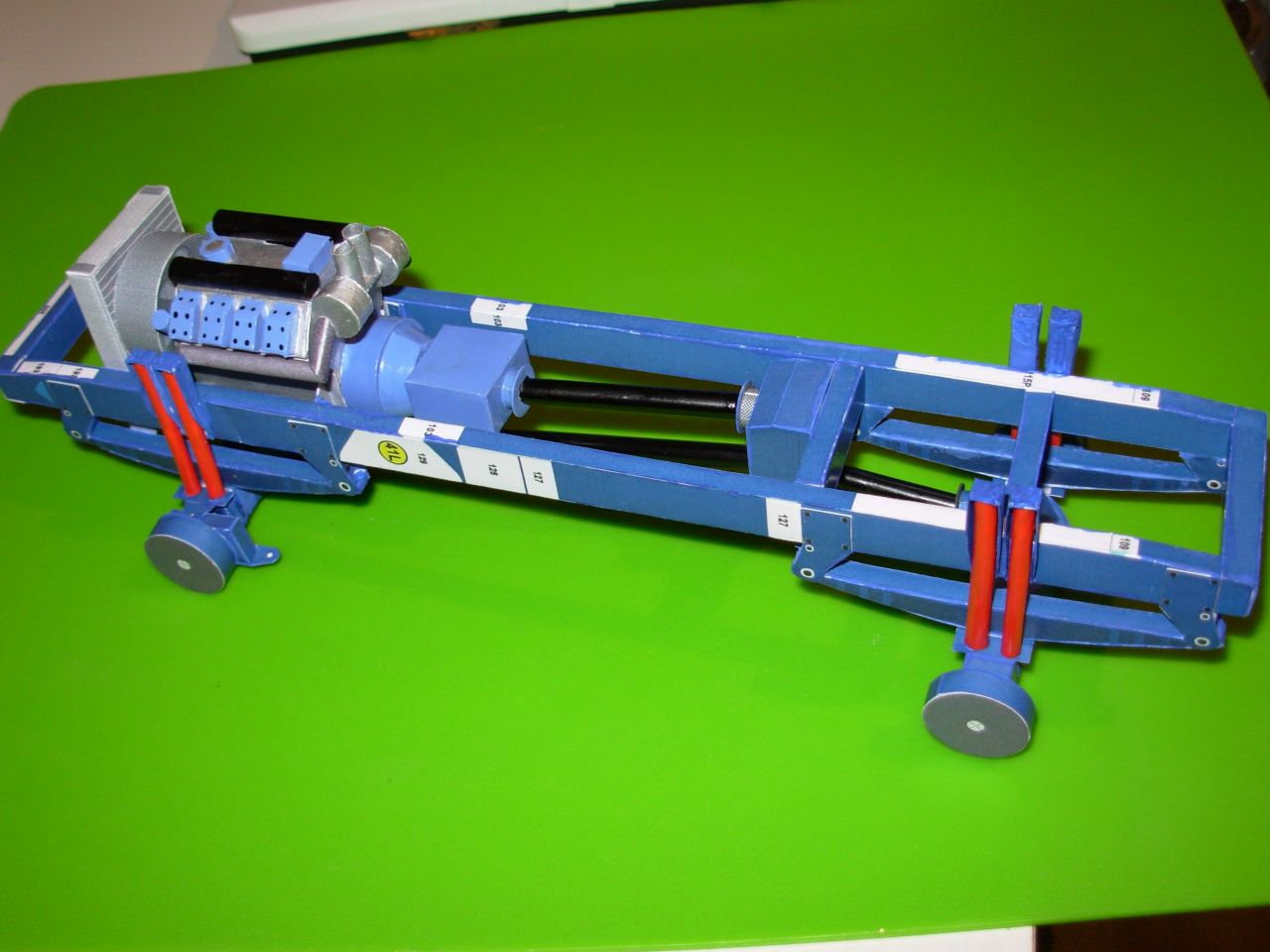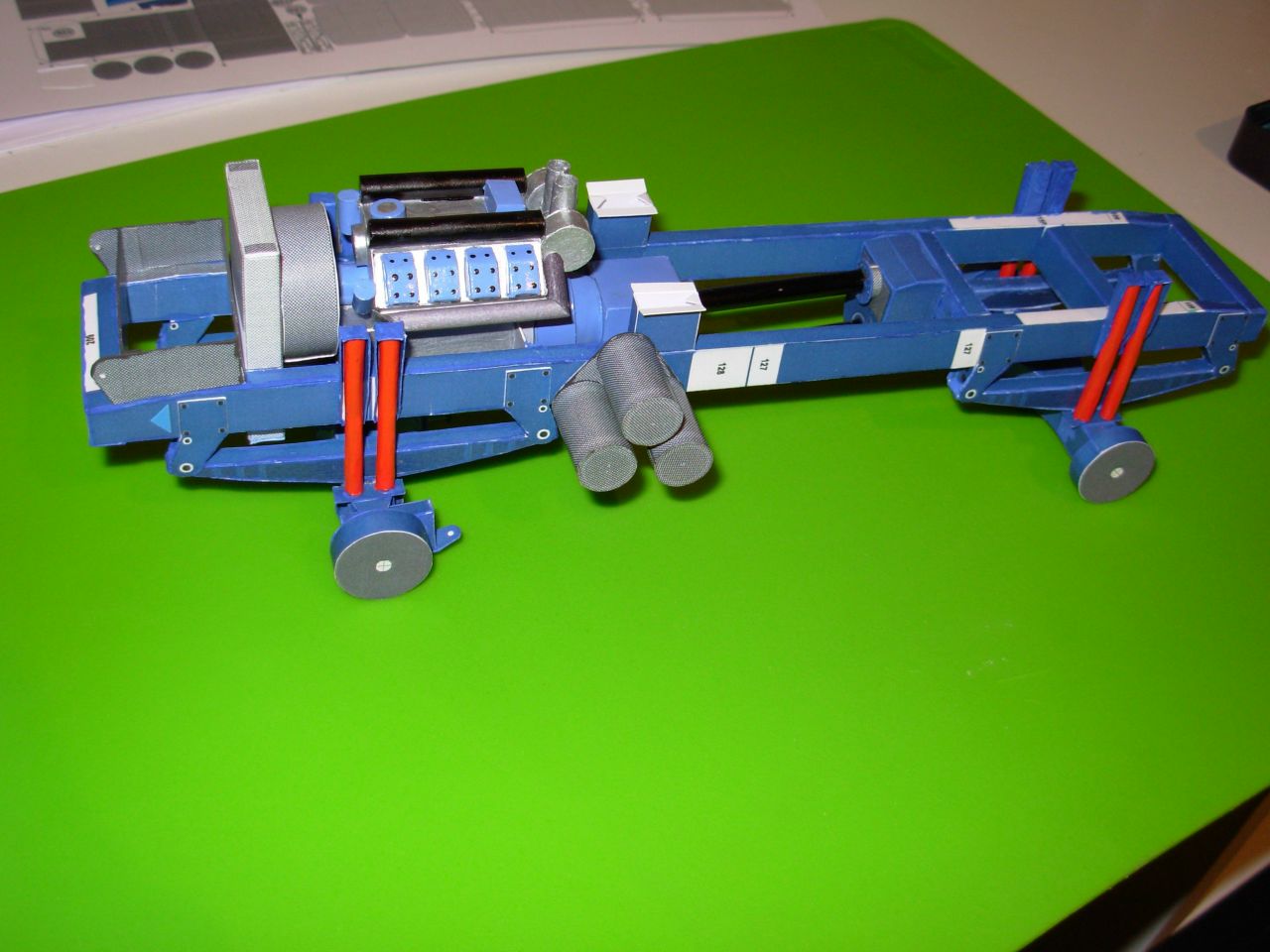 Всем здравствуйте! Сегодня был удачный и плодотворный день. Было проделано не мало работы. Двигатель был окончательно собрал и покрашен. Окраска производилась кистью. Краски были взяты от Revell,эмаль. Блок окрашен цветом 90. КПП,поддон и клапанные крышки голубым(2/3 цвет 51+1/3 цвет 04),впускные патрубки цвет 302. Позже был наклеен выпуск уже из цветной выкройки. Позже после сборки рамы к двигателю приклею крепления,и соединю все во едино. Так же сегодня начал собирать саму раму,то еще занятие.... :crazy: