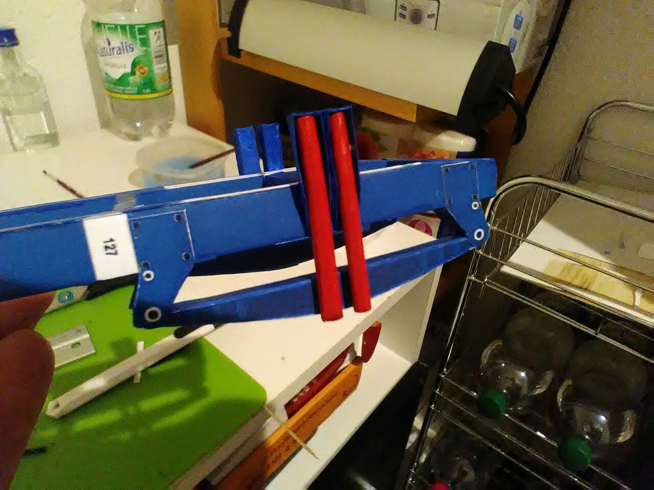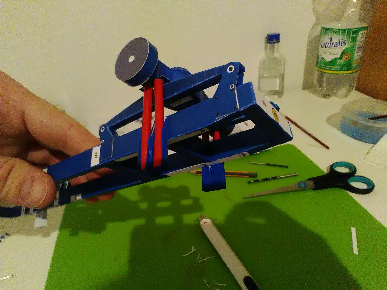 Всем здравствуйте! Пока у меня каникулы,работа идет тотальными темпами,в перерывах между бегатнёй с сыном и домашними делами. И так... Доделал передние рессоры,сделал крепления амортизаторов. Самих амортизаторов в выкройках не было,поэтому пришлось делать самому. Взял тетрадный лист,все расчертил,вырезал,потом взял сверло 3мм и скрутил трубочки, после трубочки окрашивал акрилом от Ревелл, после высыхания приклеил на свои места. Ну и приправил все это собрав задний мост.