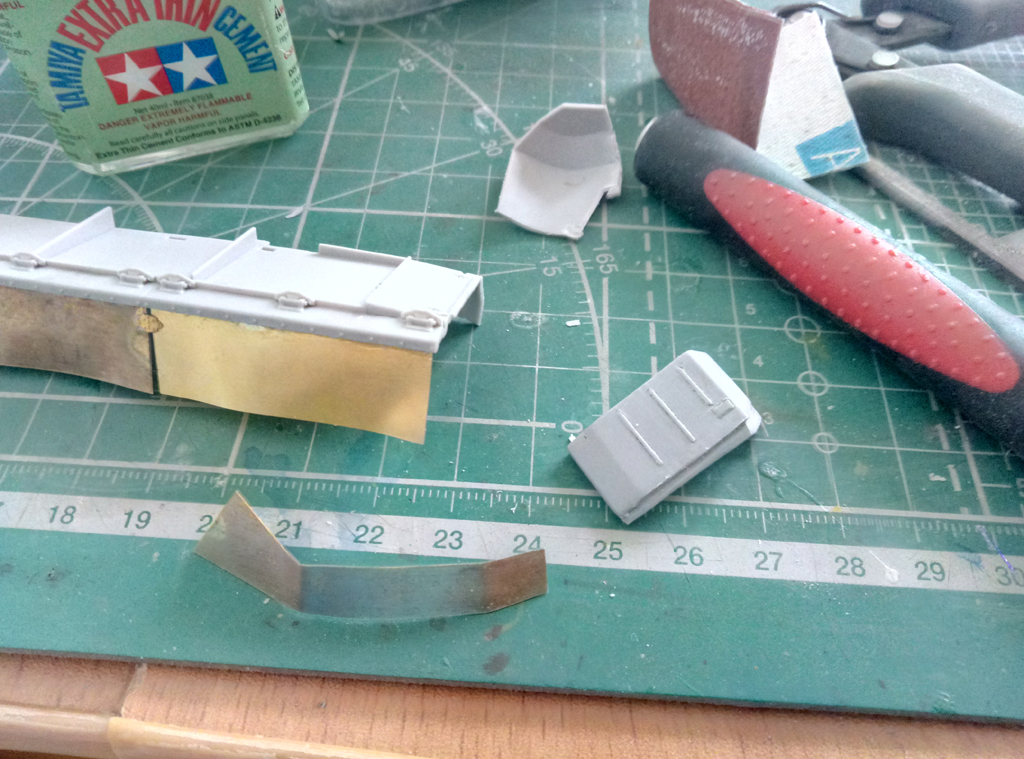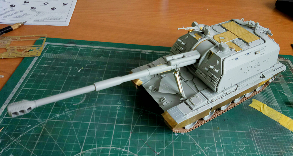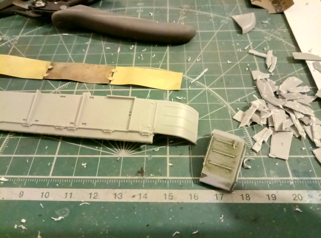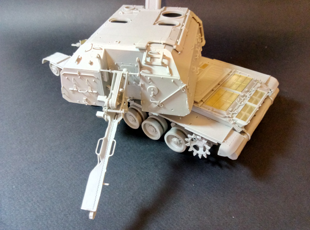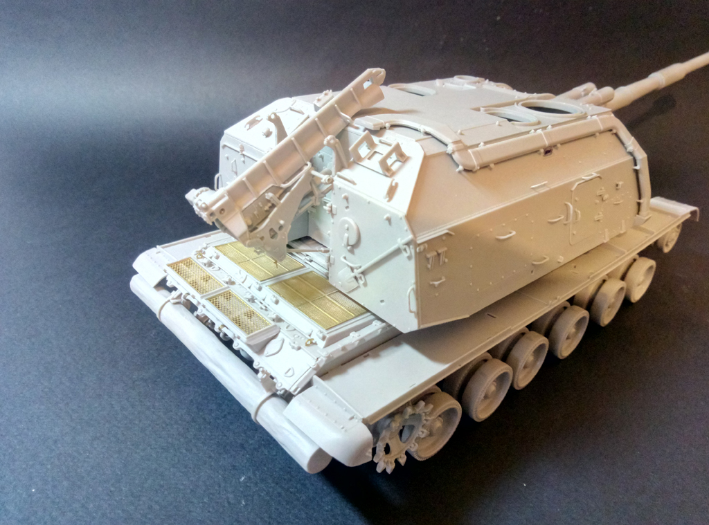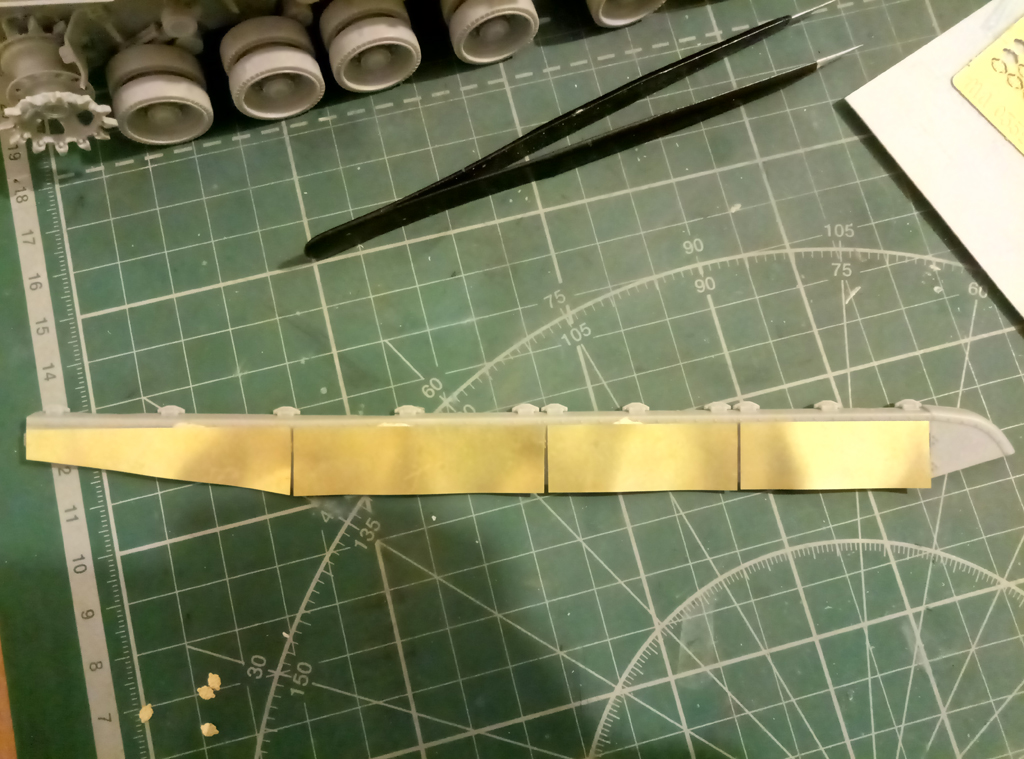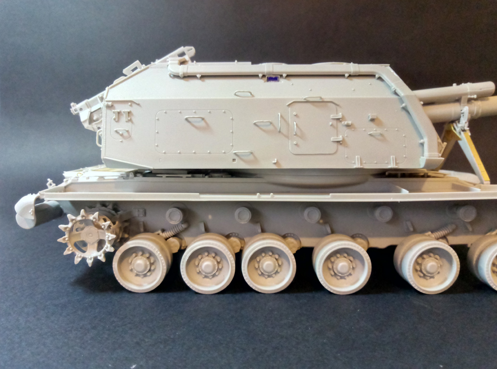 Доброго времени суток! Практически низ корпуса с ходовой (кроме гусениц) завершил. Первые впечатления о наборе - очень достойно. Конечно, с колесами пришлось повозиться, т.к. производитель решил сымитировать полоску по середине резинового бандажа, однако мне не понравилось и проблема была устранена, руки откровенно забились от шлифовки. Хочется добавить, что производитель по хлеще "Декстора" будет, если вы понимаете о чем я. Относительно много питателей к каждой детали, казалось бы, там где должен быть один - их два, где два - их четыре и так далее в прогрессии, особенно порадовали ведущие звёздочки с 8мью питателями. Заказал травление от "микродизайна", попробую сделать версию с резиновыми брызговиками на передних крыльях, в любом случае, если не получится, боковые "юбки" пойдут точно под травление.