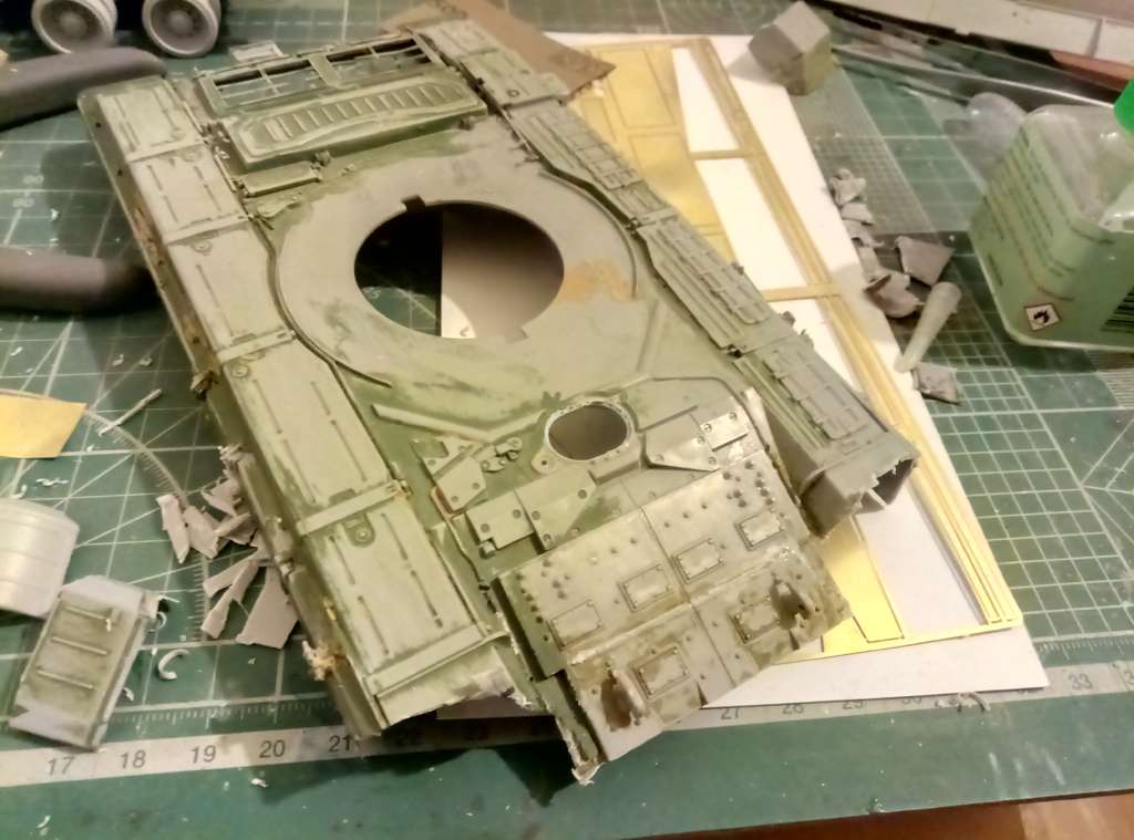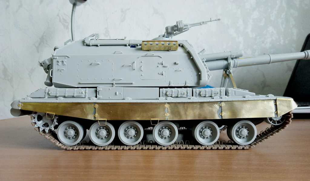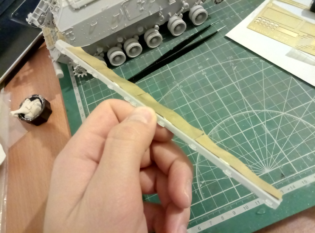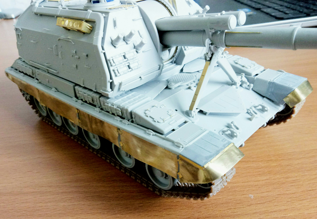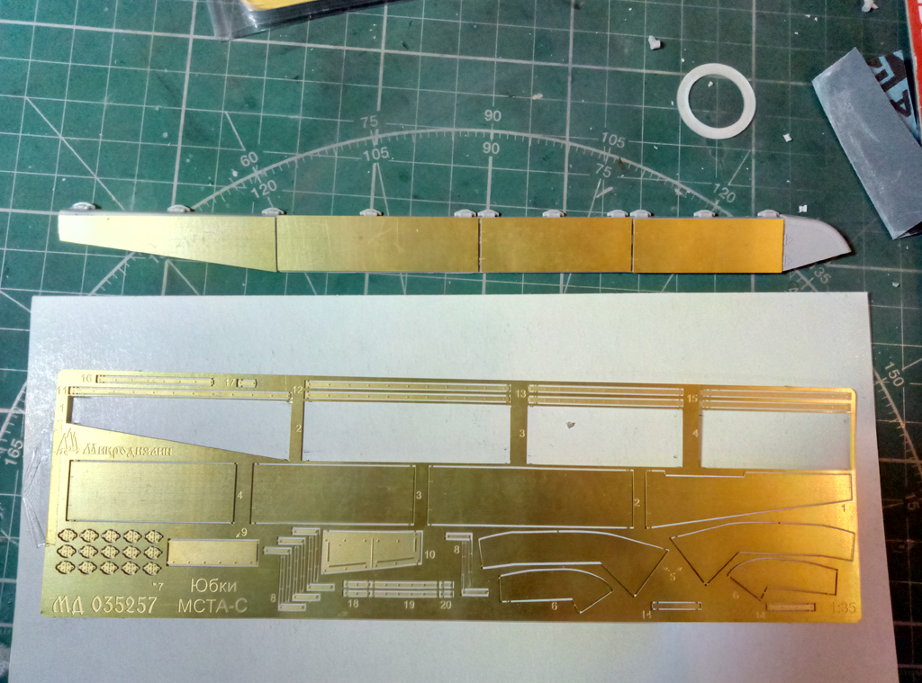 Доброго времени суток, после длительного перерыва наконец-то взялся за дело. За это время произошло много событий, поэтому кратко: фототравление от "микродизайна" был получен, первый почтовый конверт оказался с недостаточным количеством петель между "юбками", после должного письма допечатали и прислали опять полный набор уже с нужным количеством петель без каких либо доплат и лишних разговоров! Молодцы, огромное спасибо "Микродизайну" за должное внимание и поддержку, а мое замечание наверняка исправило последующие листы травления по этому поводу (еще в конце 17-го все происходило). Но не забывайте, что данный дополнительный комплект для "Звезды", поэтому по мне так пришлось немного попотеть и достать передние "козырьки" от брызговиков от стороннего набора, таким явился донором Т-90 от той же "Звезды". В целом почти собрано, остались штрихи и можно грунтовать.