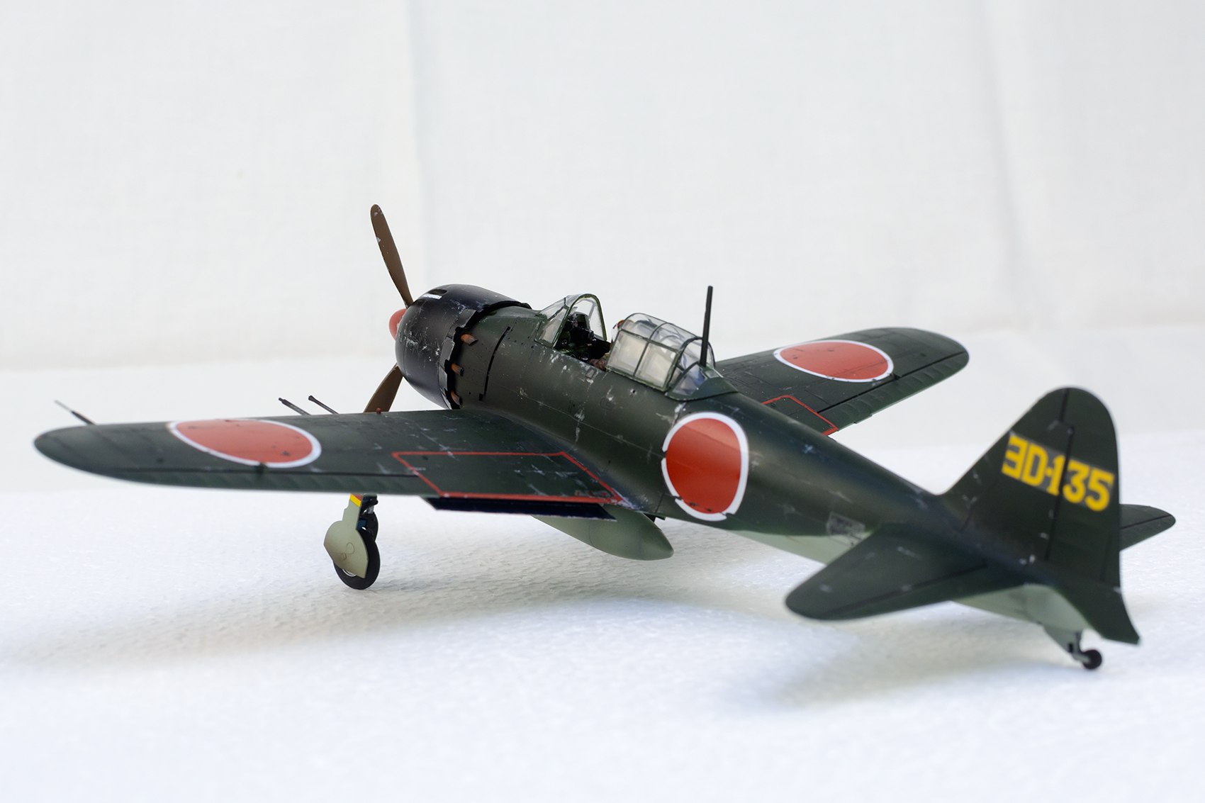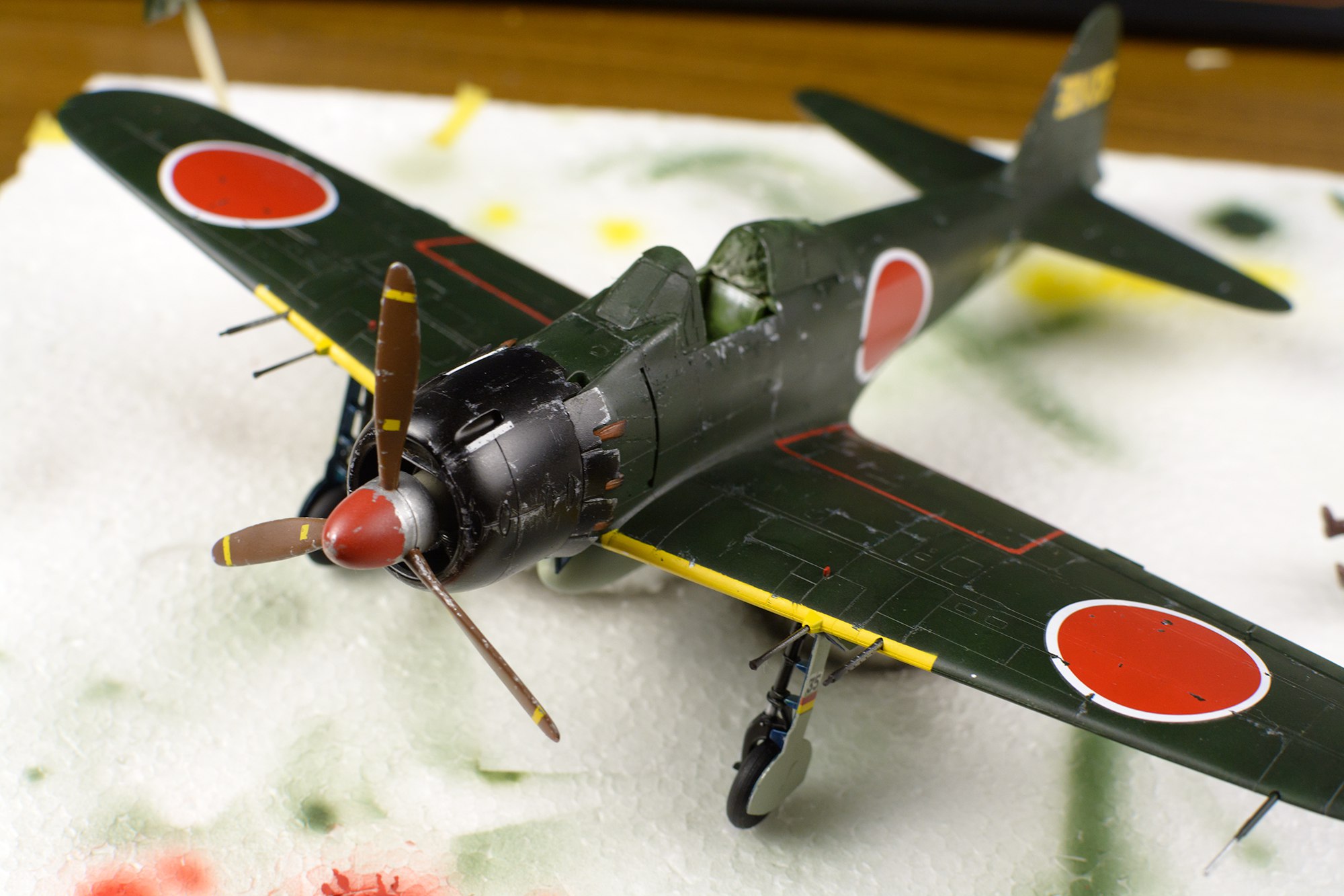 Чуть поправил положение, содрав уродскую мелочь и накрасив вместо нее аэром. Приготовил пушки и пулеметы. Осталось дело за малым, смывка и копоть от пороха и выхлопа, приклеить оружие, антенну, двигло и капот. Хиномару только подрал, все таки декальки за ночь присели, зубочисткой потом по расшивке неплохо продавились. Пройдусь по белому тамиевской дарк-браун смывкой, думаю выйдет неплохо. Один черт широкой ленты для масок и циркуля нет.