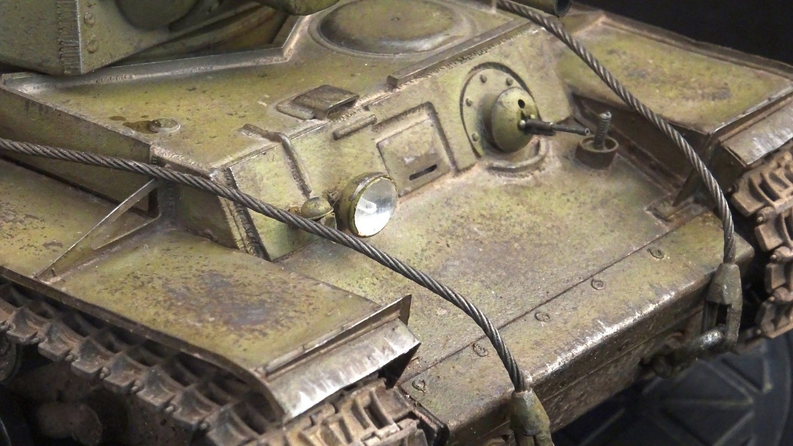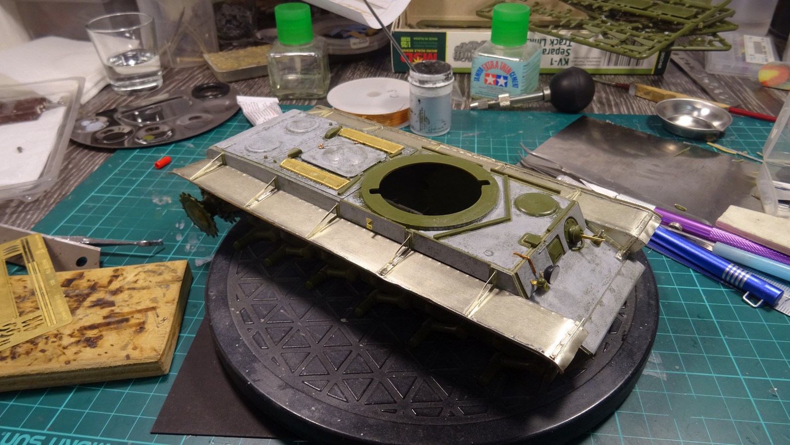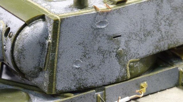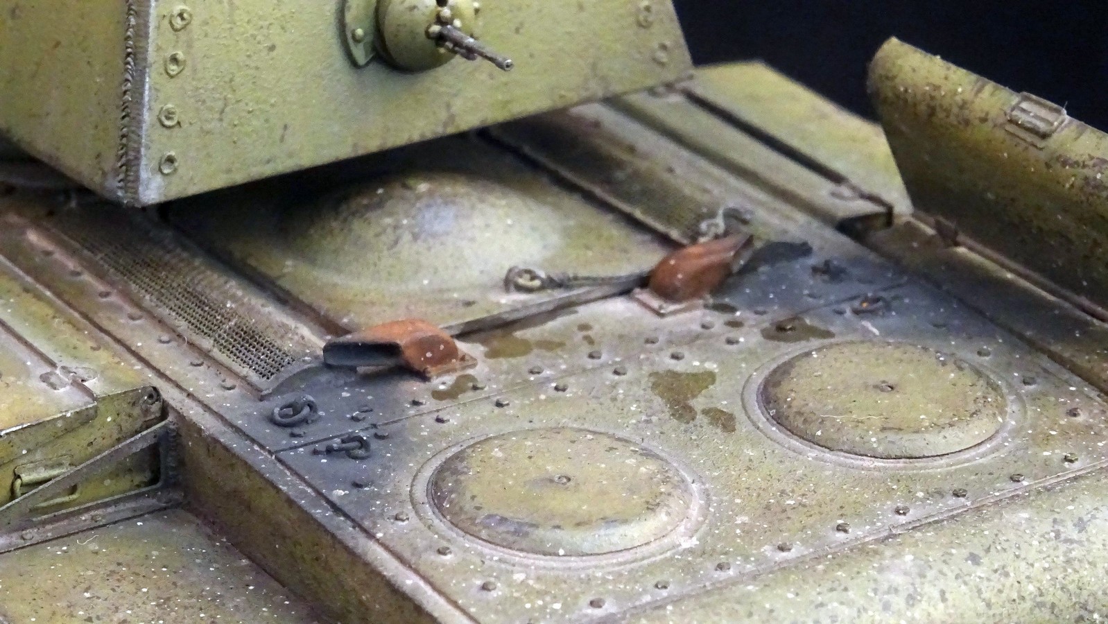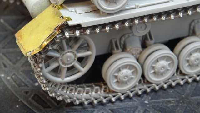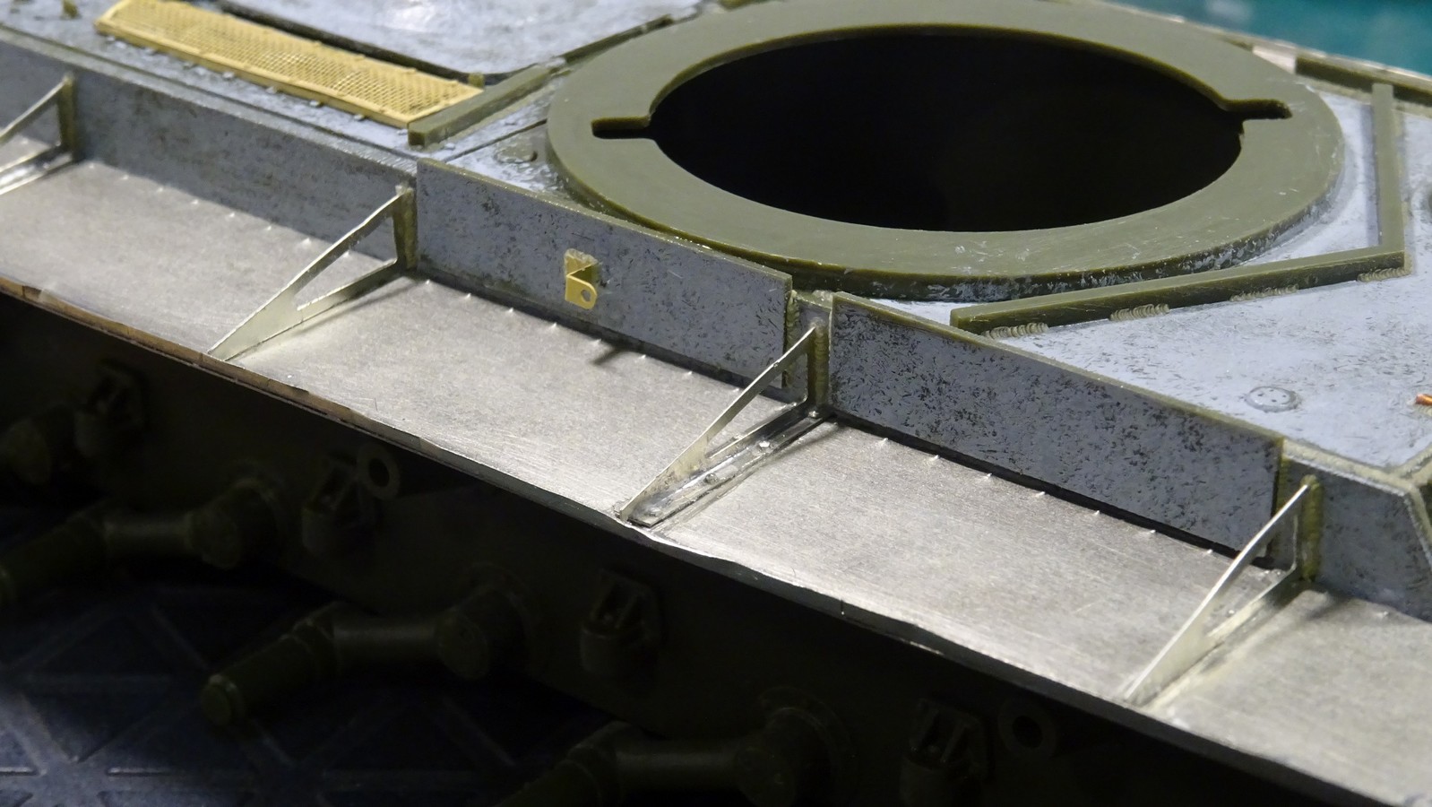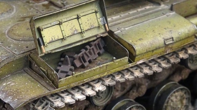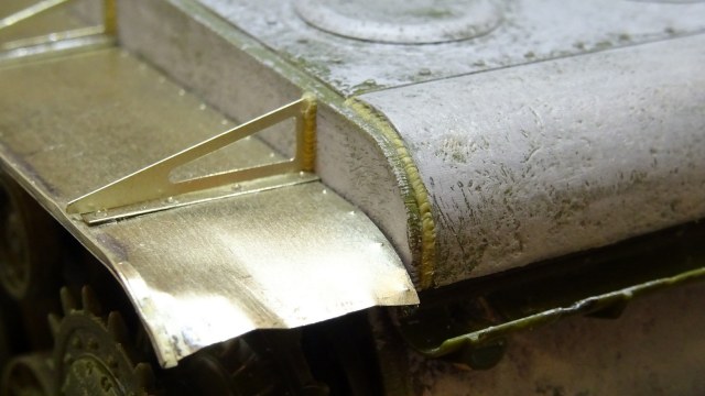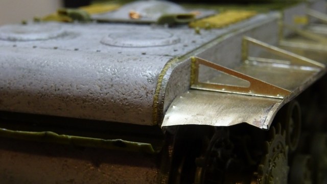 С помощью модельной шпатлевки была сымитирована структура катаной брони. Надгусенечные полки заменены на металлические, в таком виде они имеют более натуральную толщину, и на них легче изобразить следы эксплуатации и дефекты.