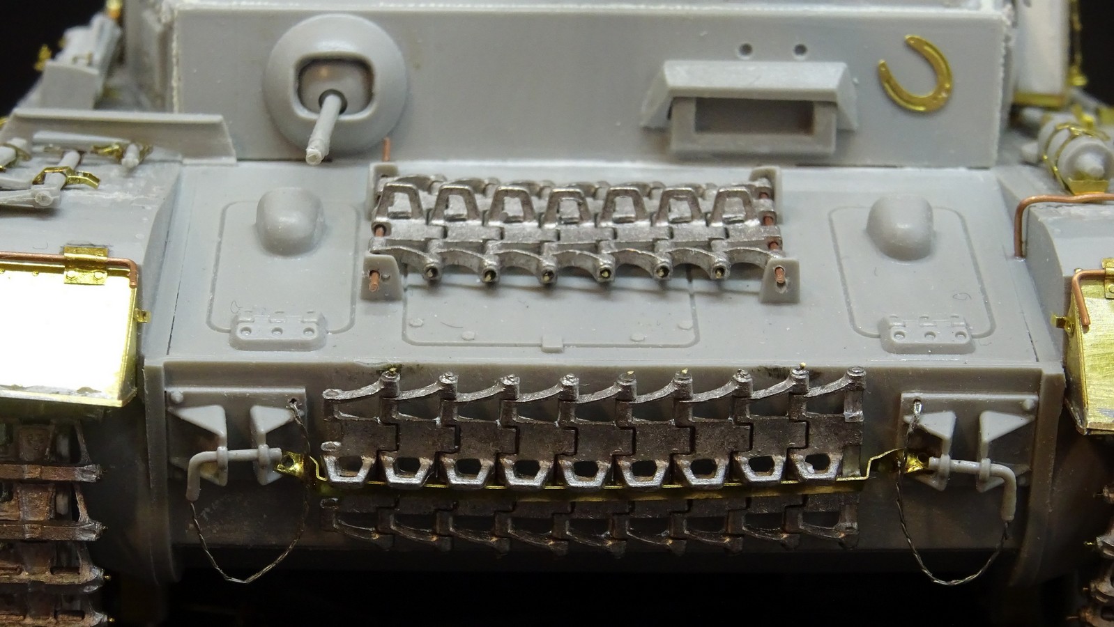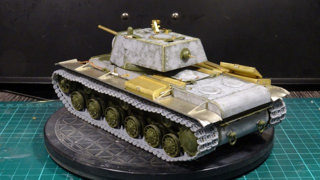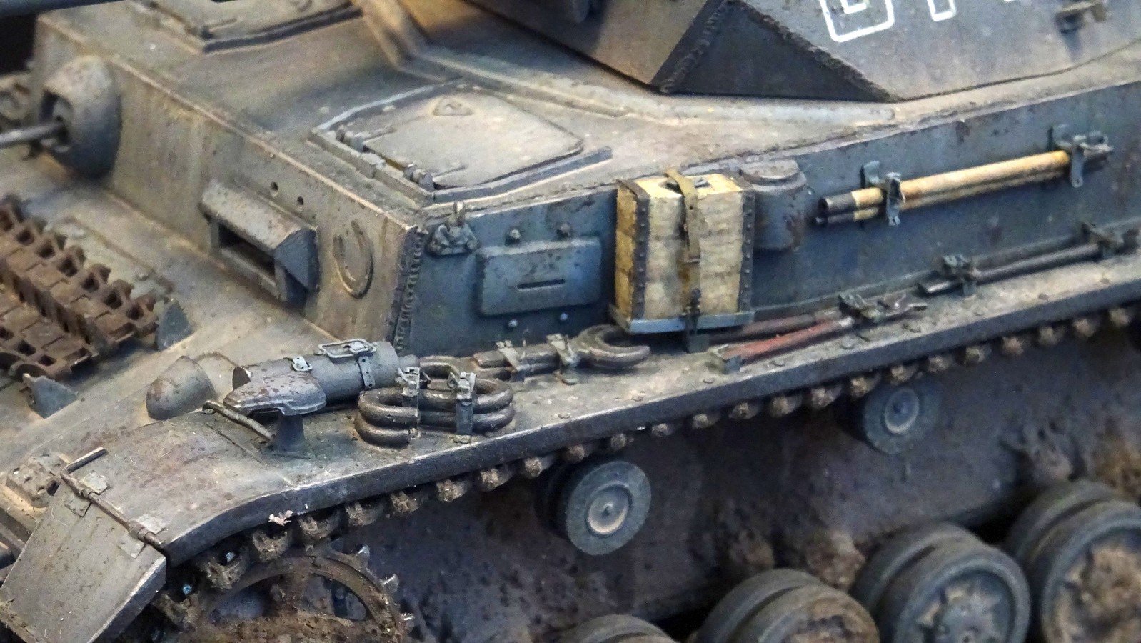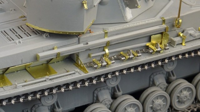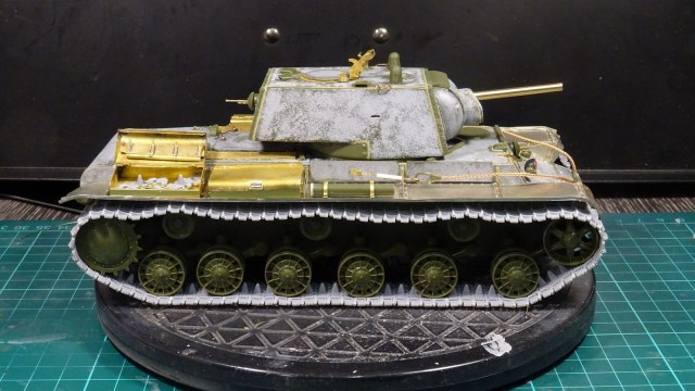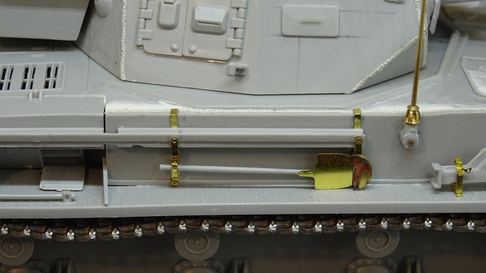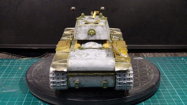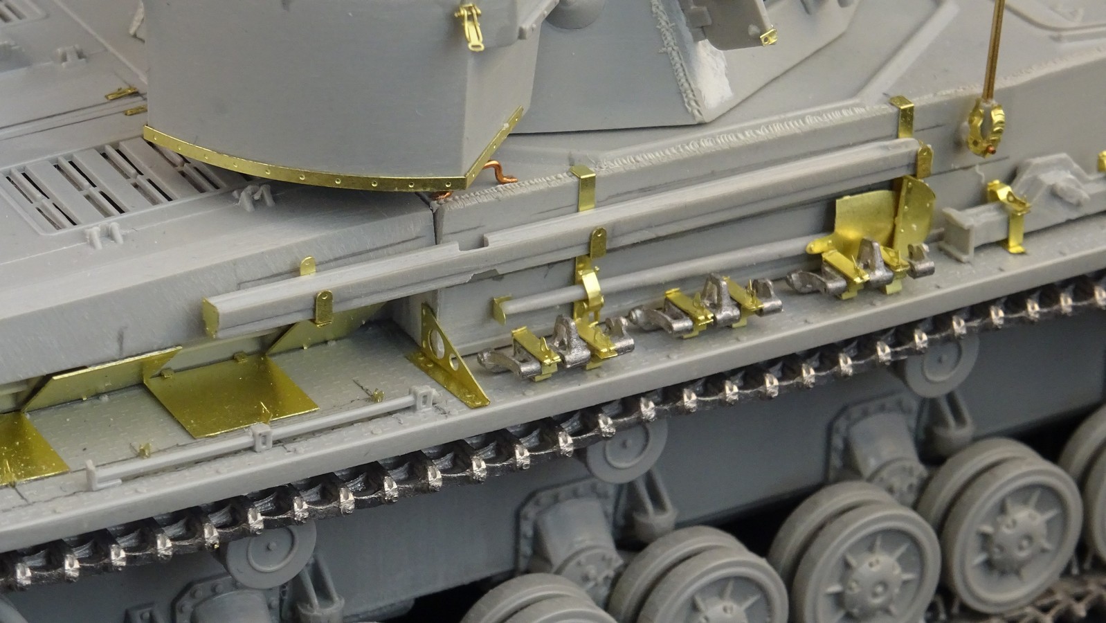С помощью модельной шпатлевки была сымитирована структура катаной брони. Надгусенечные полки заменены на металлические, в таком виде они имеют более натуральную толщину, и на них легче изобразить следы эксплуатации и дефекты.
