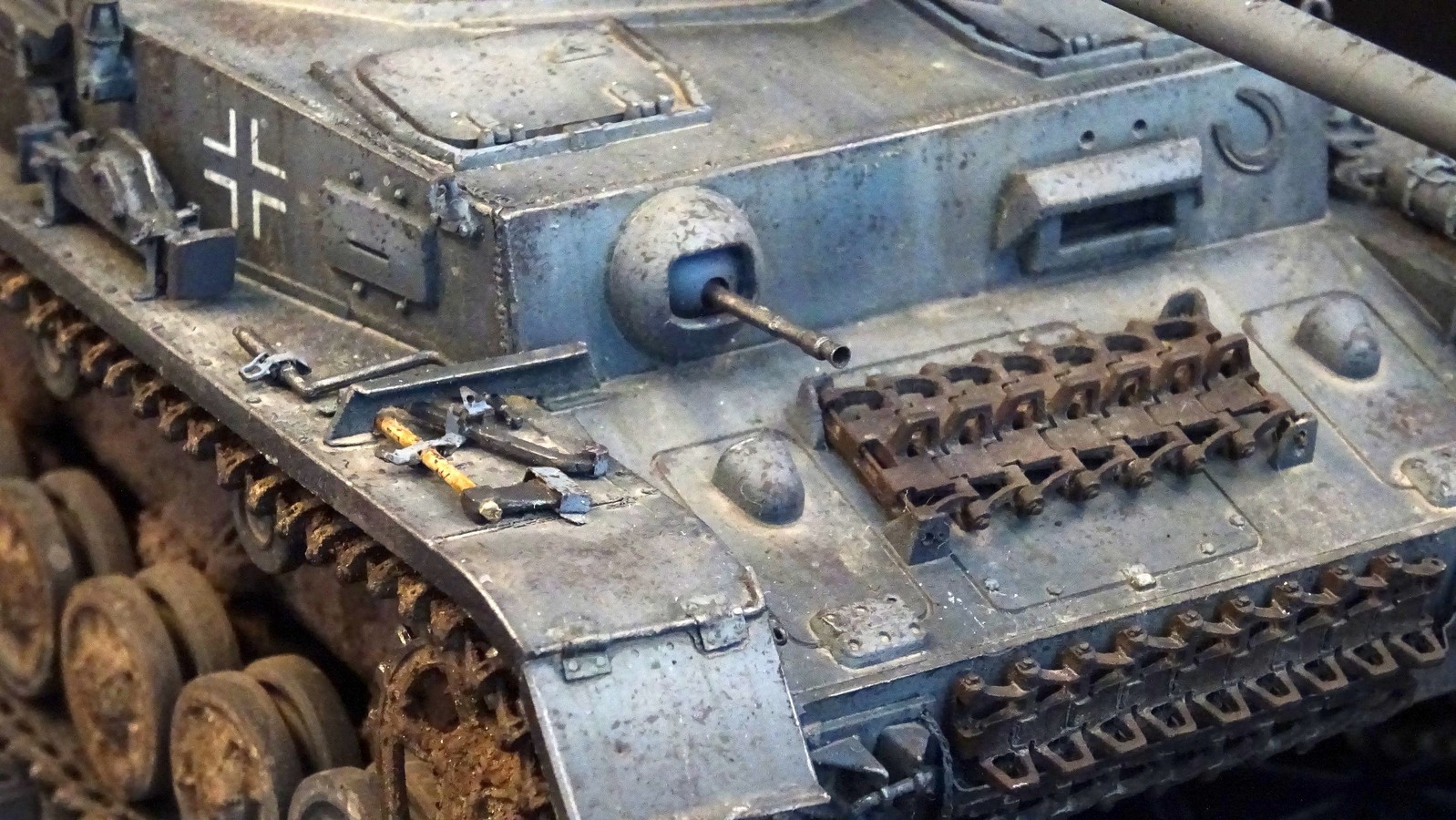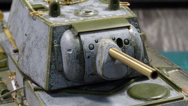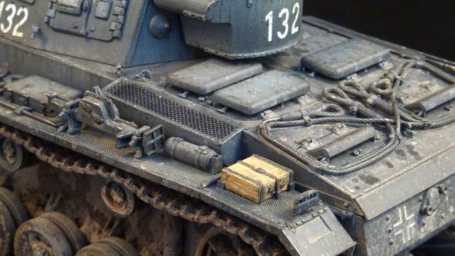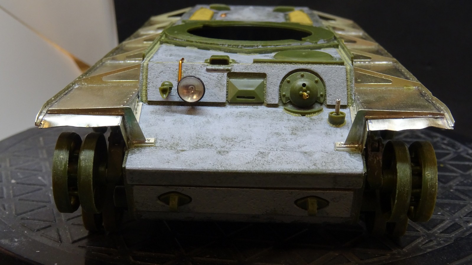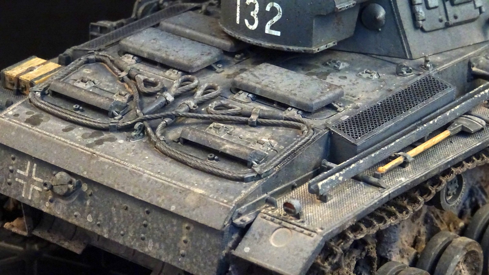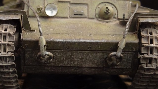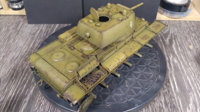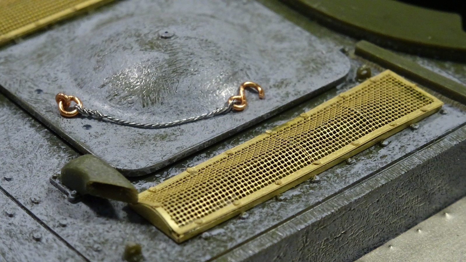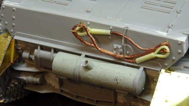 С помощью модельной шпатлевки была сымитирована структура катаной брони. Надгусенечные полки заменены на металлические, в таком виде они имеют более натуральную толщину, и на них легче изобразить следы эксплуатации и дефекты.