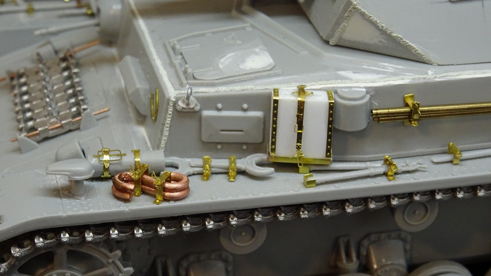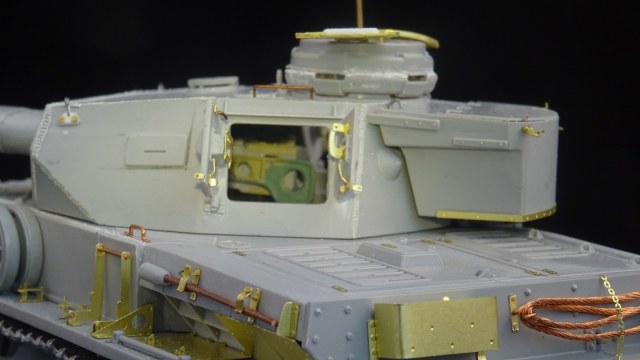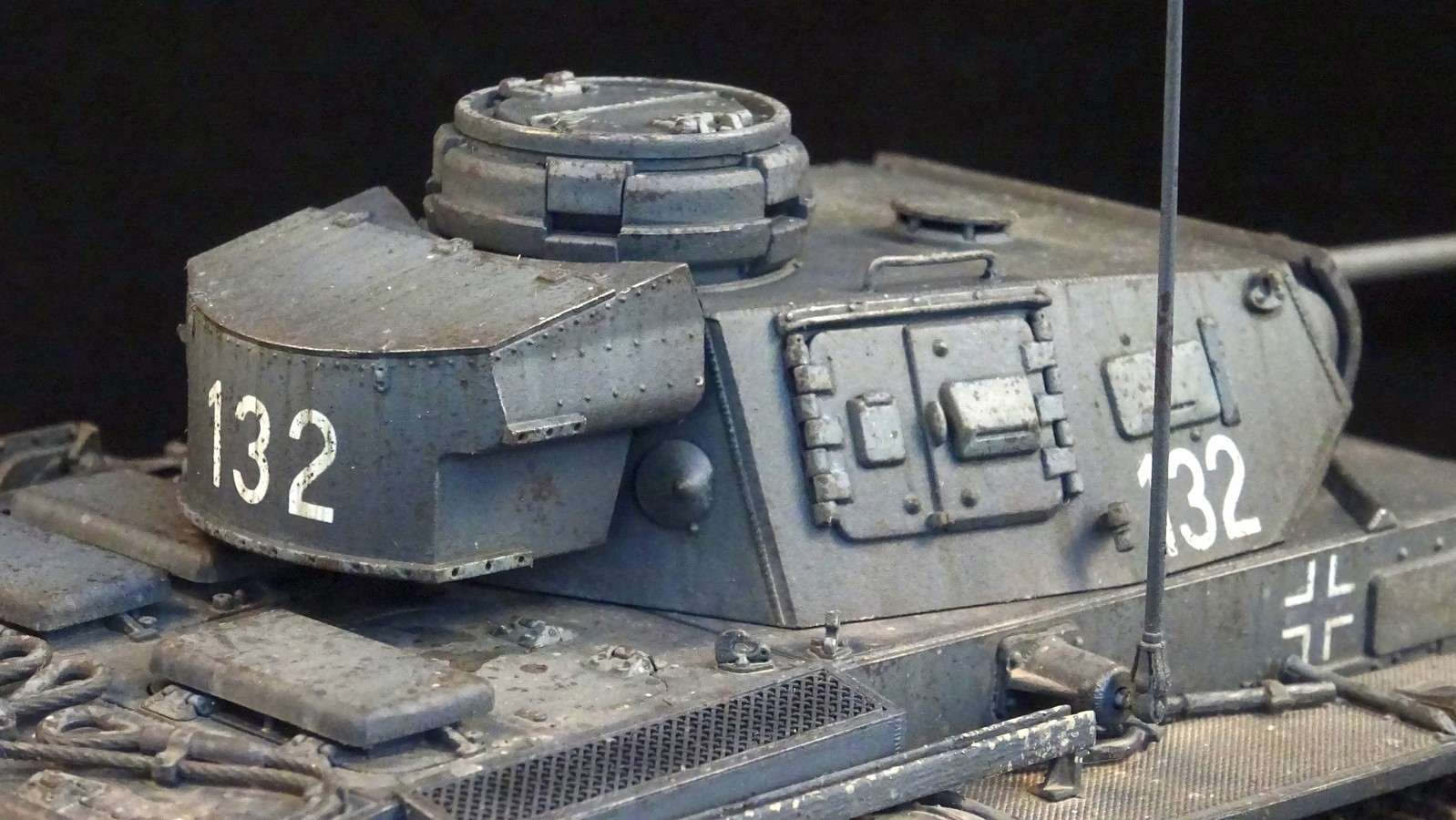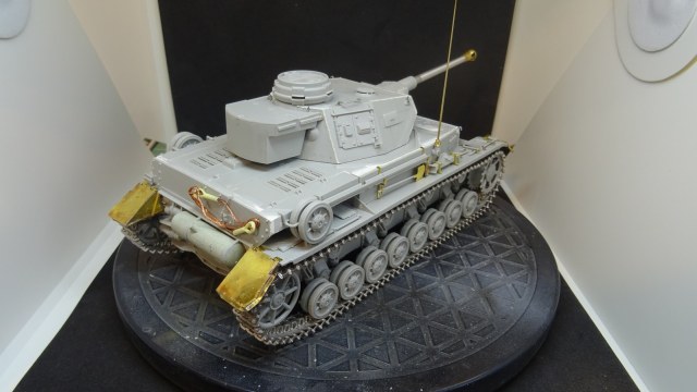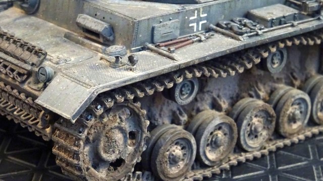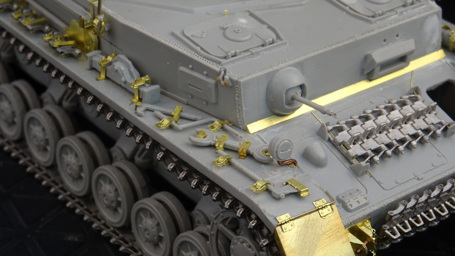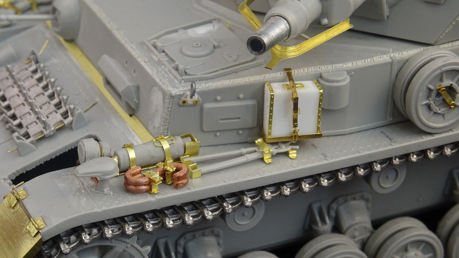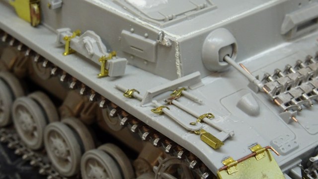 С помощью модельной шпатлевки была сымитирована структура катаной брони. Надгусенечные полки заменены на металлические, в таком виде они имеют более натуральную толщину, и на них легче изобразить следы эксплуатации и дефекты.