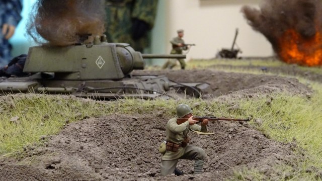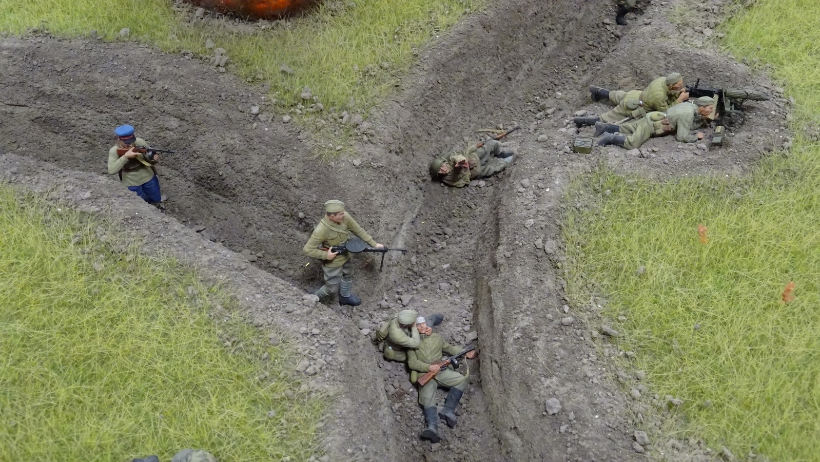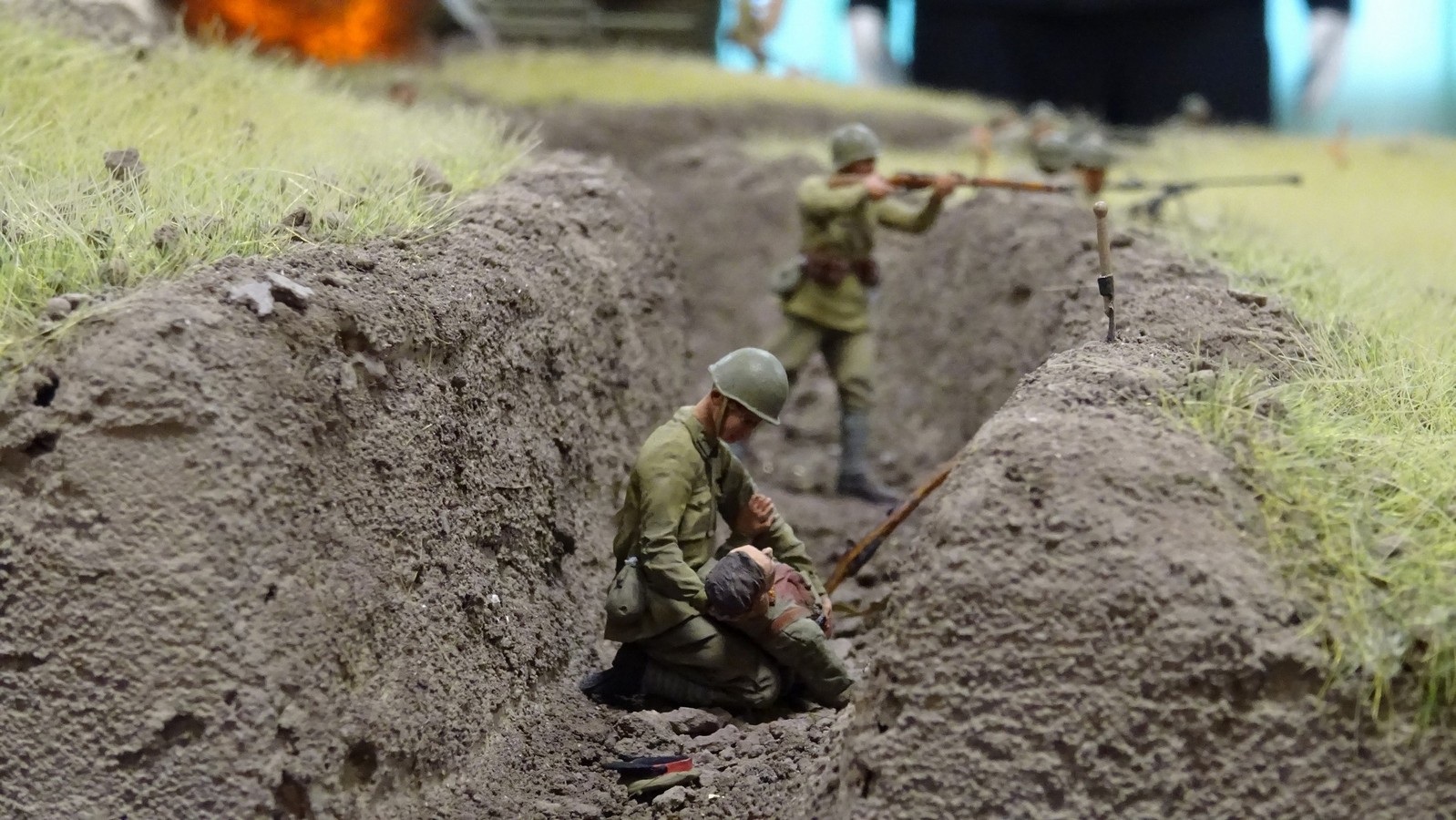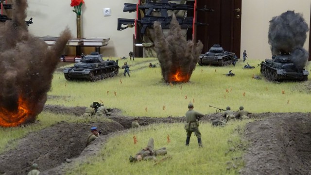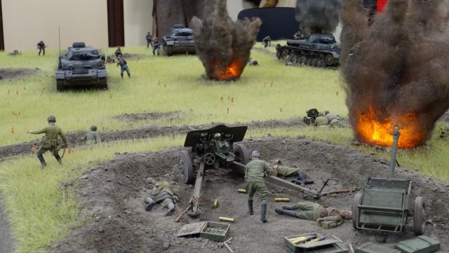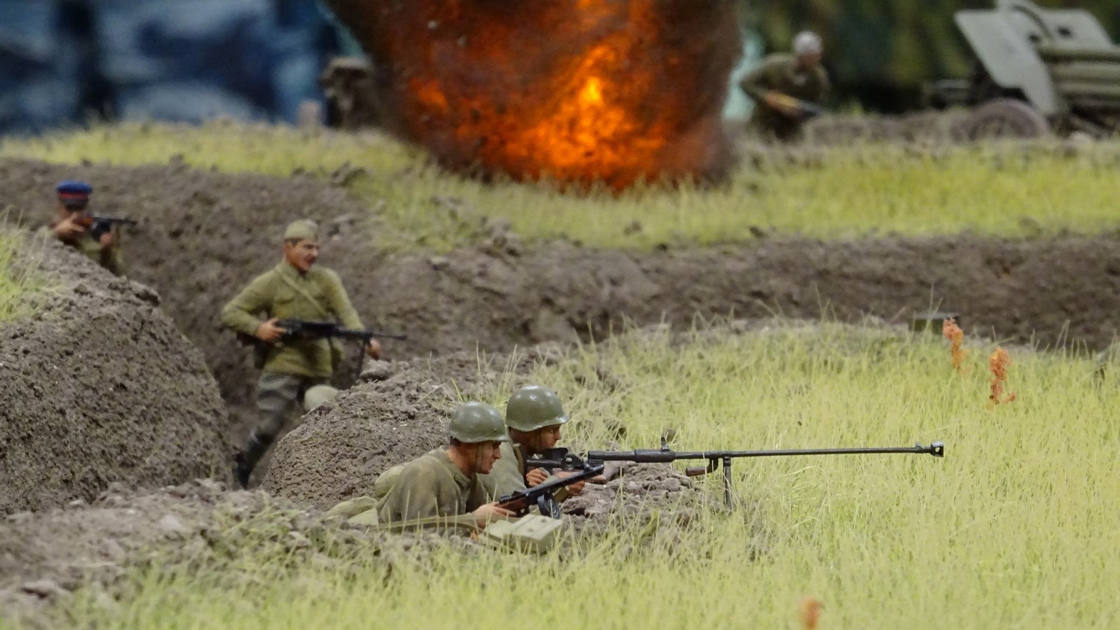 По нашему замыслу на диораме советские войска отражают атаки немецких войск и на текущий момент уже понесли тяжелые потери...