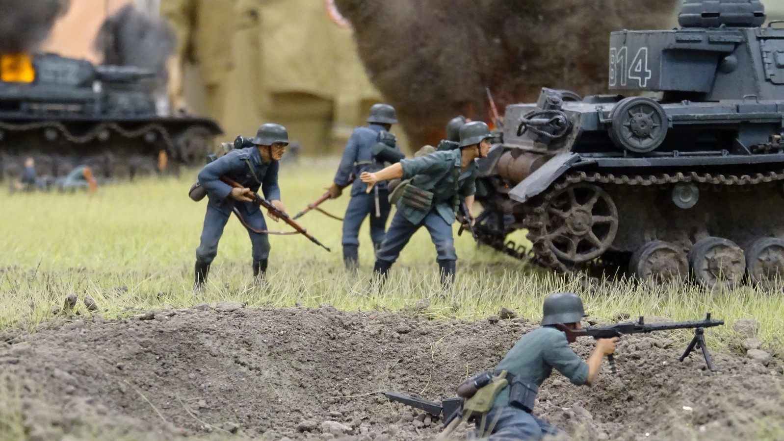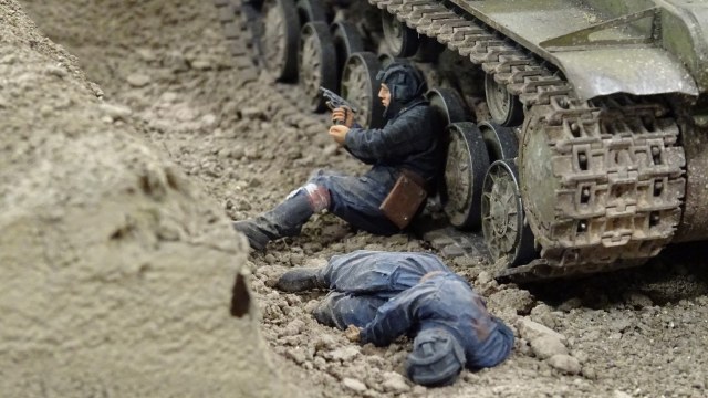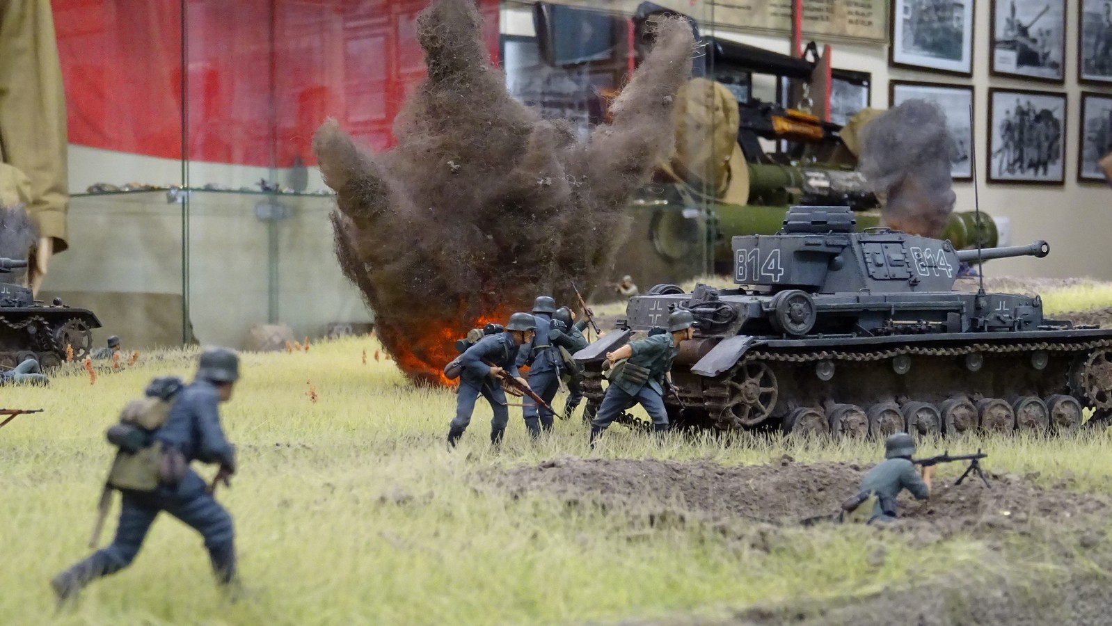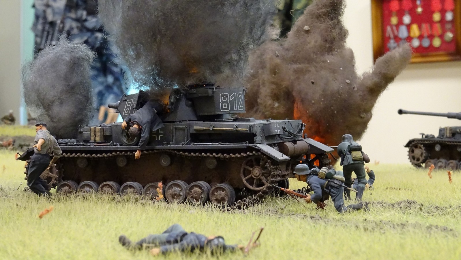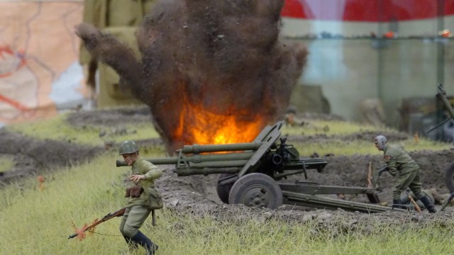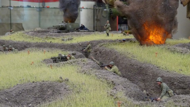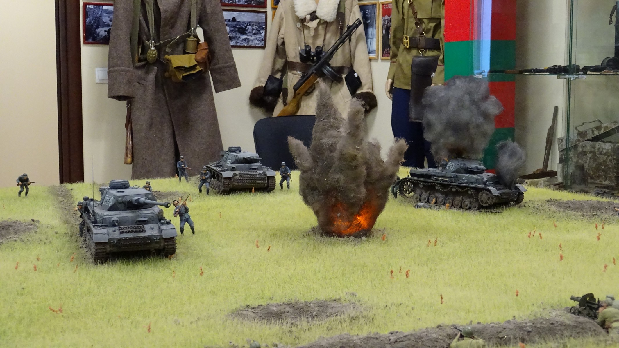 По нашему замыслу на диораме советские войска отражают атаки немецких войск и на текущий момент уже понесли тяжелые потери...