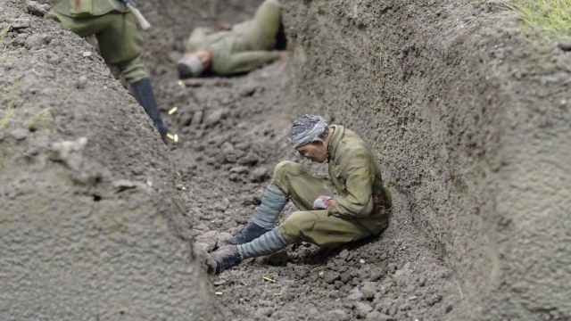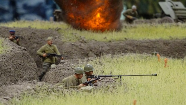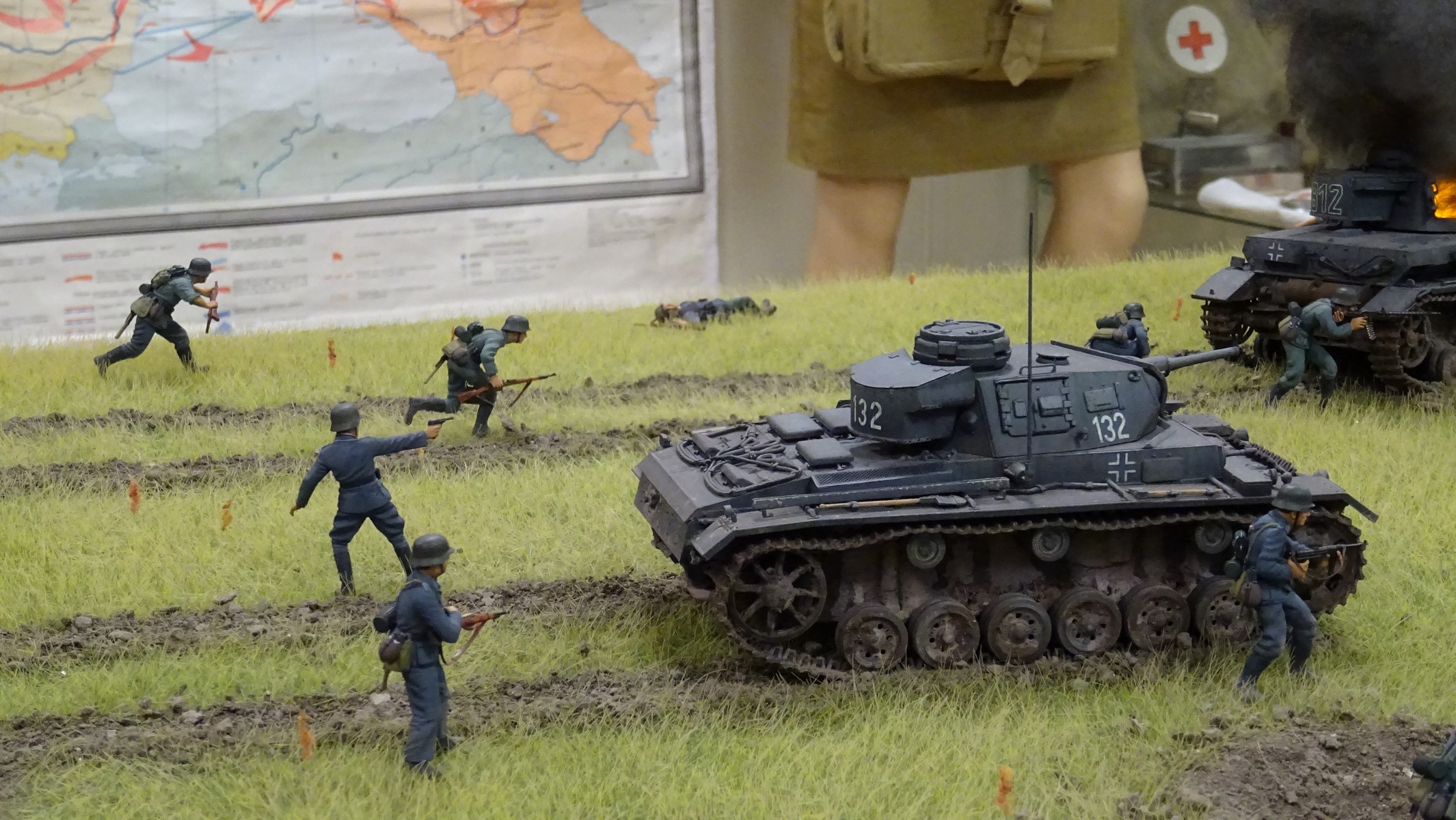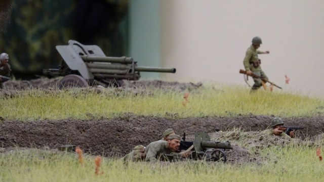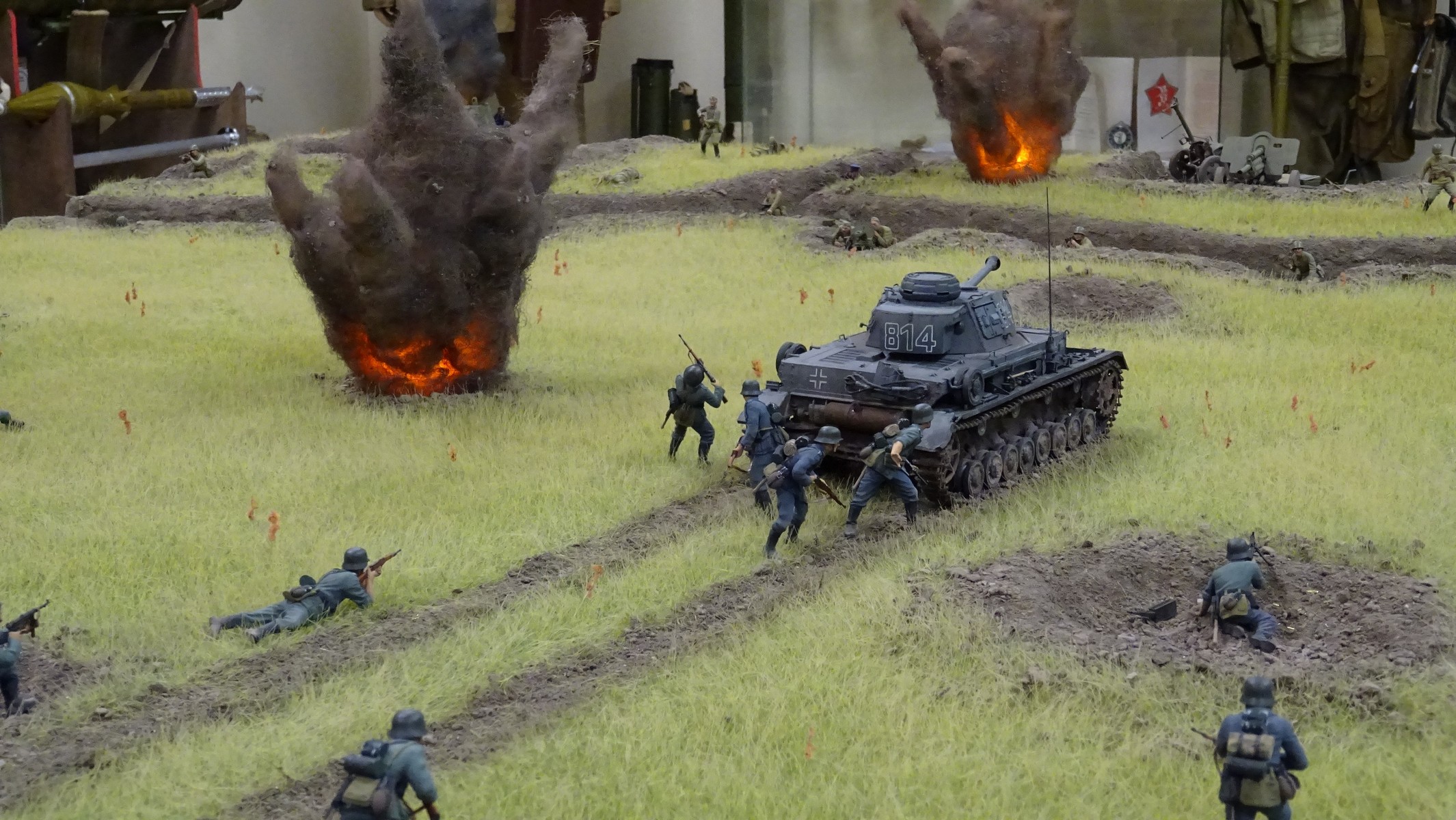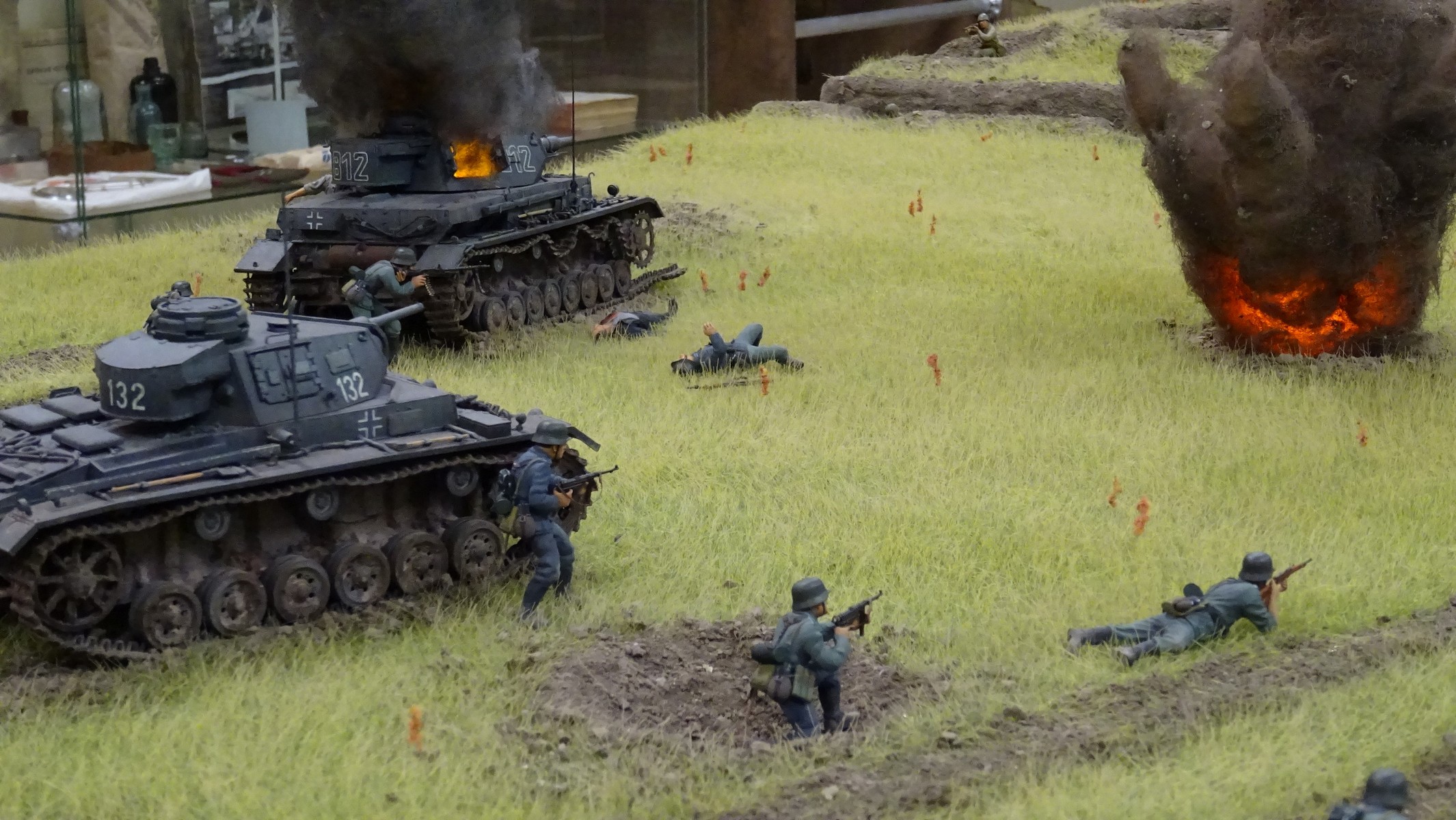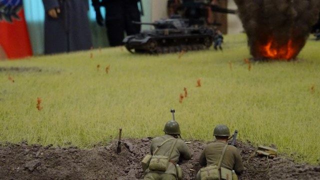 По нашему замыслу на диораме советские войска отражают атаки немецких войск и на текущий момент уже понесли тяжелые потери...