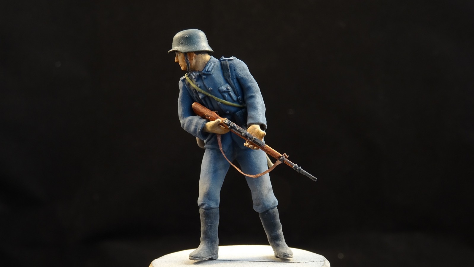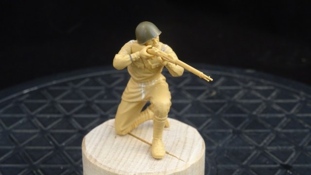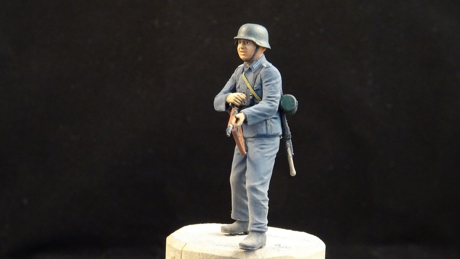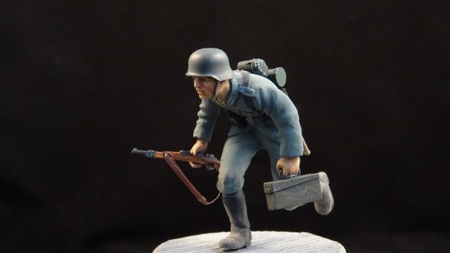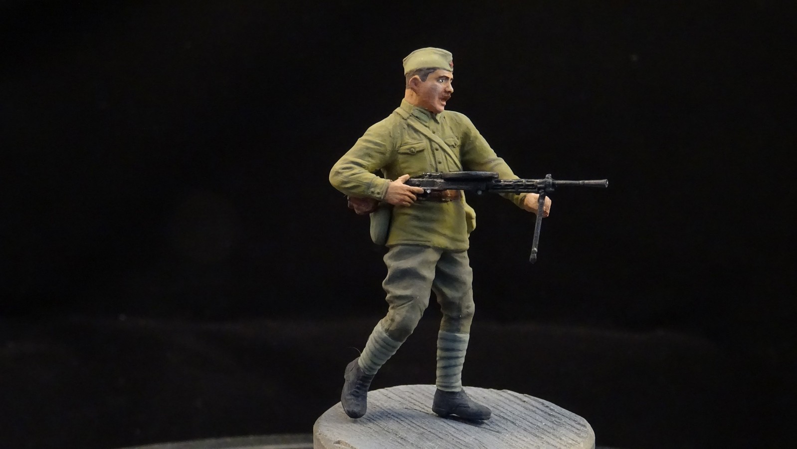 Сначала миниатюра покрывалась базовым слоем краски, раскрашивалась форма, снаряжение и лицо.