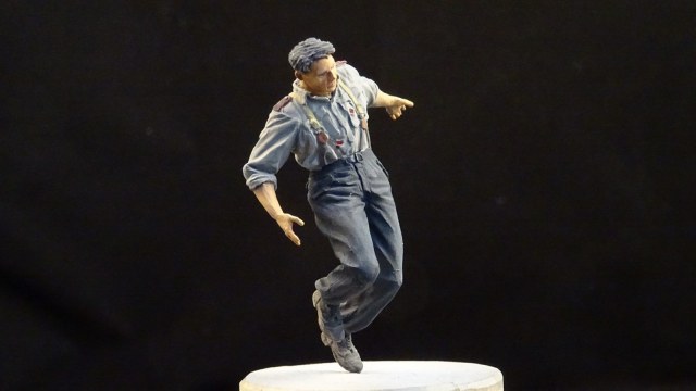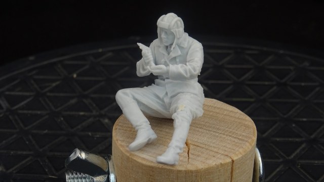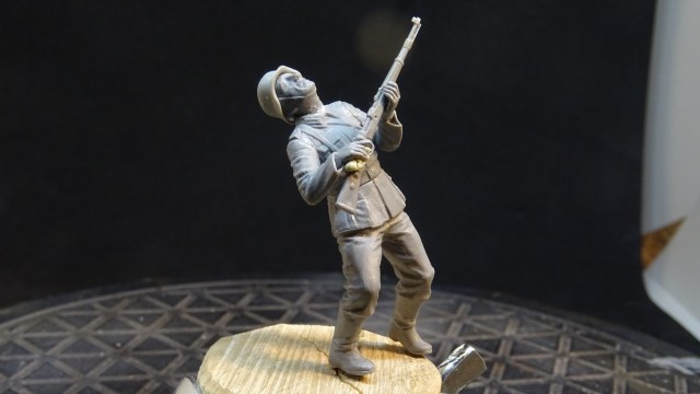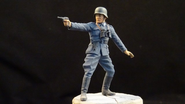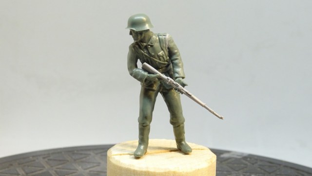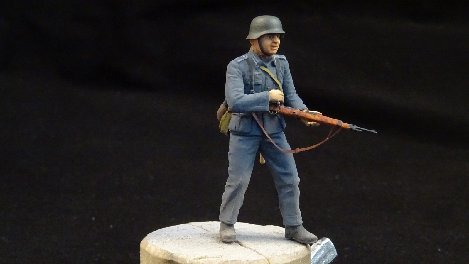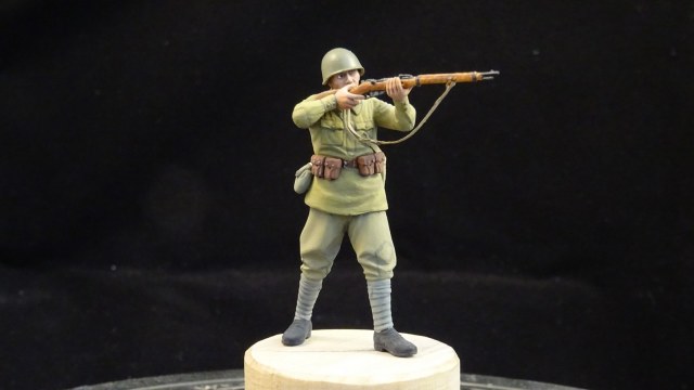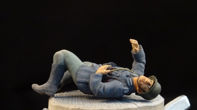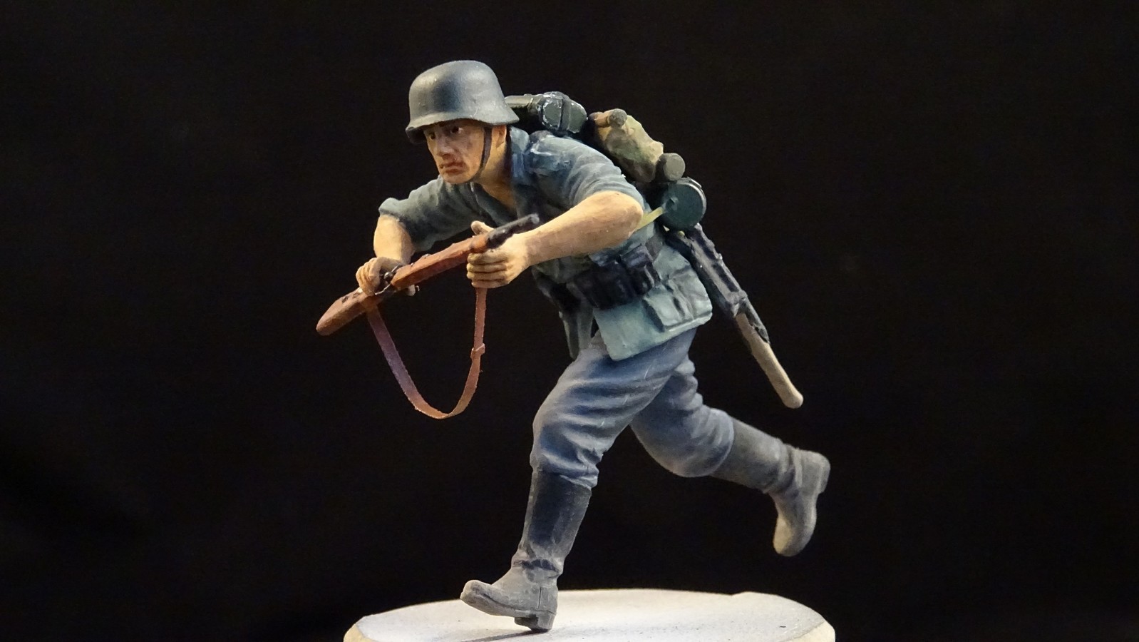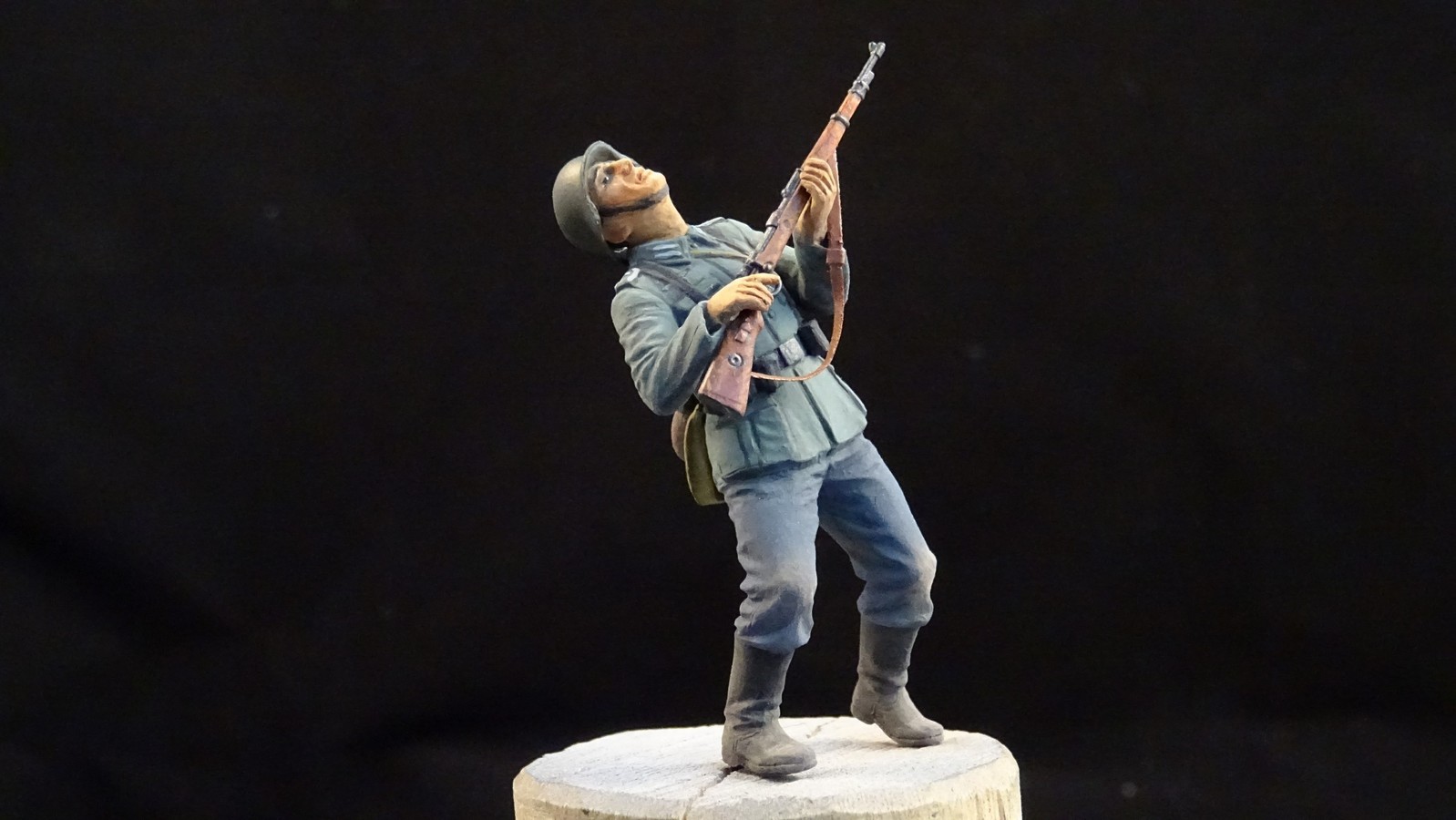 Сначала миниатюра покрывалась базовым слоем краски, раскрашивалась форма, снаряжение и лицо.