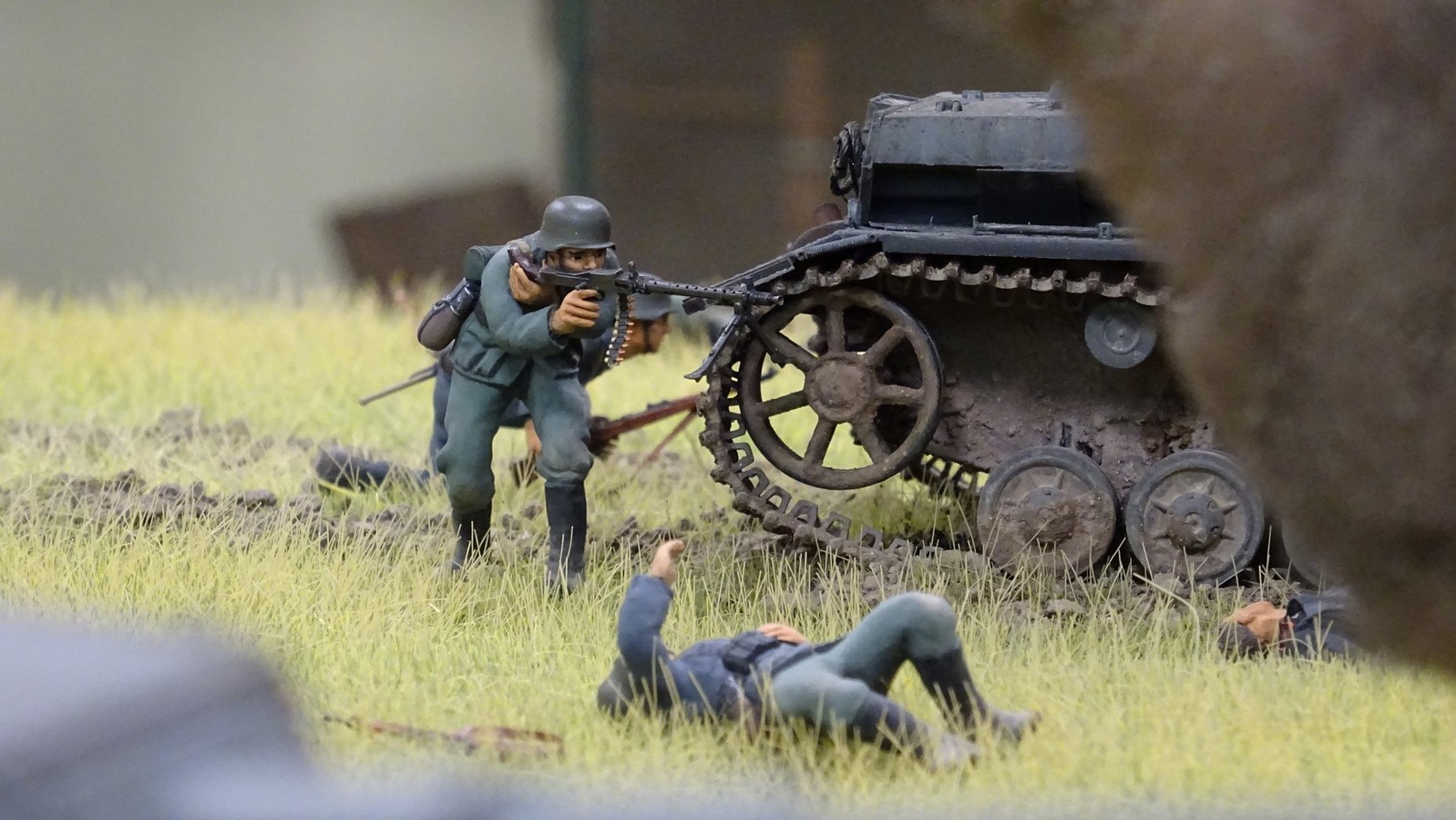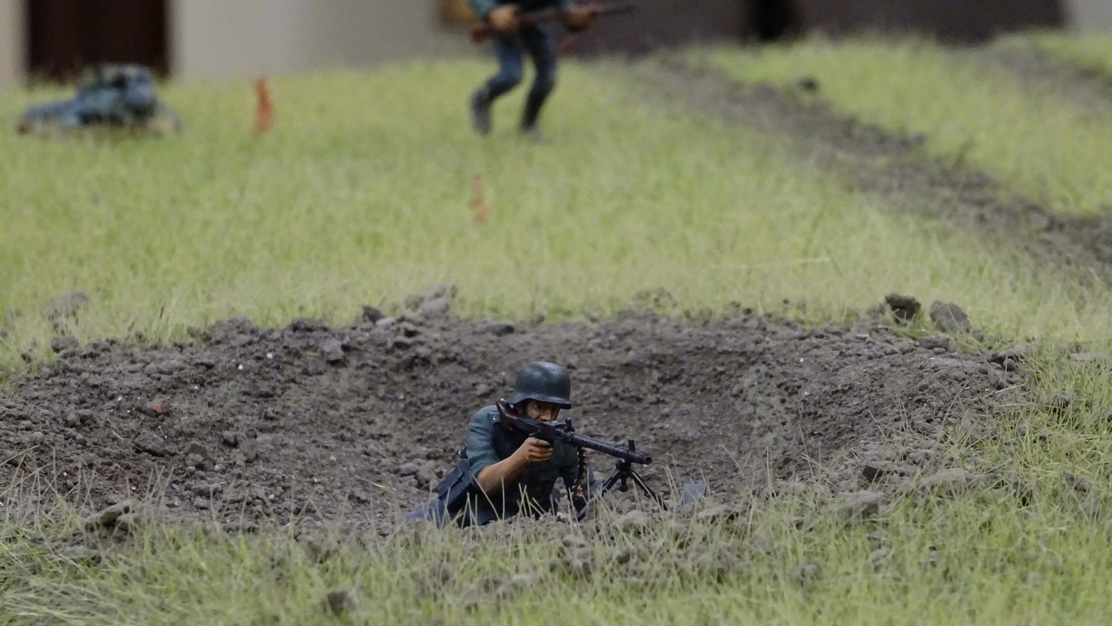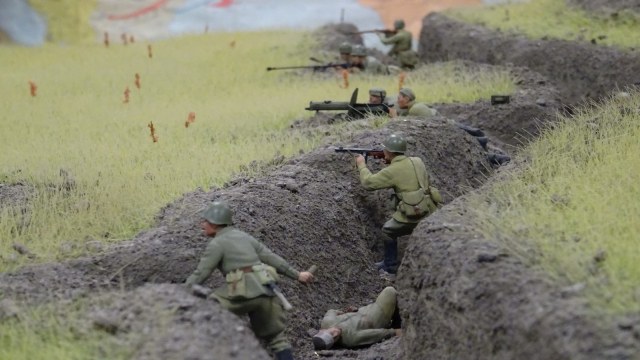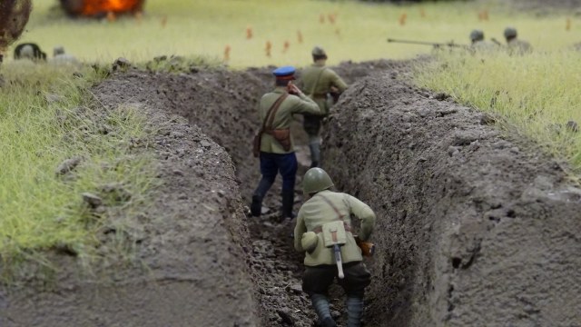 Ну последнее что было сделано, посажены метелки конского щавеля, расставлены фигуры солдат (правда с лежачими сильно намучились...) и набросали гильз из проволоки...