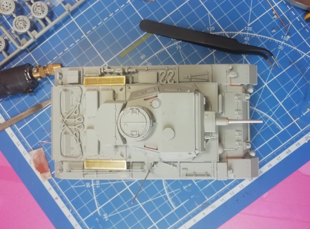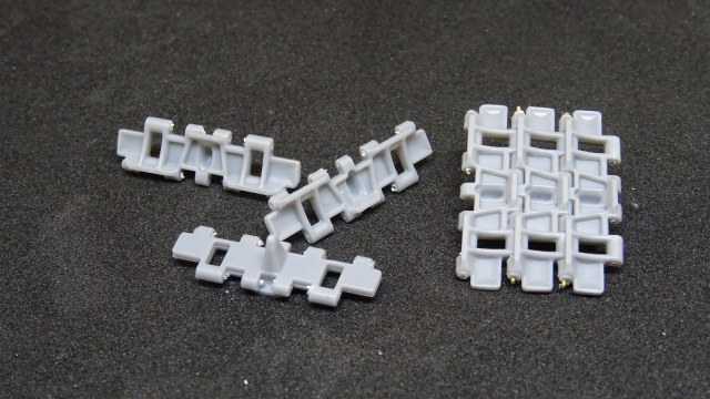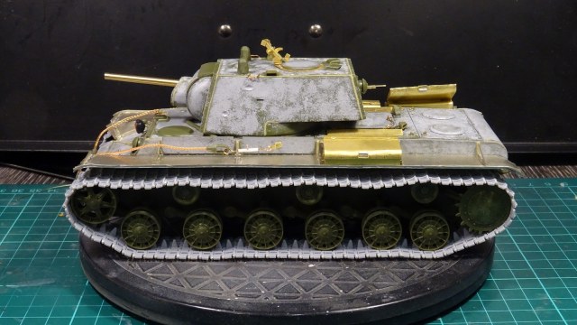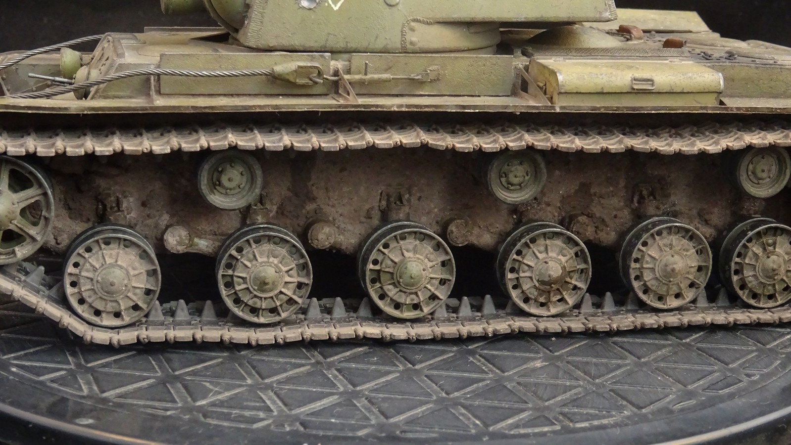 Родные гусеницы были заменены на новые, для того чтобы сделать их рабочими, пришлось каждый из 172 траков (количество взял из Википедии, т.к. сколько их реально было, я забыл) высверливать с двух сторон сверлом 0,45 мм, после чего соединять их проволокой.