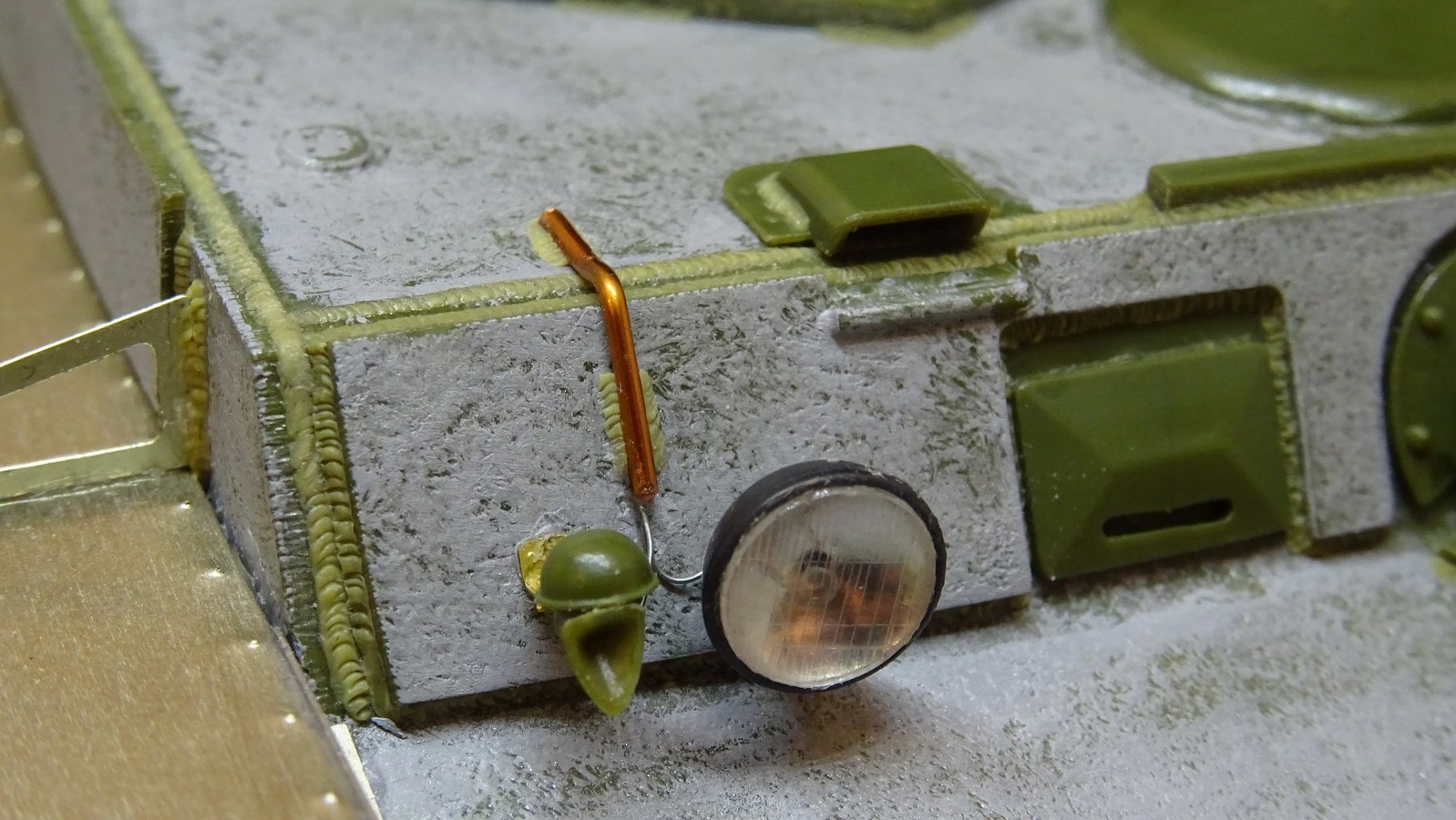 С помощью двухкомпонентной шпатлевки сымитированы сварные швы. Фара заменена на более реалистичную, проволокой изображен кабель для фары и клаксона.