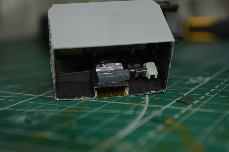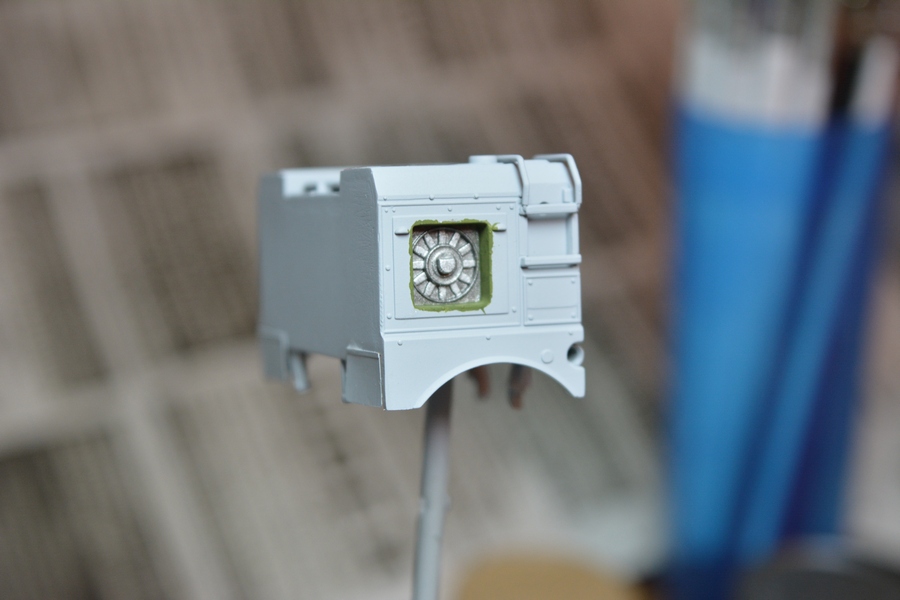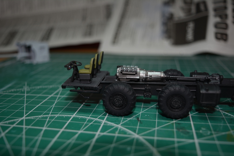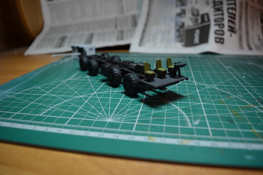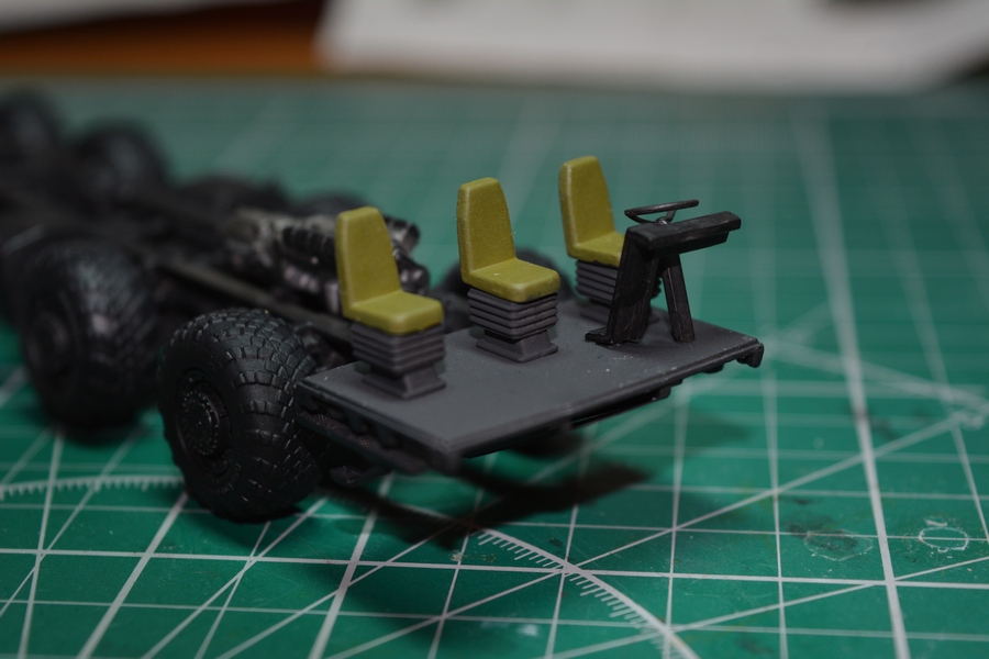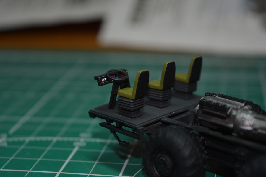 Начал потихоньку собирать оборудование кабины. Сделал руль, приборную панель и кресла расчета. На приборной панели изобразил приборы и контрольные лампочки. Сымитировал стекло панели приборов глянцевым лаком. Кресла расчета в реальноси затянуты черным кожзамом и черной тканью в крапинку, но на них имеются хэбэшные чехлы защитного цвета. Поэтому кресла покрашены в защитный цвет (кроме тыльной стороны спинки кресла). Огрехи покраски которые стали видны при фотографировании устранил.