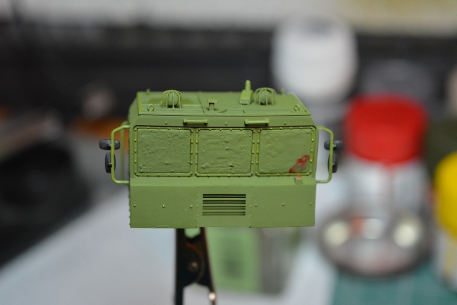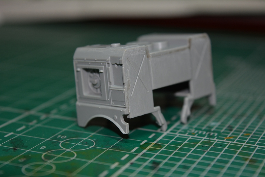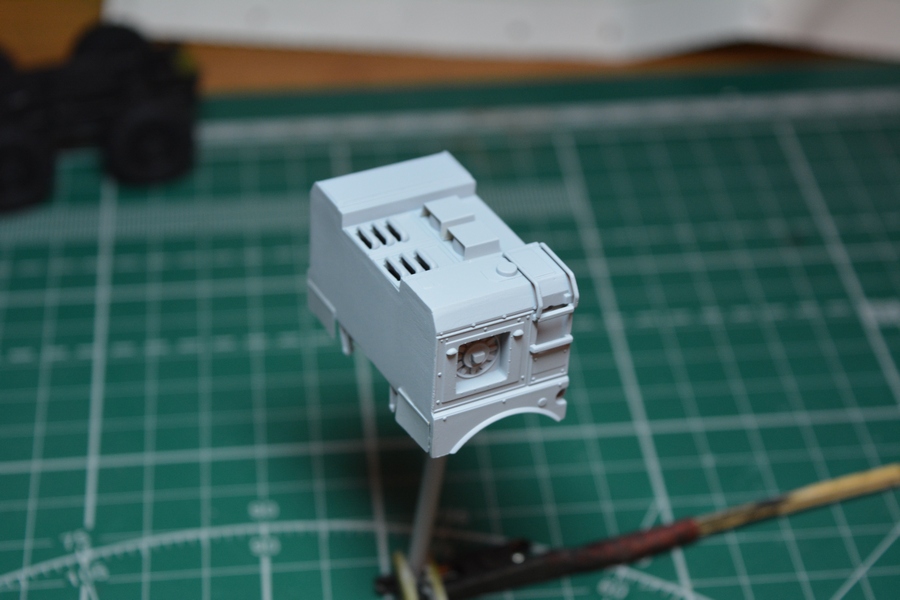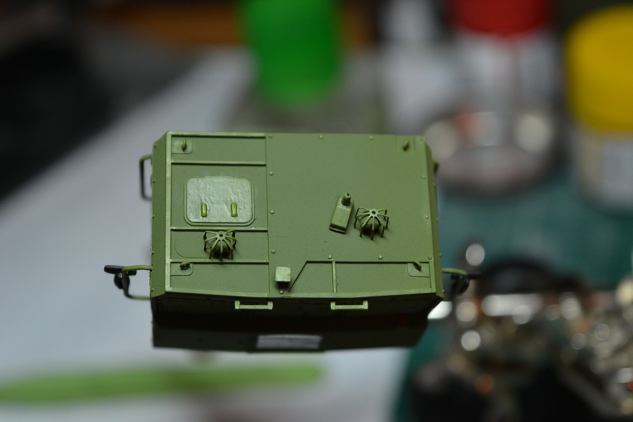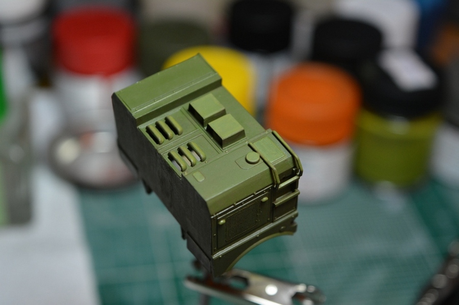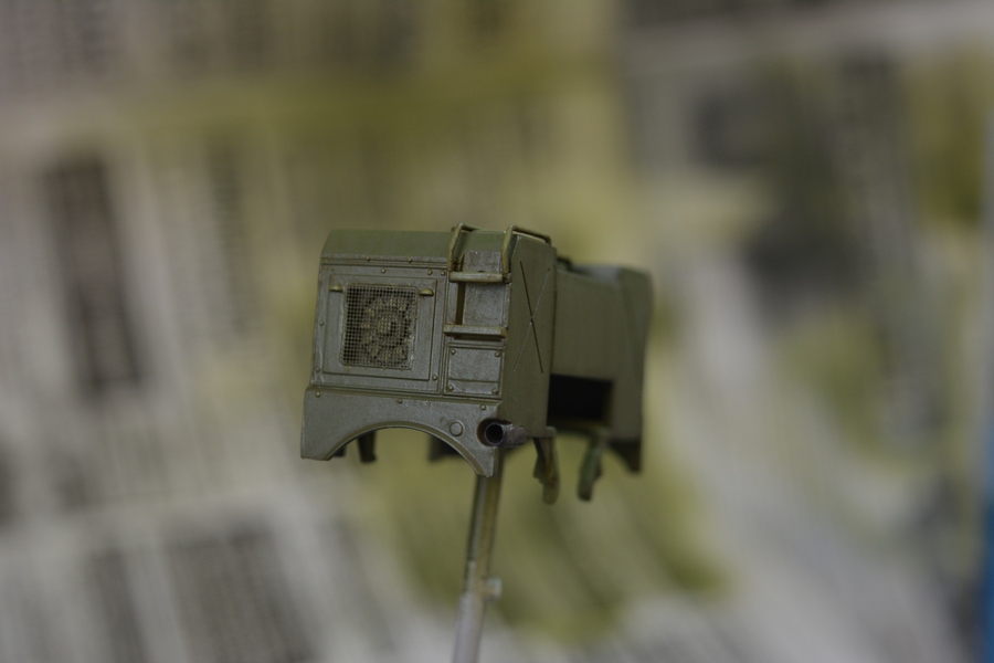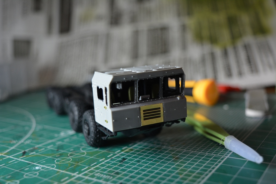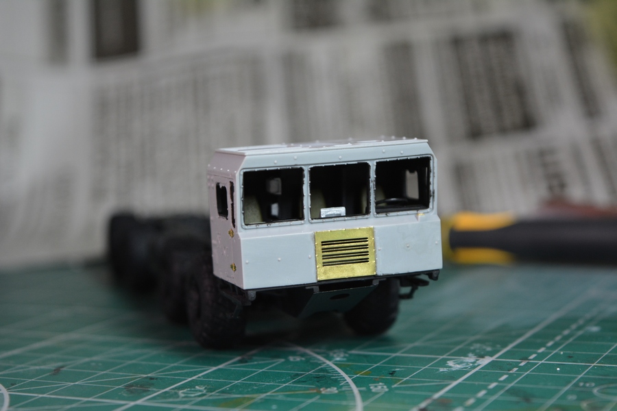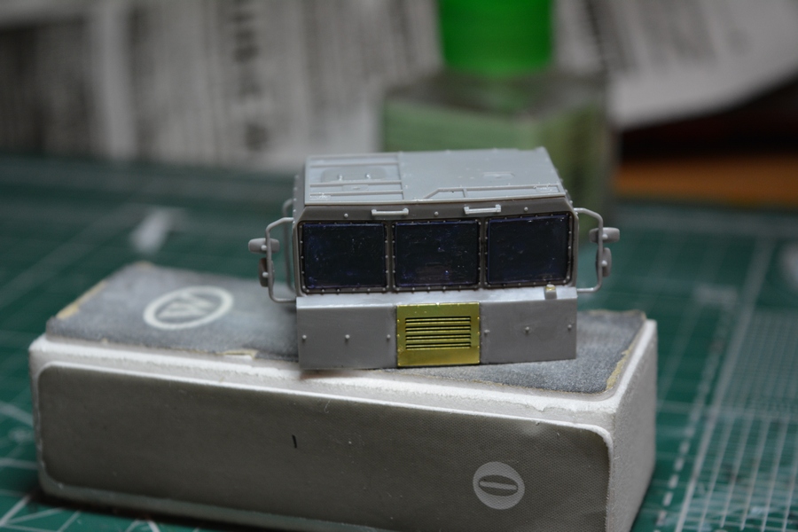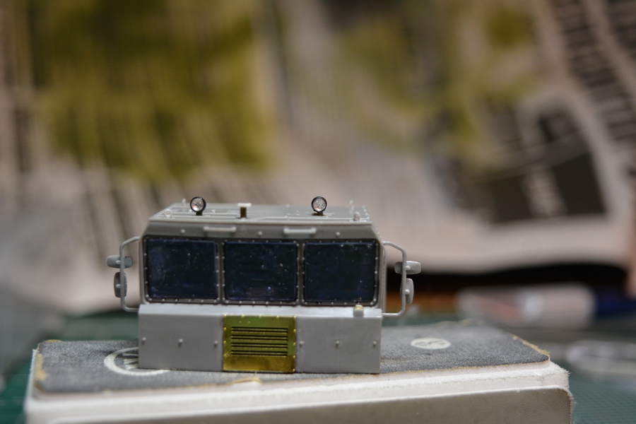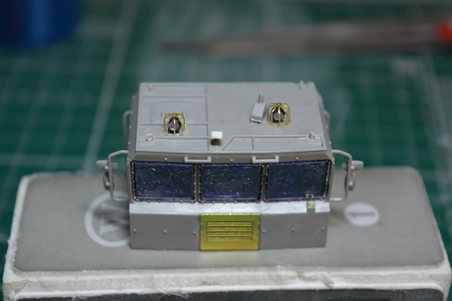 На втором и третьем фото, впереди, по центру кабины грибок антенны спутниковой системы навигации, его тоже в комплекте не было. Изготовил сам из кусочка литника и дошипластика.