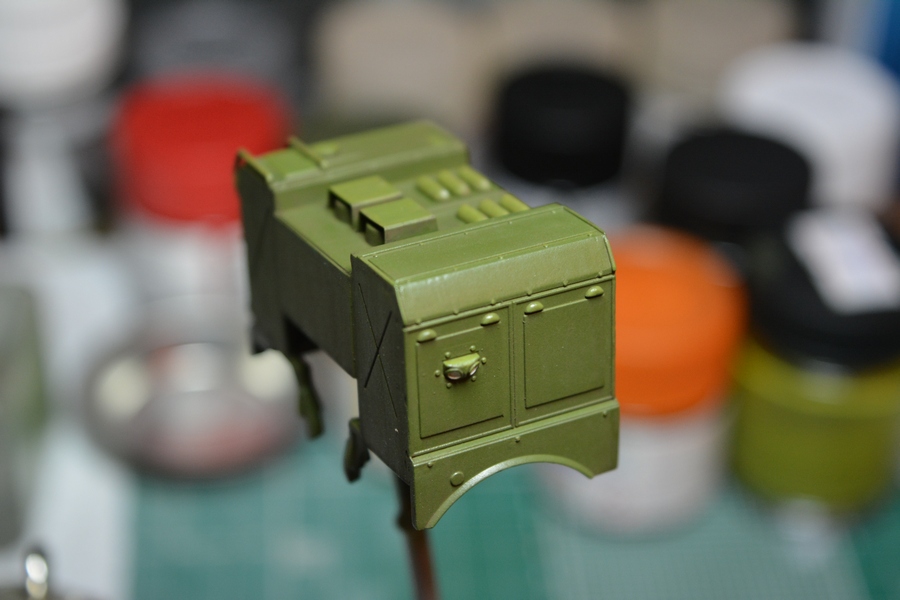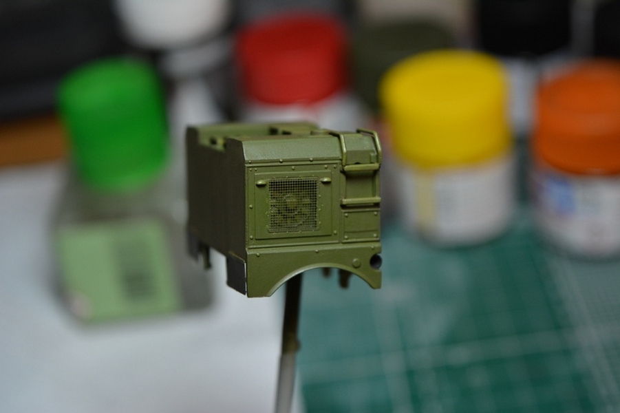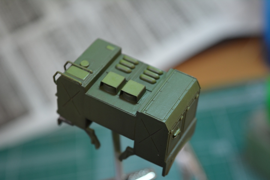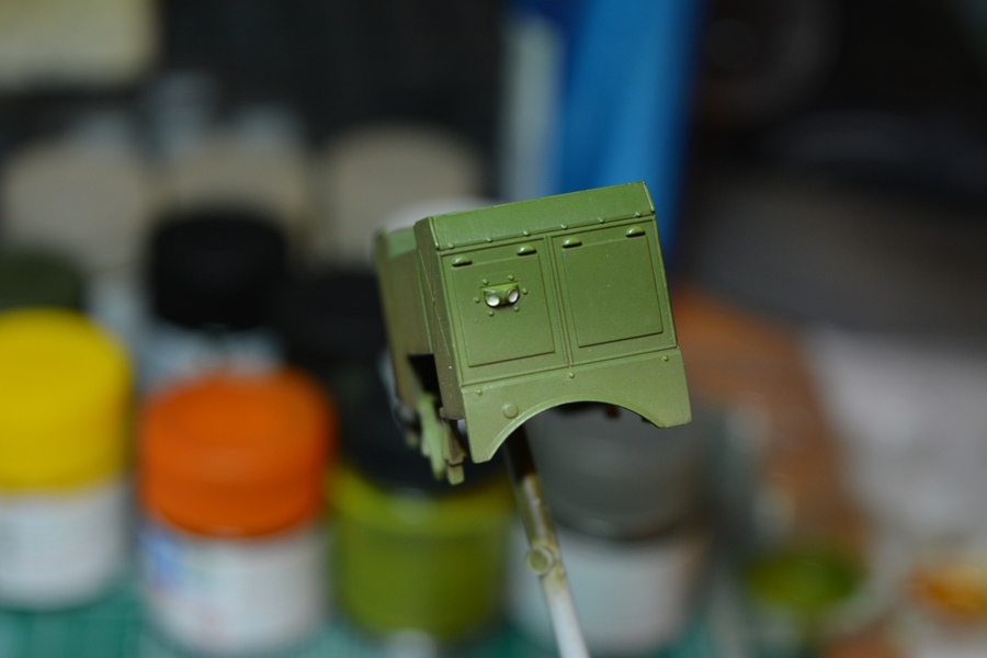 Собрал и покрасил раму с трансмиссией. Раму задул черной краской и после покрыл полуматовым лаком. Сзади переделал ящик под БКСО, сделал ему крышку и замок, покрасил его в оливковый цвет. Пол кабины и основание кресел расчета покрасил краской "под резину".