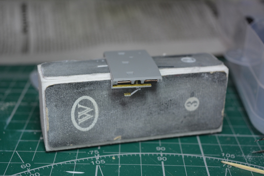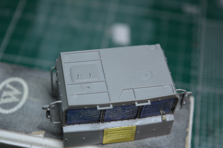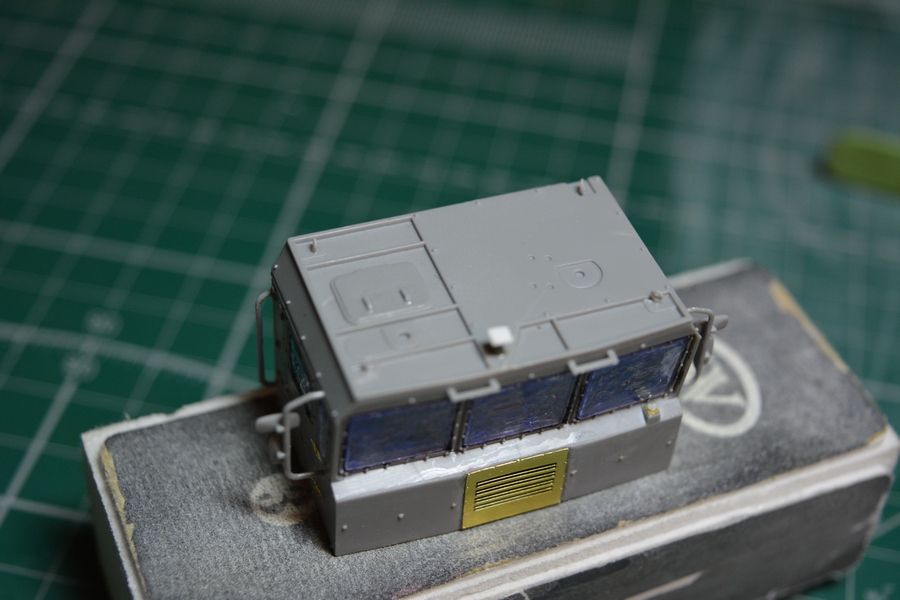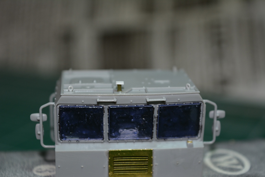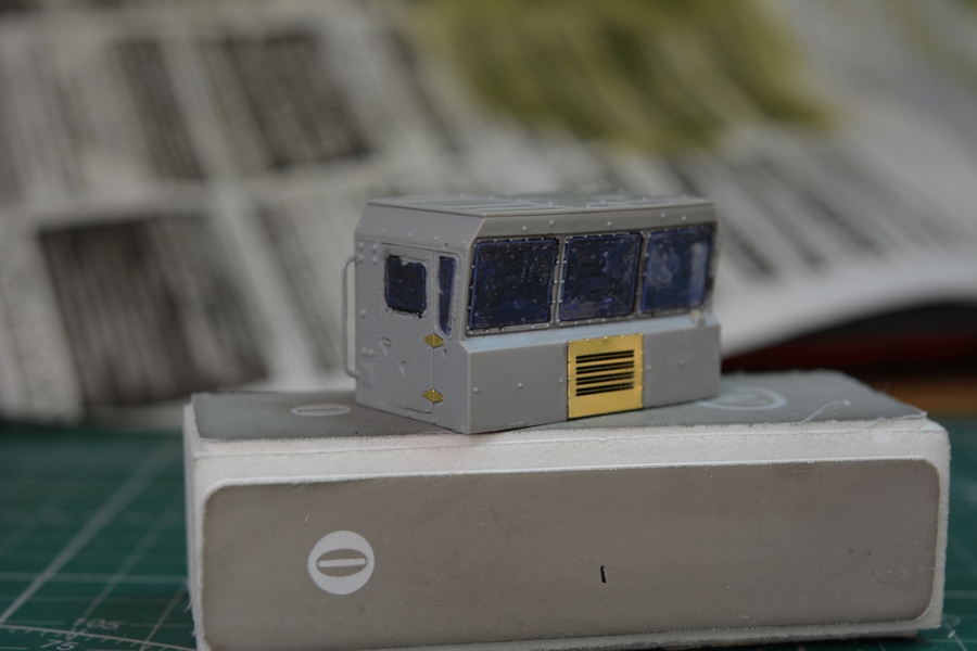 Вклеил стекла в кабину и покрыл их маской под покраску. Приклеил поручни за дверями.