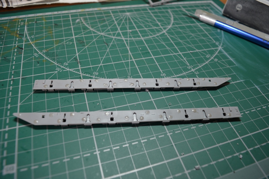 Начал сборку, как предлагает инструкция, с рамы. Она представлена двумя большими половинами. Рама проработана довольно подробно, элементы подвески, а именно торсионы, отлиты вместе с рамой. На тыльной стороне имеются многочисленные следы от толкателей.
