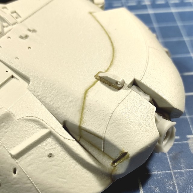 При установке "накладки" Steelbrew образовался небольшой неровный "жёлоб", и я решил, что будет сложновато вылепить здесь тоненький сварной шов так, чтобы он смотрелся натурально и был одинаковым по всей длине. Поэтому я, ровненько так, зашпаклевал желоб с помощью двухкомпонентной шпаклевки, и уже на другой день вылепил швы, а также сделал хорошо заметную на всех фото полуцилиндрическую канавку на правой скуле передней части накладки (МЕНГ здесь отдохнул).