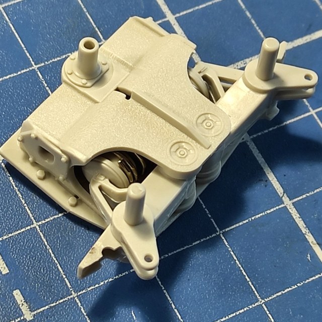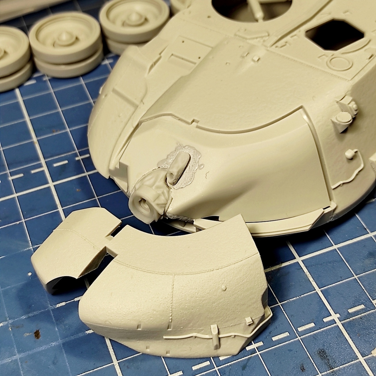 Модель собирается интуитивно, на полном расслабоне; именно поэтому я допустил первую некритическую ошибку: при установке дуги грязеотбойной балки (или как там оно у них называется) перепутал верх с низом и вместо остатков питателей срезал посадочные выступы по краям и имитацию крепежной площадки посредине этой детали. Ну и ладно; там всё равно нужно переделать эту самую площадку с дырочкой спереди; вон там, под физиономией мехвода на снимке: