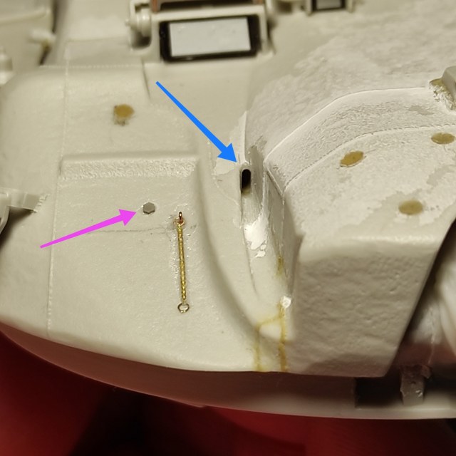 Сделал эти мелочи (красные стрелки на фото. Синяя стрелка - это имитация проушины для навесного замка на люке, здесь вообще-то пригодились бы детали из фототравления, но его у меня нет. Ладно, позже что-нибудь придумаю и разберусь своими силами: