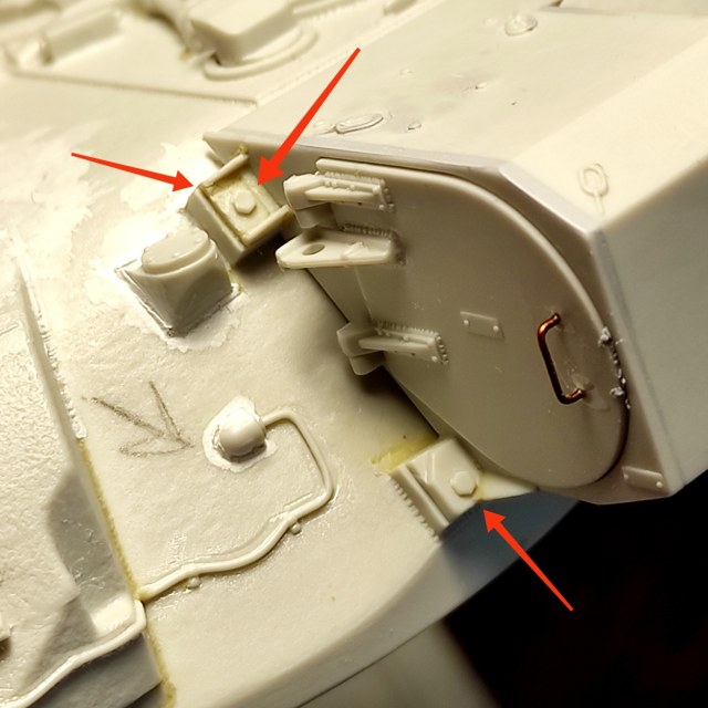 Здесь же впервые пришлось применить двухкомпонентную шпаклевку (красные стрелки) - одна из броневых накладок не села на место с обычной для этой модели точностью +_ 1 микрон )))