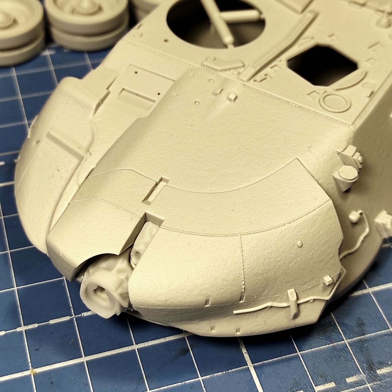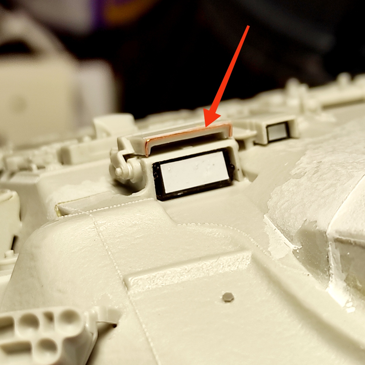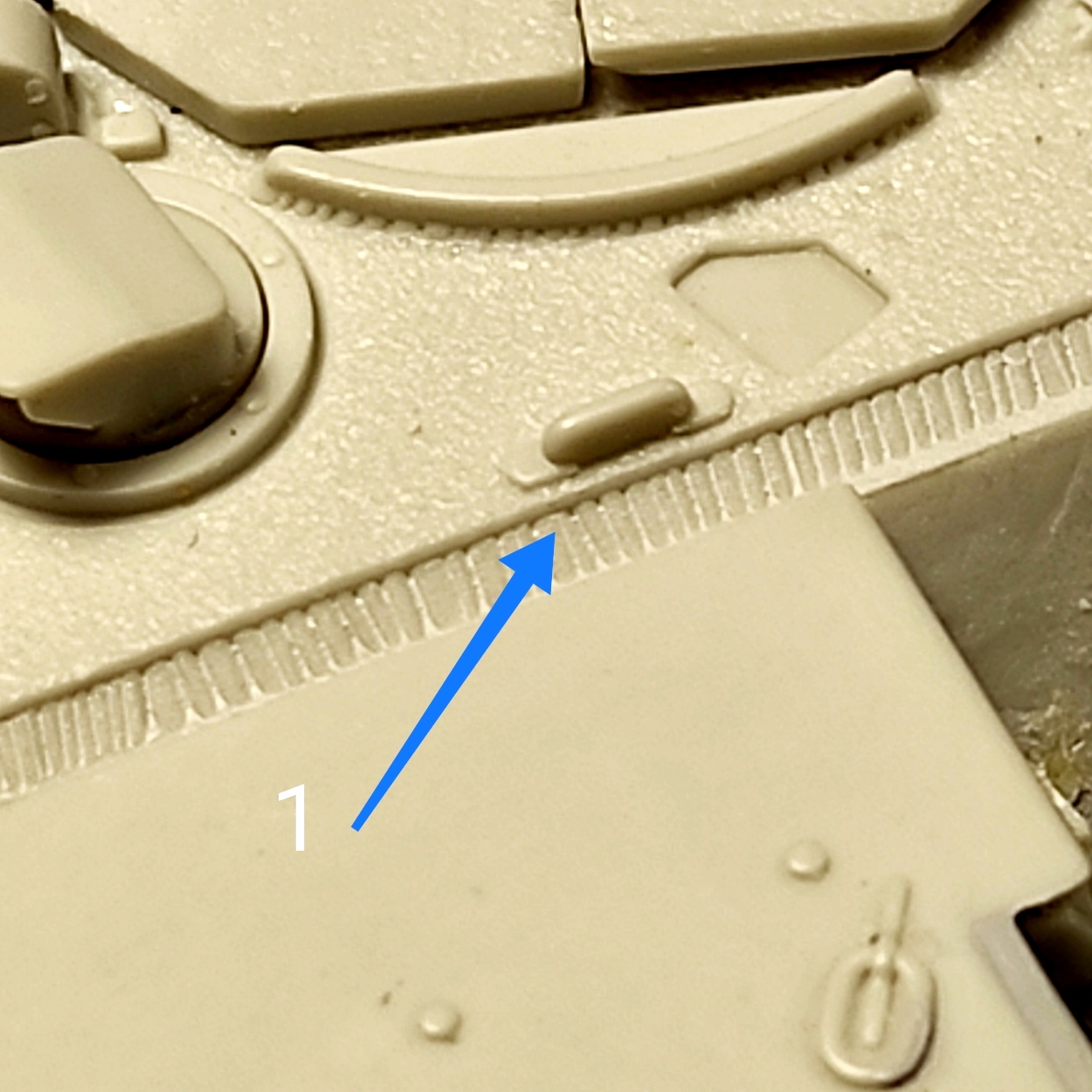 Триплекс заряжяющего можно сделать вращающимся (вклеил в него ось и сделал отверстие в броне + стопор), но козырек отлит зацело с корпусом триплекса (на Челлах от Тамии и РФМ это отдельные детали), соответственно отсутствуют три головки болтиков крепления козырька к телу.