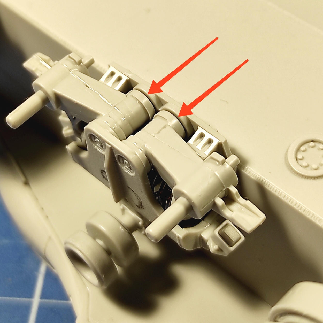 Тележки ходовой отлично деталированы и снабжены металлическими пружинками, что позволяет получить т.н. "работающие балансиры", хотя, как я уже не раз заявлял, как по мне, так это чисто маркетинговые заморочки, не имеющие никакой практической ценности в большинстве случаев, за исключением, пожалуй, установки модели на подставку со сложным рельефом.