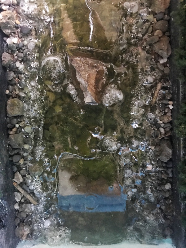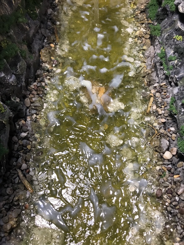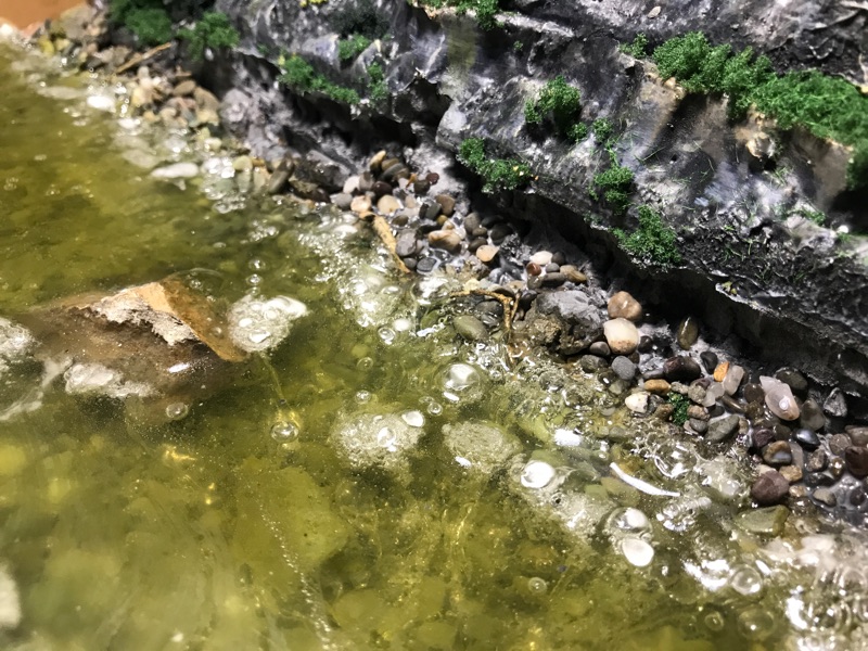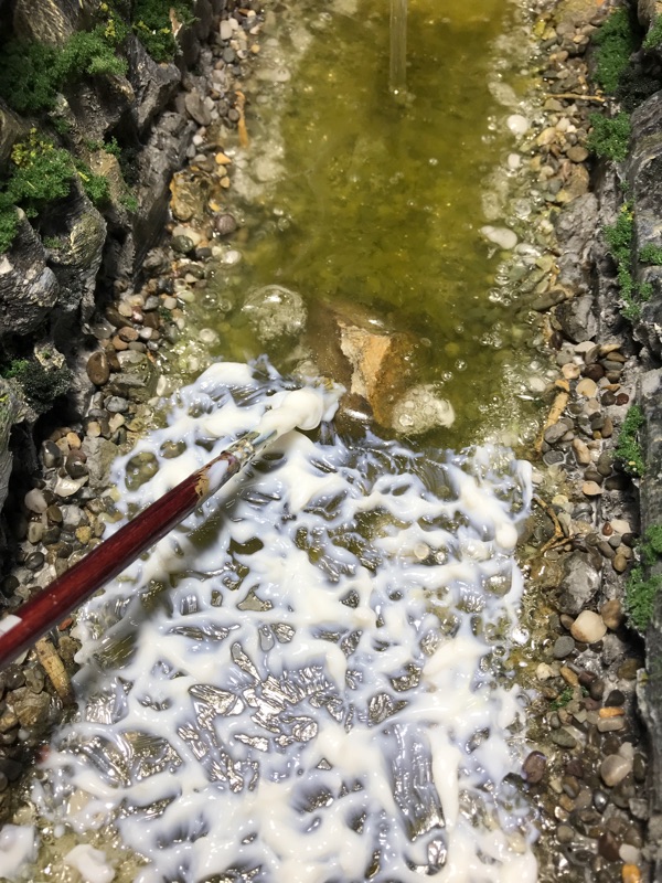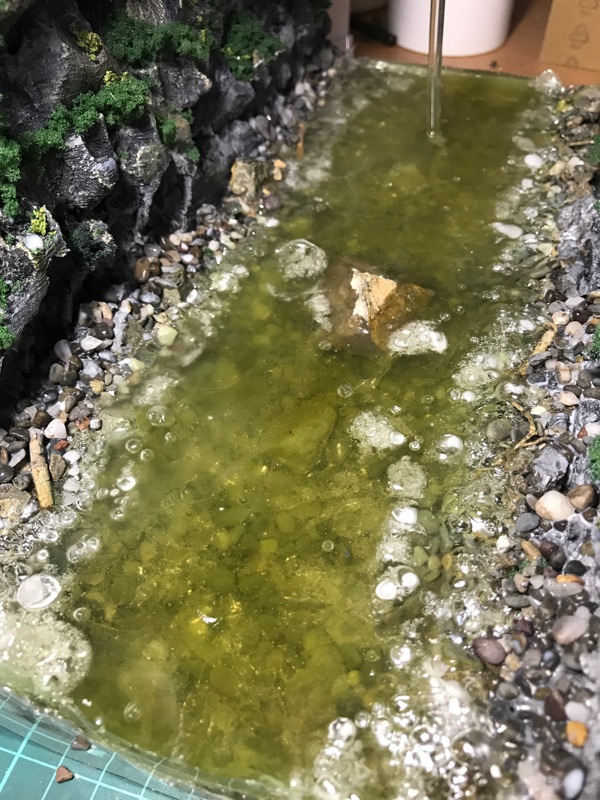 Как вы помните, закончил я в предвдущем посте на этапе предвкушения заливки реки. Предварительно я окрасил камешки на дне в зеленоватый цвет.