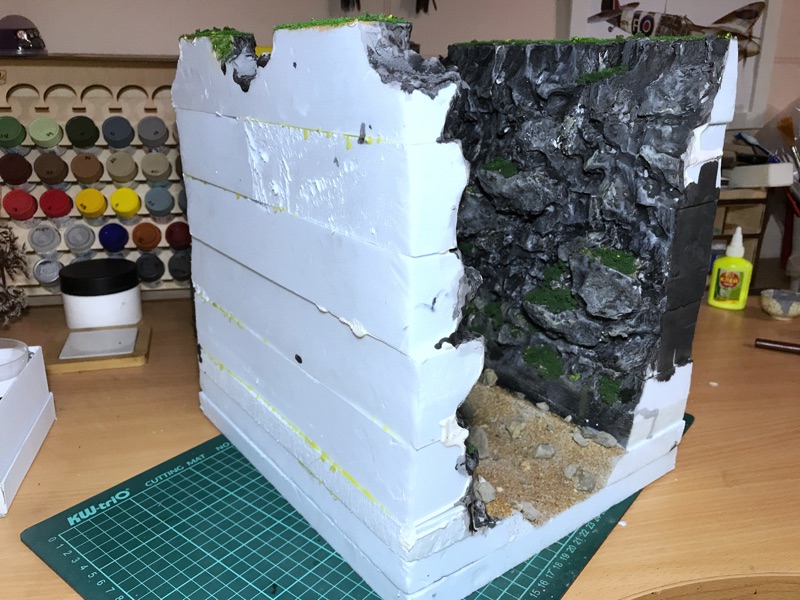Таааааак... пока вы на пляже загорали, я добавил растительности на скалы, подкрасил там-сям, травы посадил сверху. И... все же решил склеить все воедино с основанием. От идеи со съемной стенкой отказался, потому как буду заливать речку с эпоксидкой и не представляю как залить, а потом как сдклать невидимым шов. Поэтому все склеил и начал работать над дном. Покрасил, насыпал песочка, приклеил камней. Теперь жду пока высохнет и буду красить.