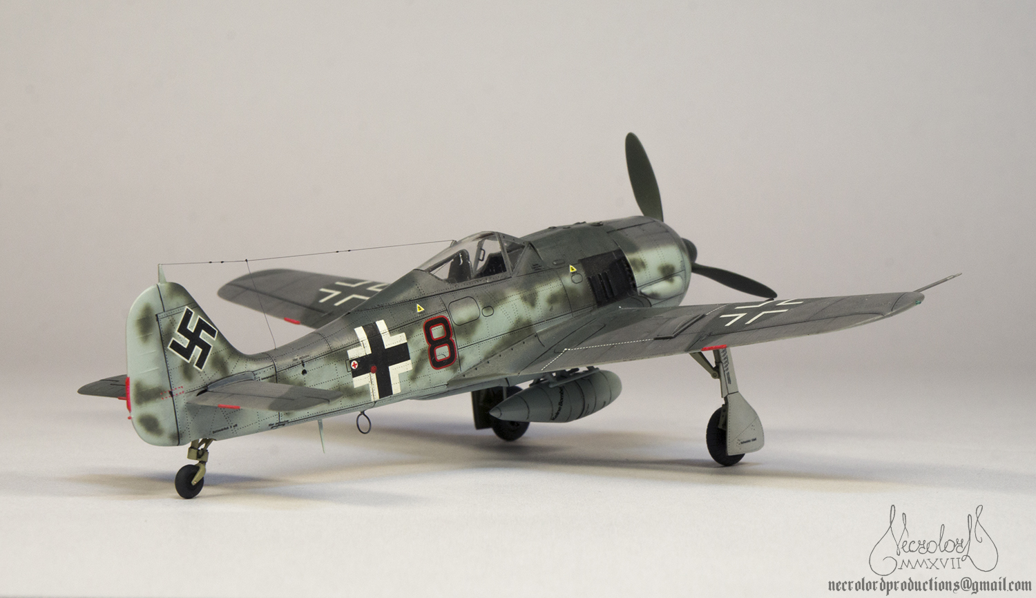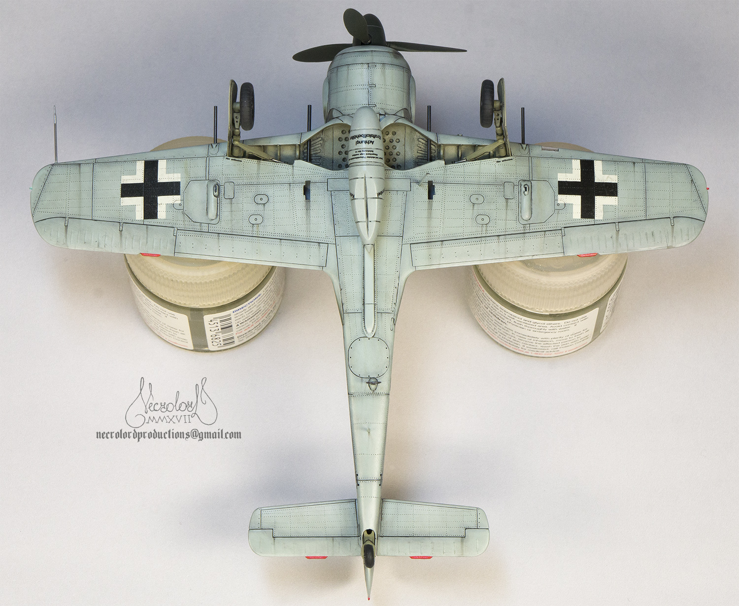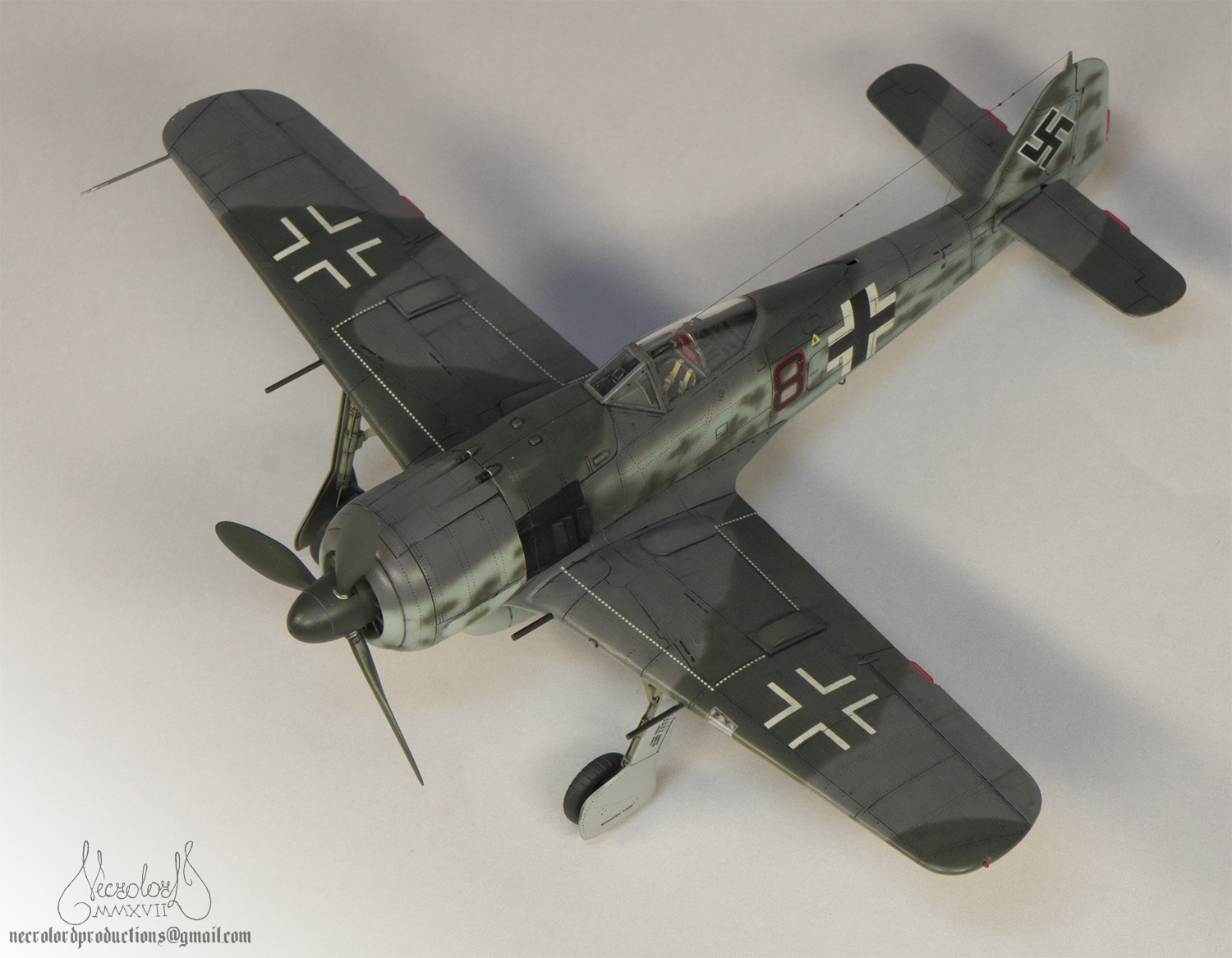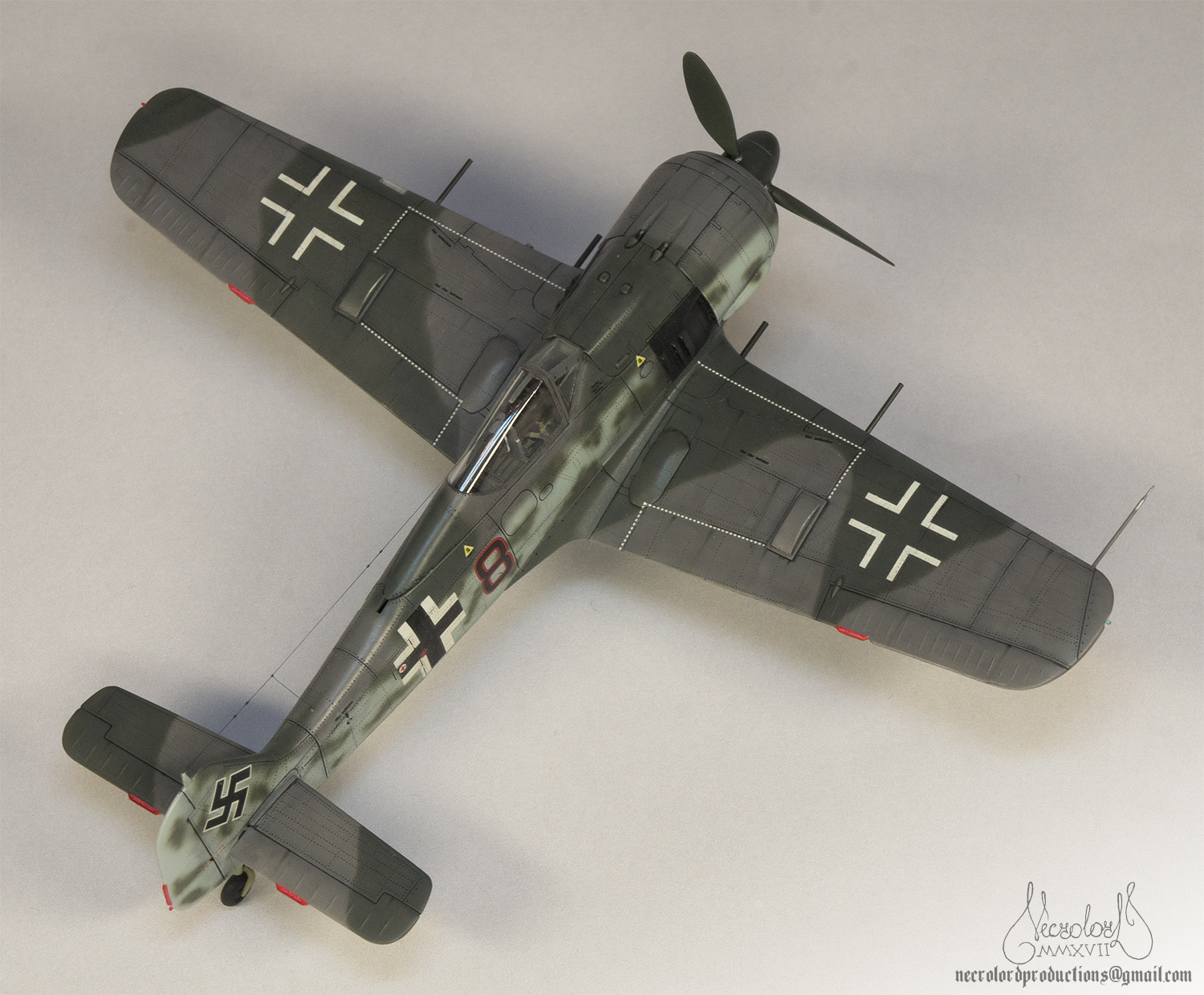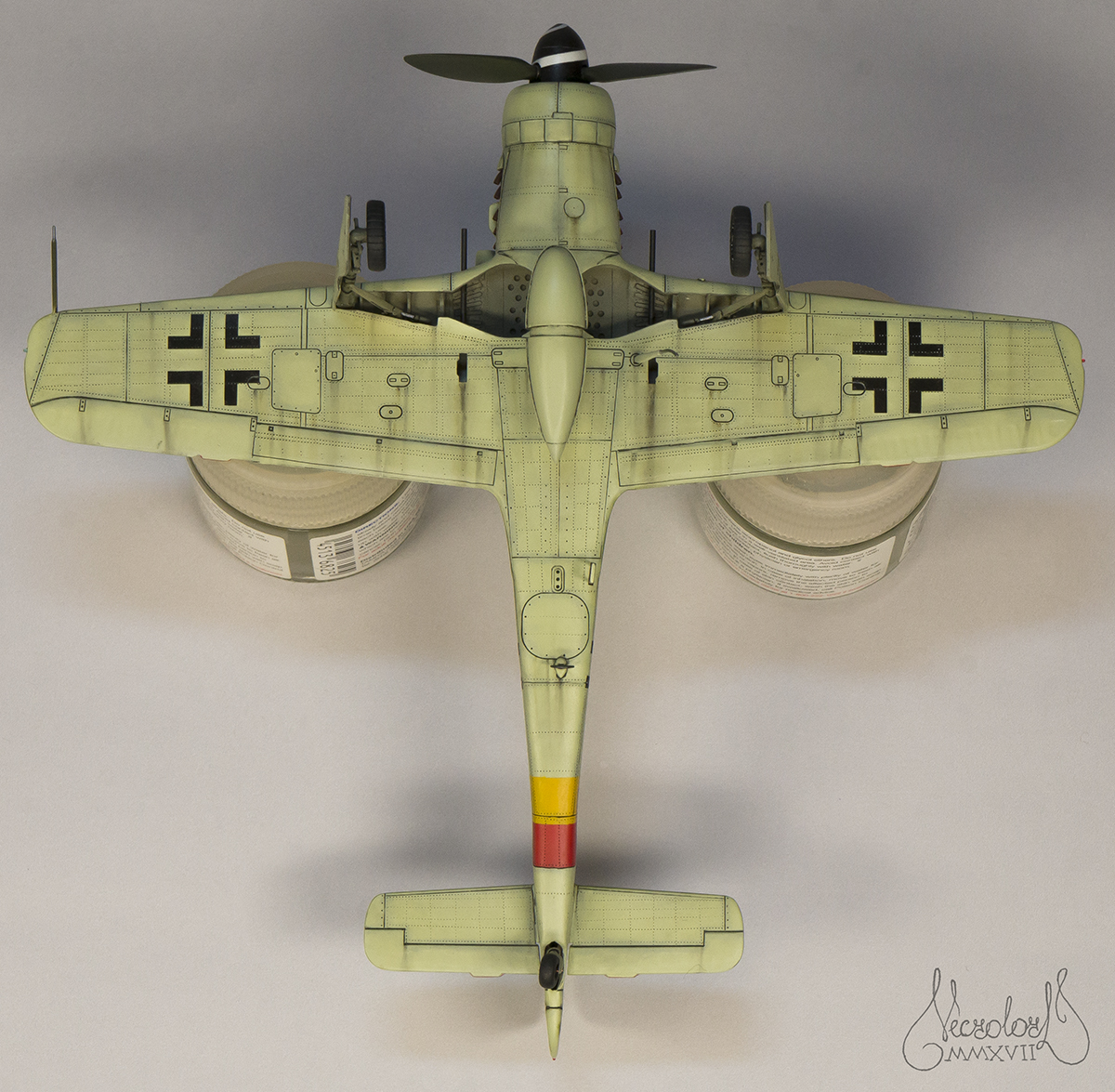 По работе коротко: белый грунт, прешейд, краски Мр Колор и Тамия, полироль для пола Футура, акцент колор от Тамии и их же пудры, пастельные мелки, стволы - полируемый металлик, хвостовой и крыльевые аэронавигационные огни точёные из цветных пластиков, полимерная нить. Пожалуй на этом всё, приятного просмотра!