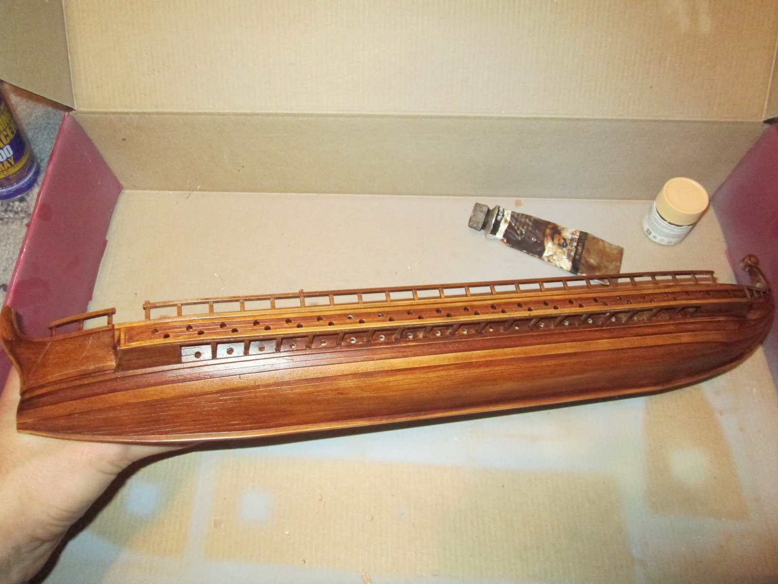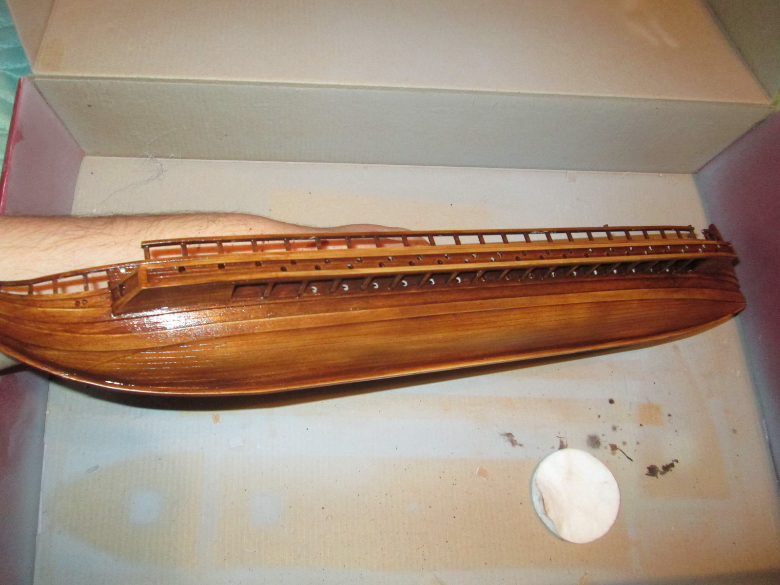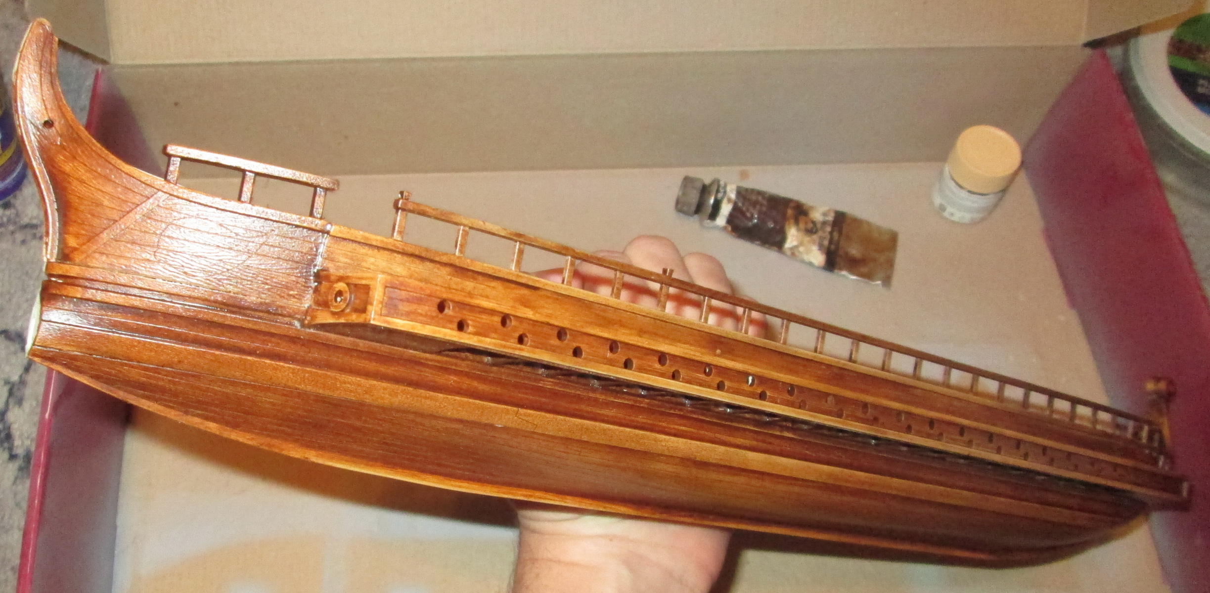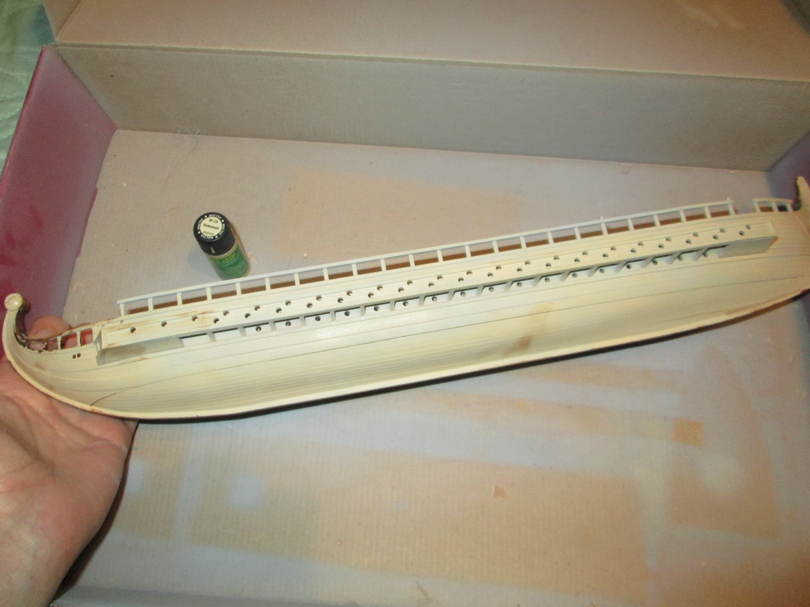 По сравнению с собранными ранее моделями парусников триера имеет прекрасную стыкуемость. По крайней мере, для стыковки бортов и днища не потребовалось клейкой ленты, резинок или прищепок, а затраты шпаклевки оказались минимальны.