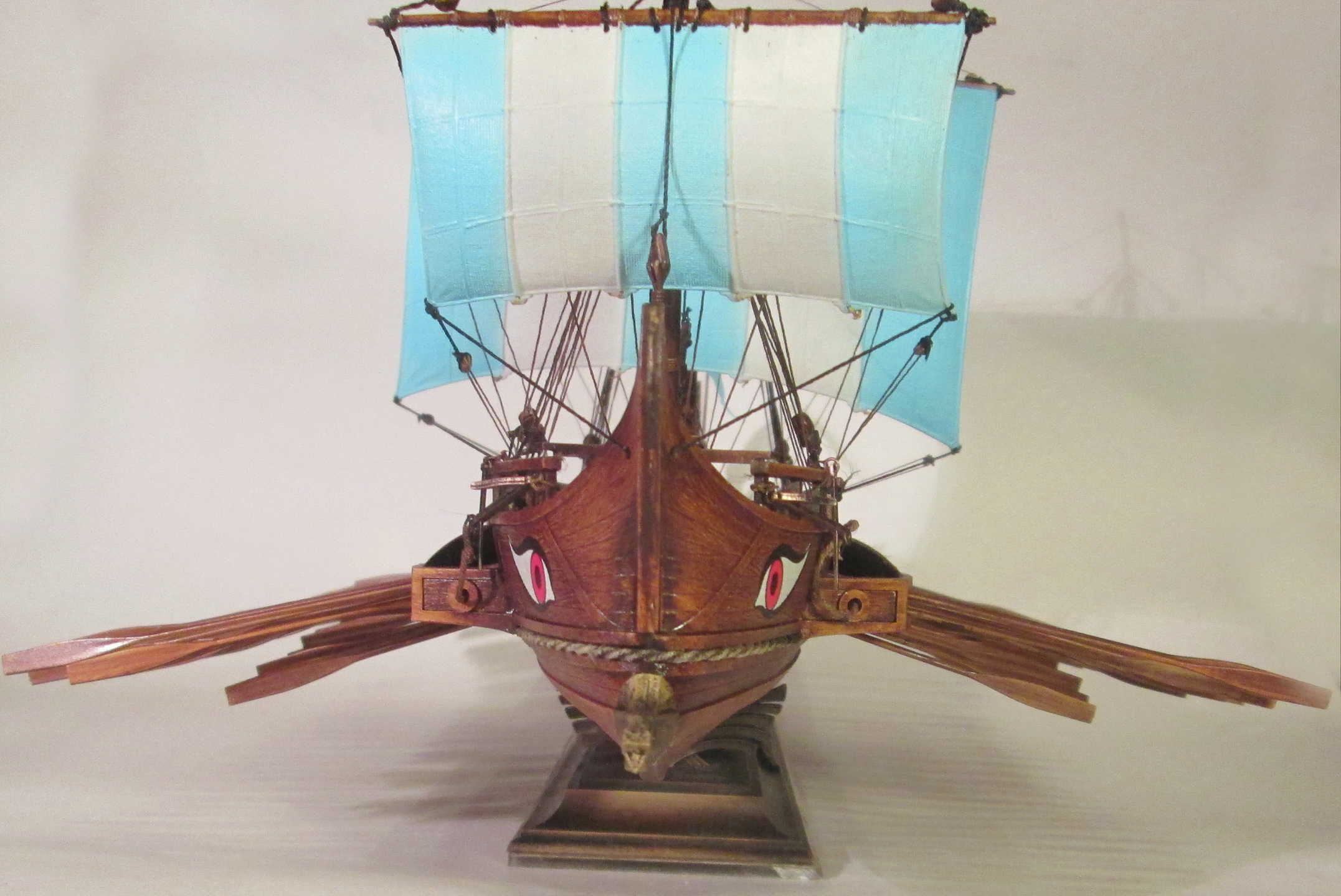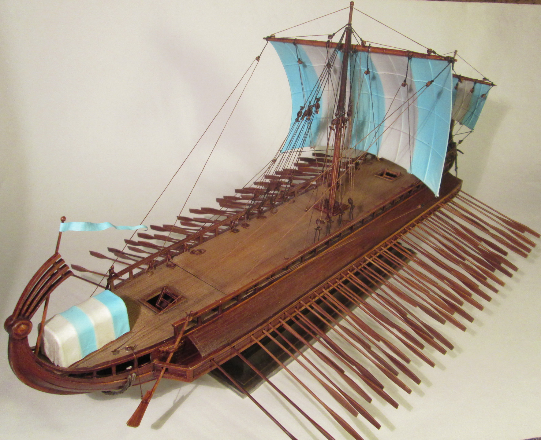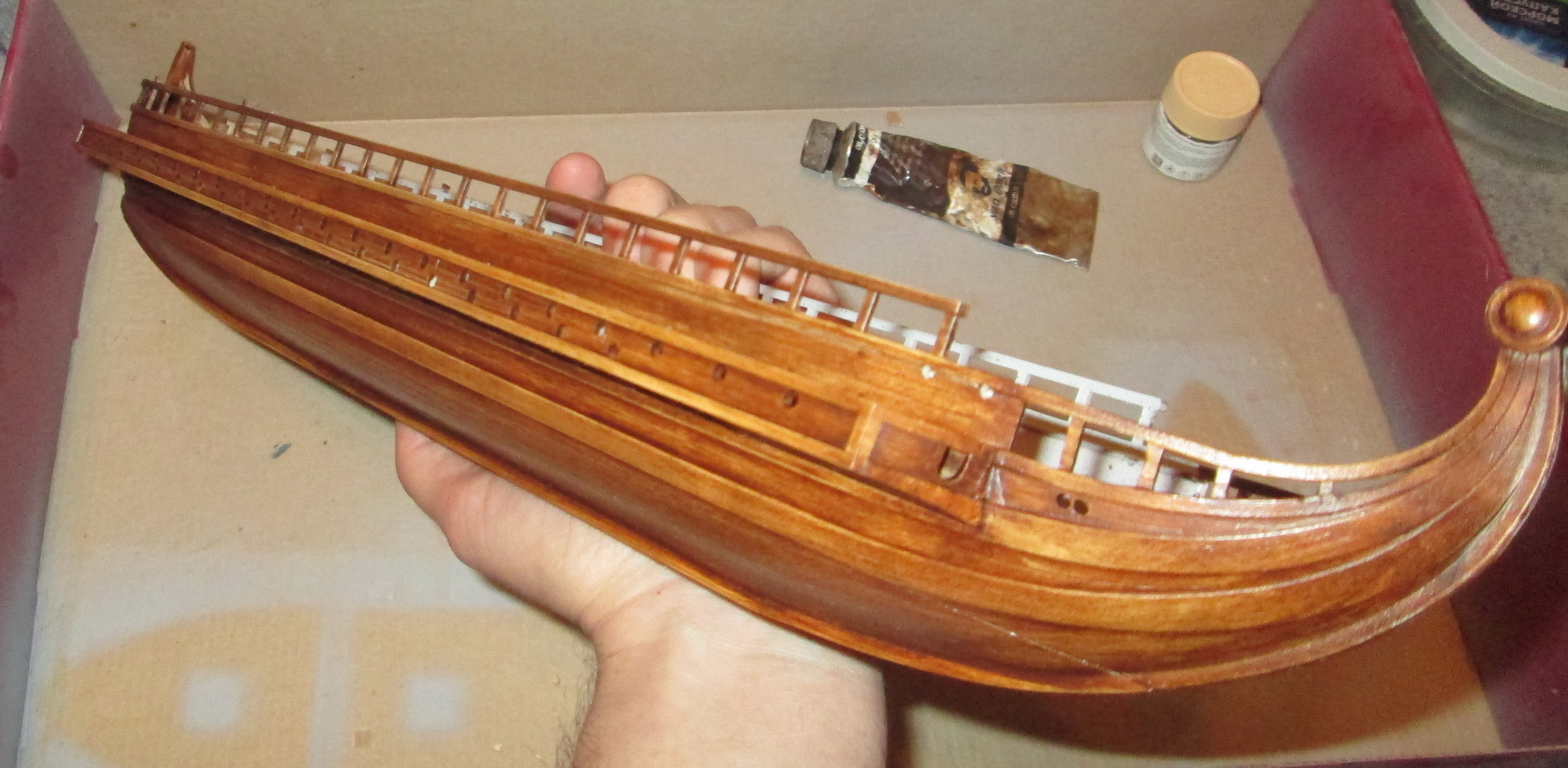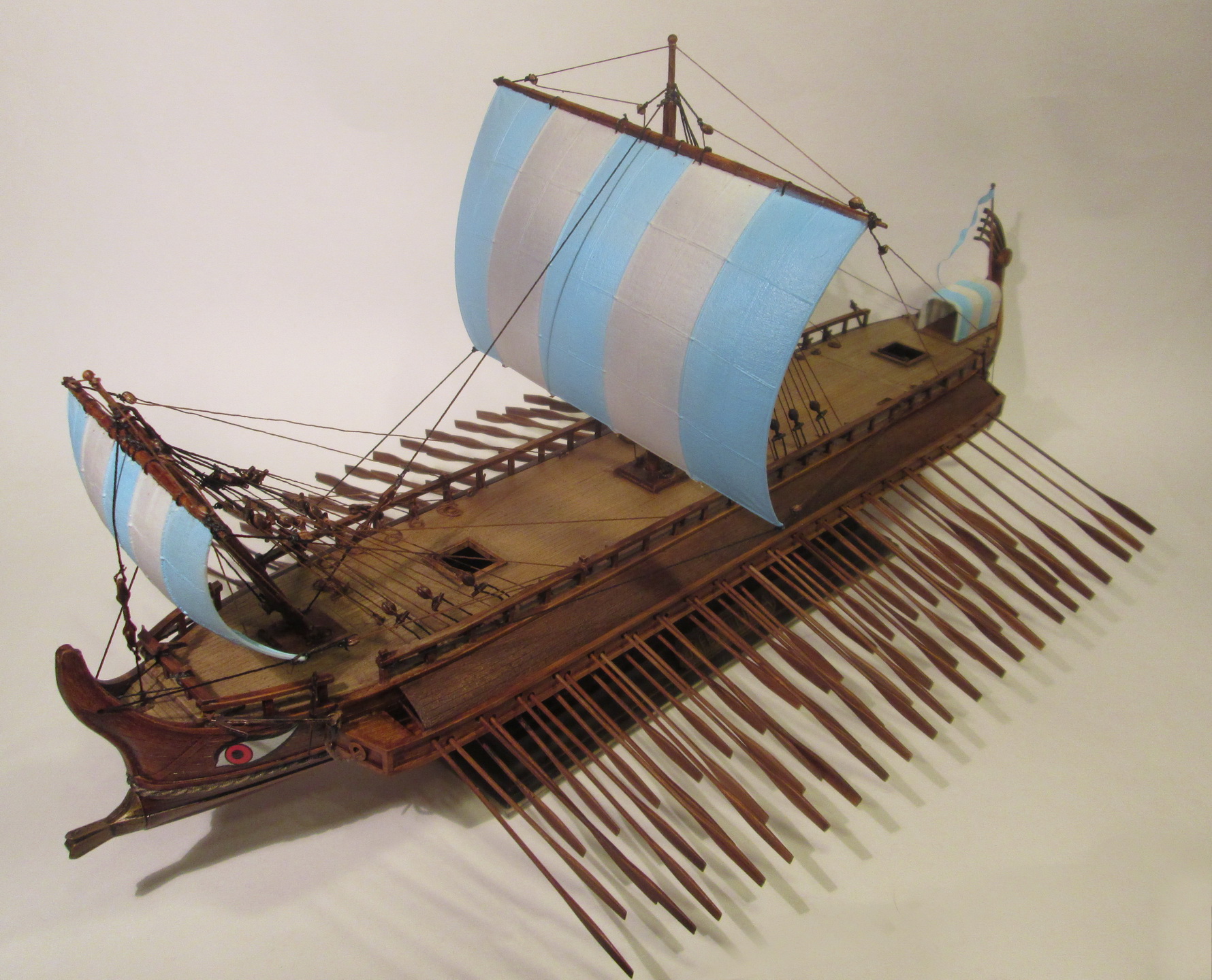 По сравнению с собранными ранее моделями парусников триера имеет прекрасную стыкуемость. По крайней мере, для стыковки бортов и днища не потребовалось клейкой ленты, резинок или прищепок, а затраты шпаклевки оказались минимальны.