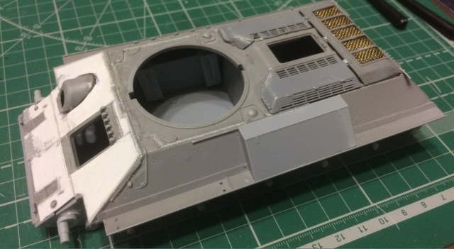 Белые "нашлёпки" - имитация дополнительной брони толщиной 15мм. Так как целиком "выпилить" для меня оказалось затруднительным. Пришлось кроить по частям. Там, где полагается быть сварочным швам - нанёс швы. Остальные "резы" зашпаклюются и покрасятся ))