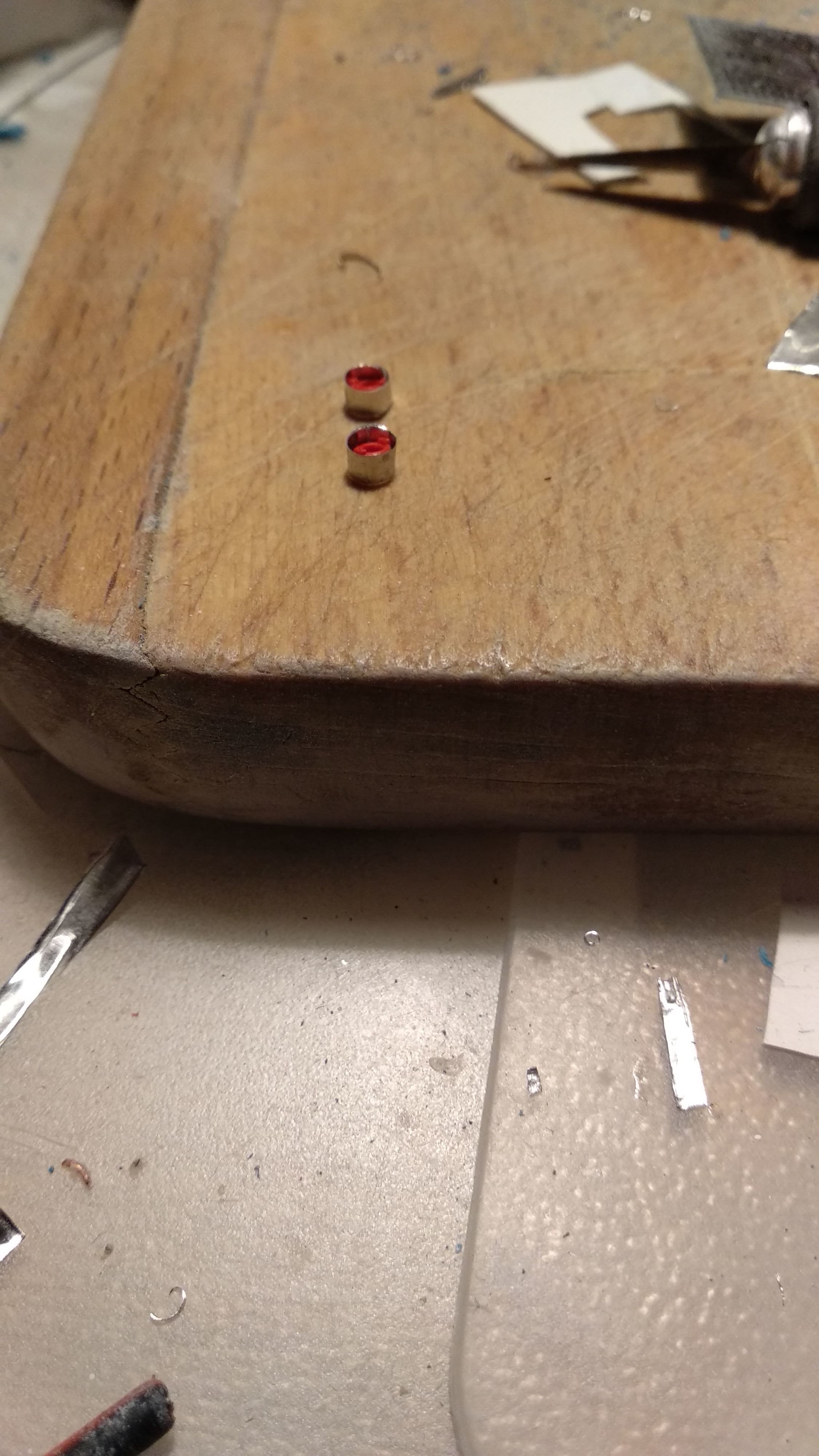 Попробовал сделать поручень и выштамповки для крепления поручня к хомутам. Использовал проволоку Д=0.5мм, а выштамповку сделал из фольги. Думаю, что возможно увеличить толщину поручня, выполнив его из проволоки Д-0.75мм