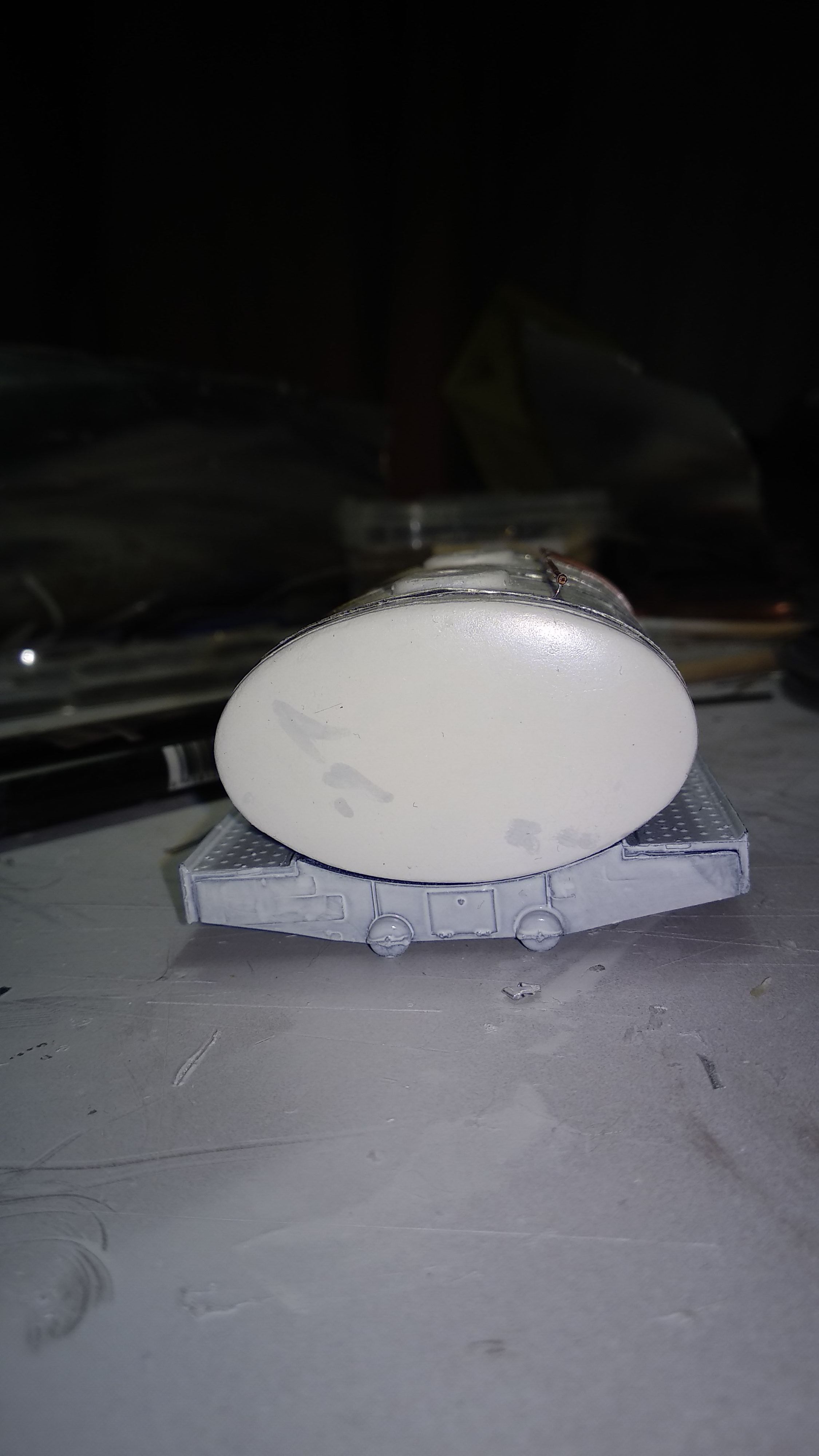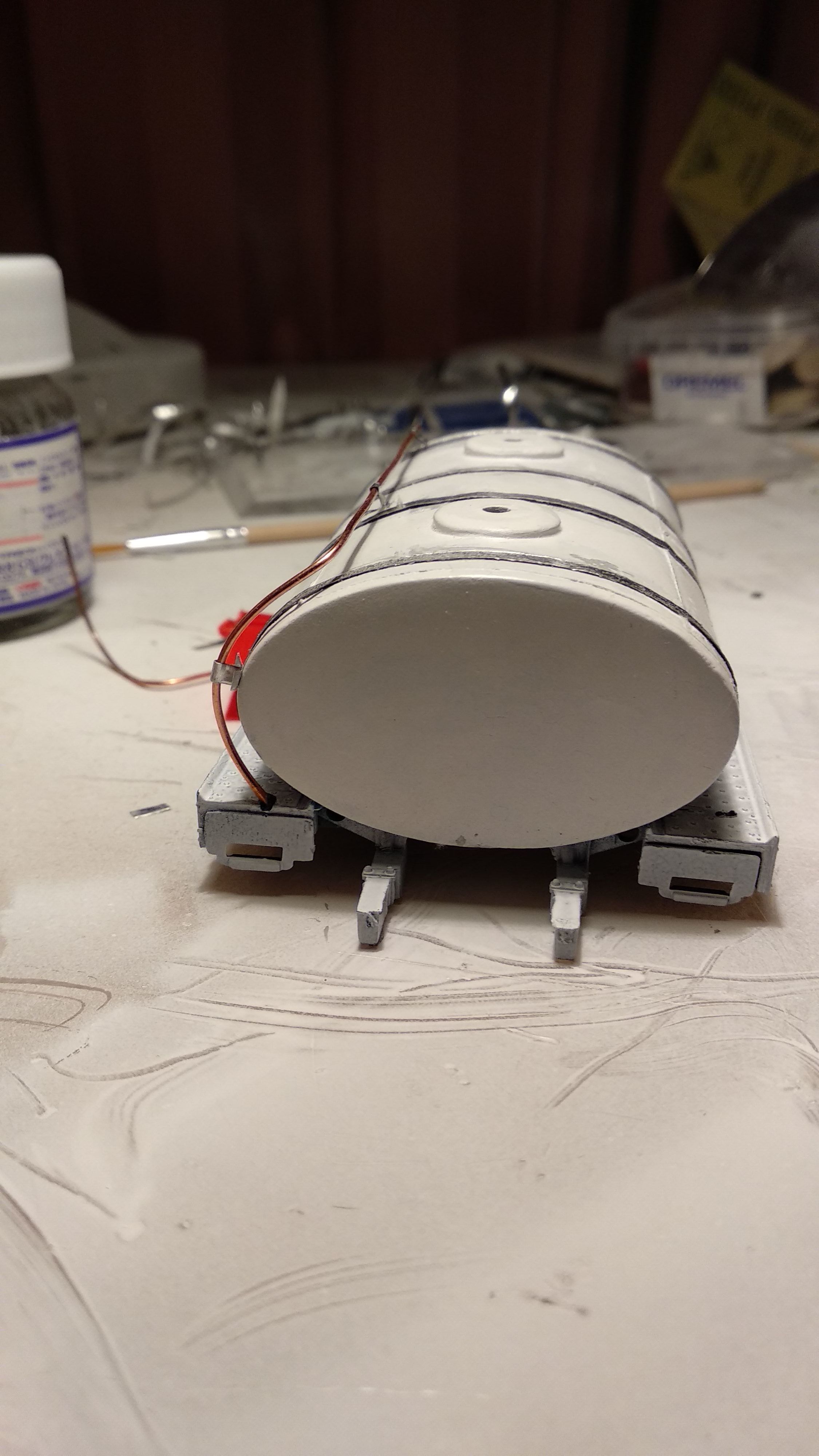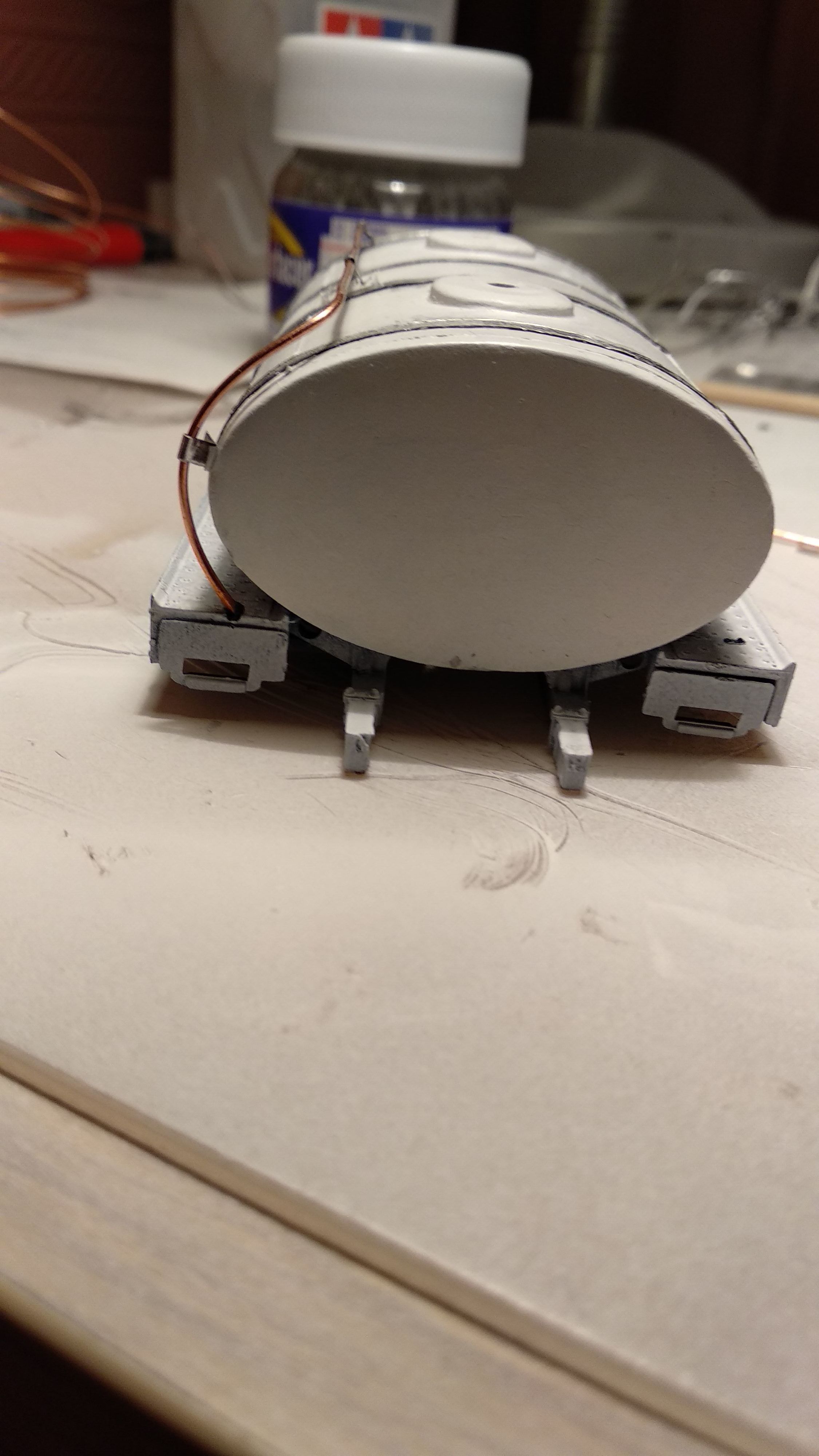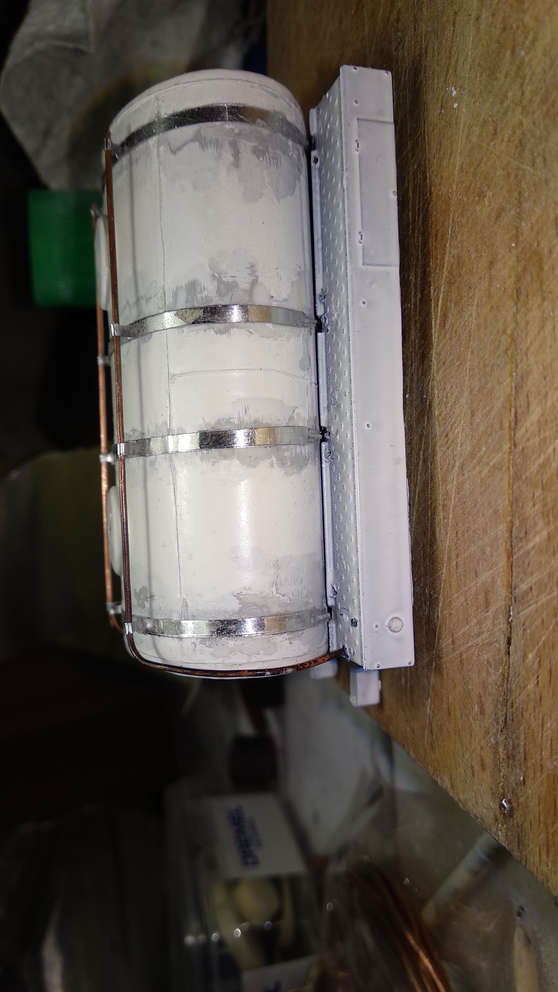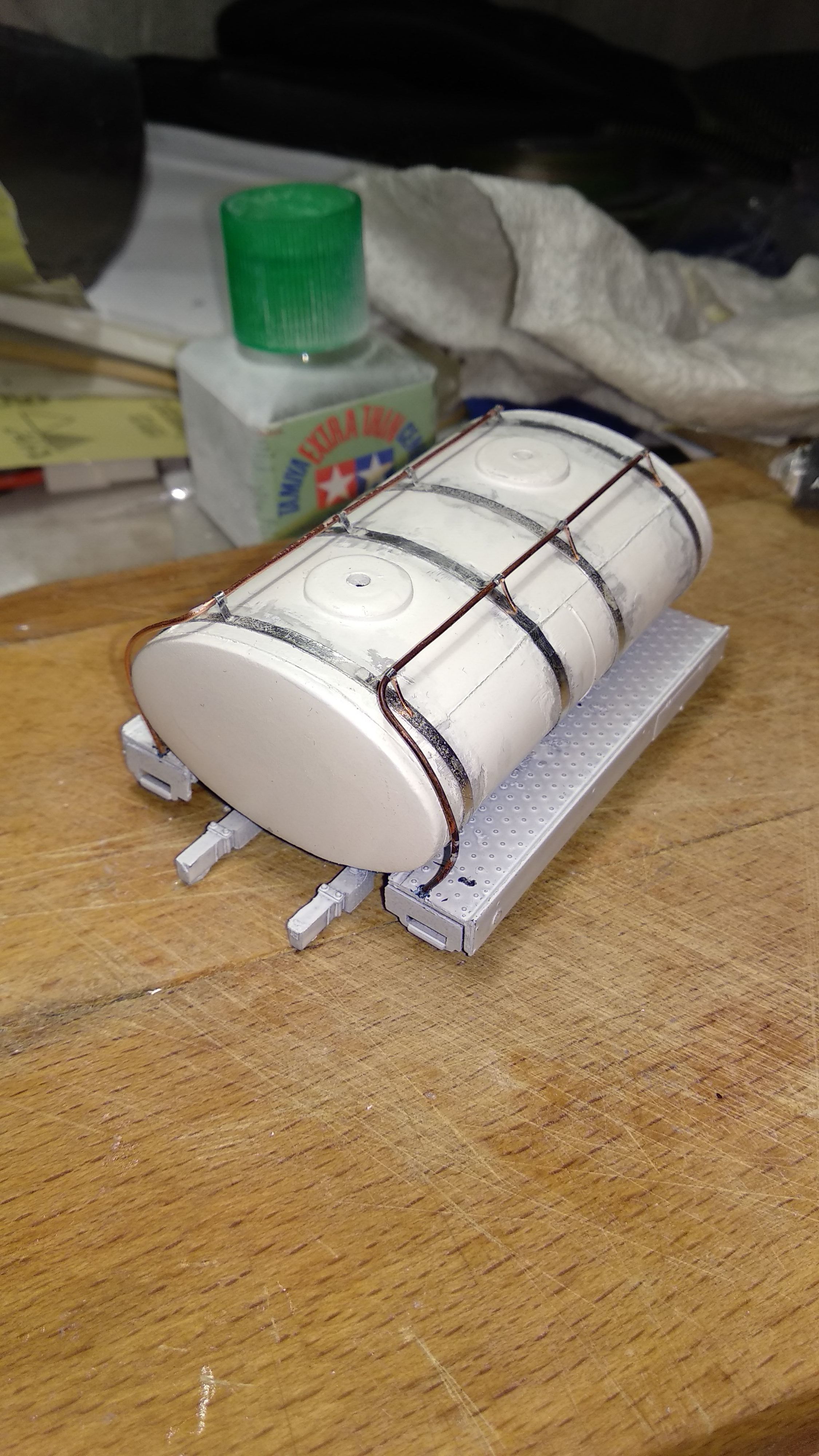 Загрунтовал цистерну, доделал поручни, ошкурил и опять загрунтовал. Собираюсь клеить люки и приступить к окраске цистерны.
