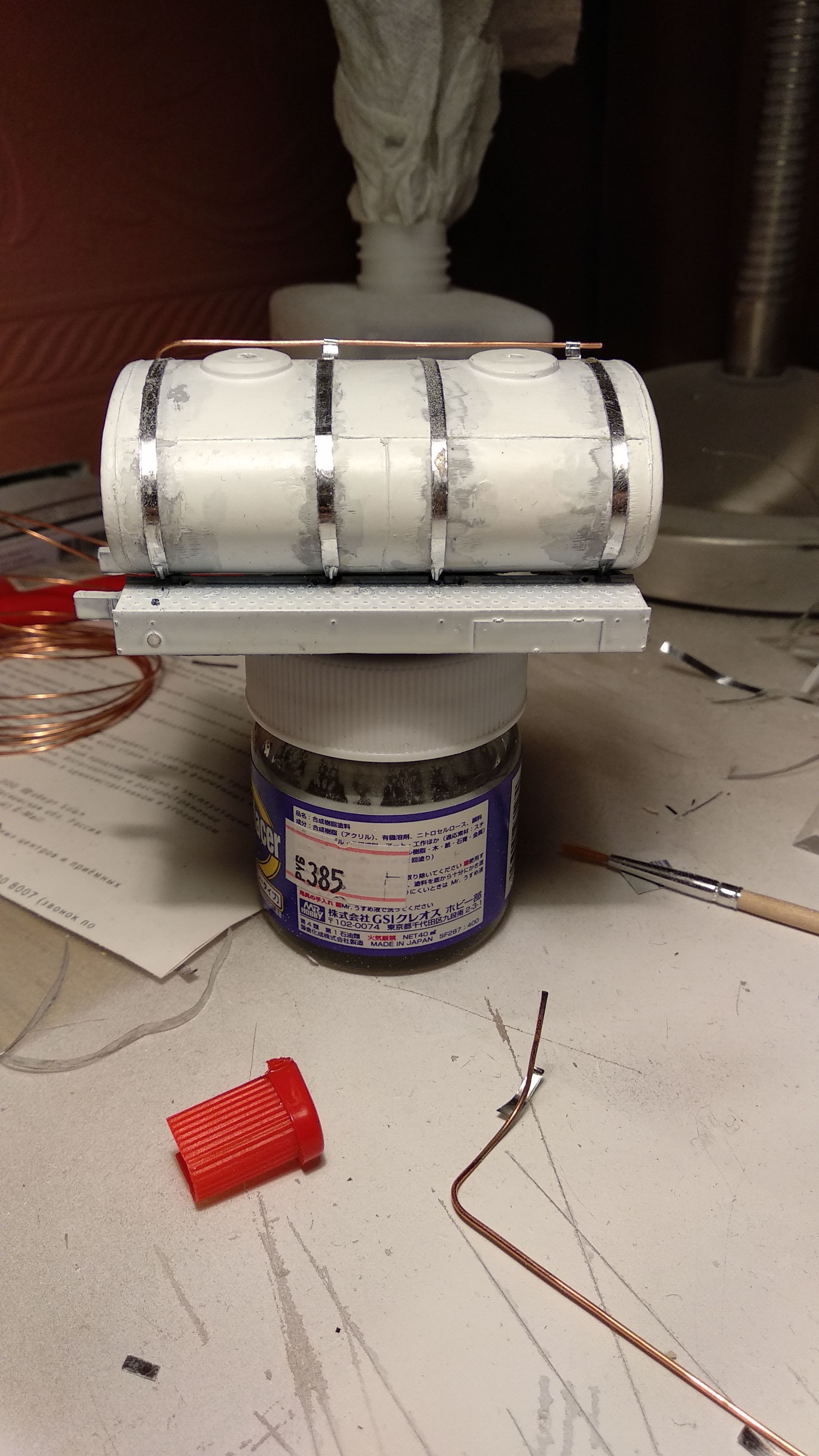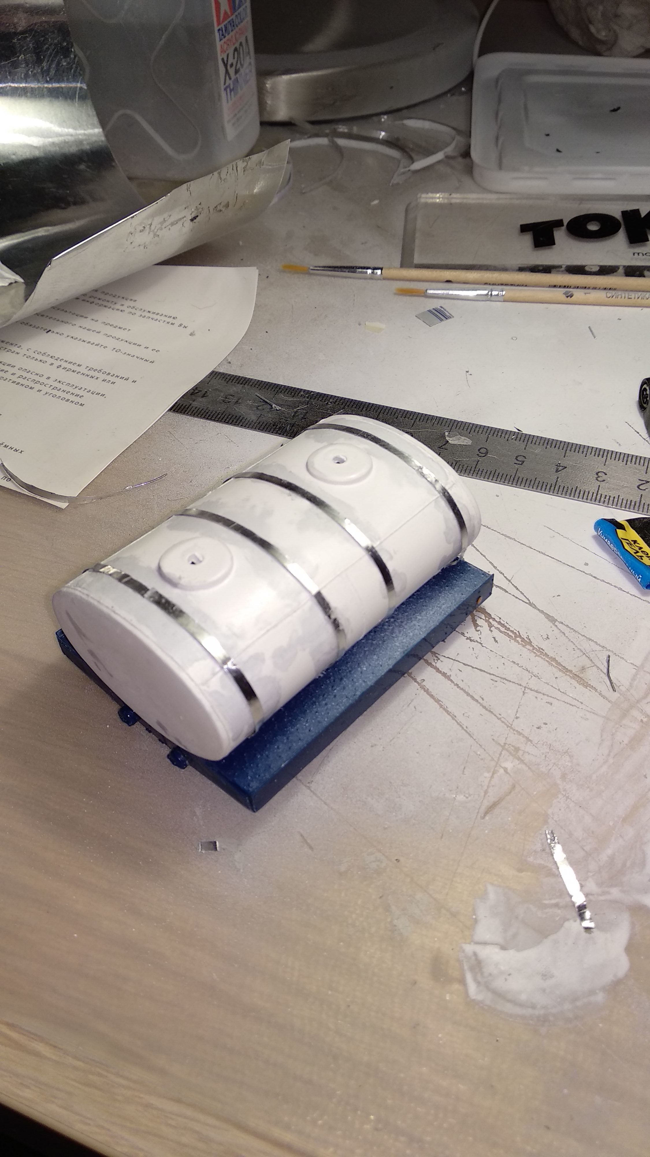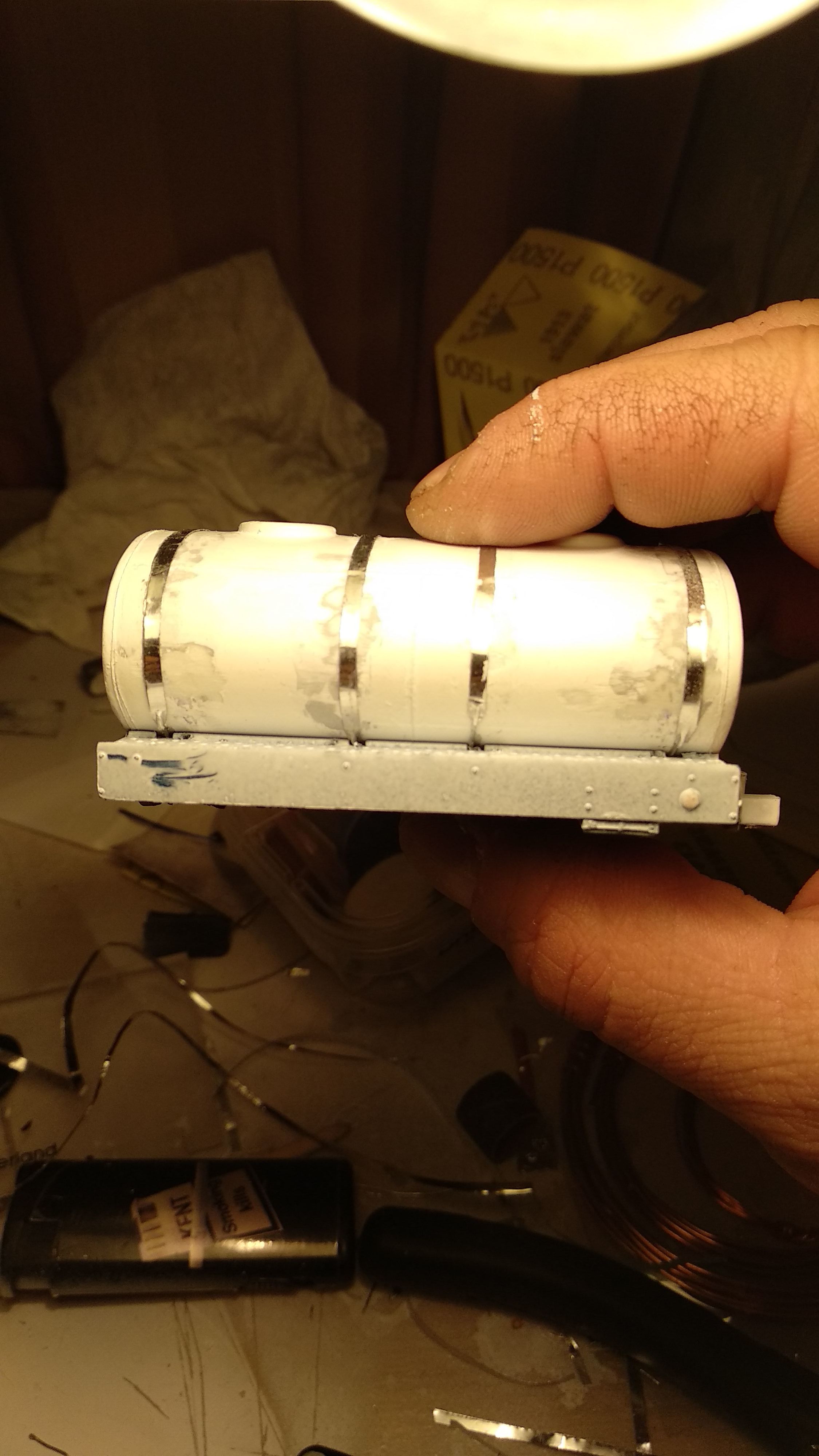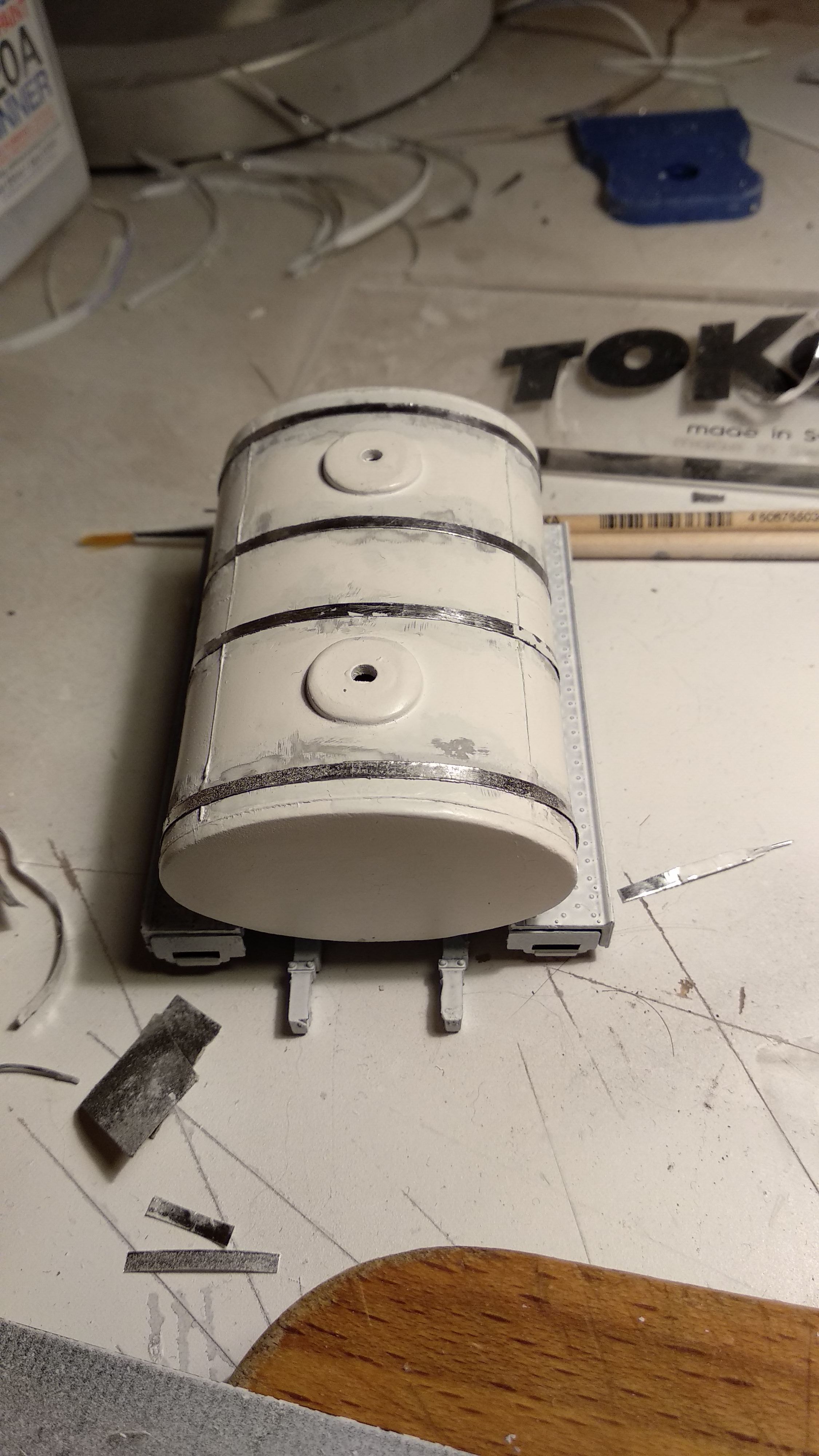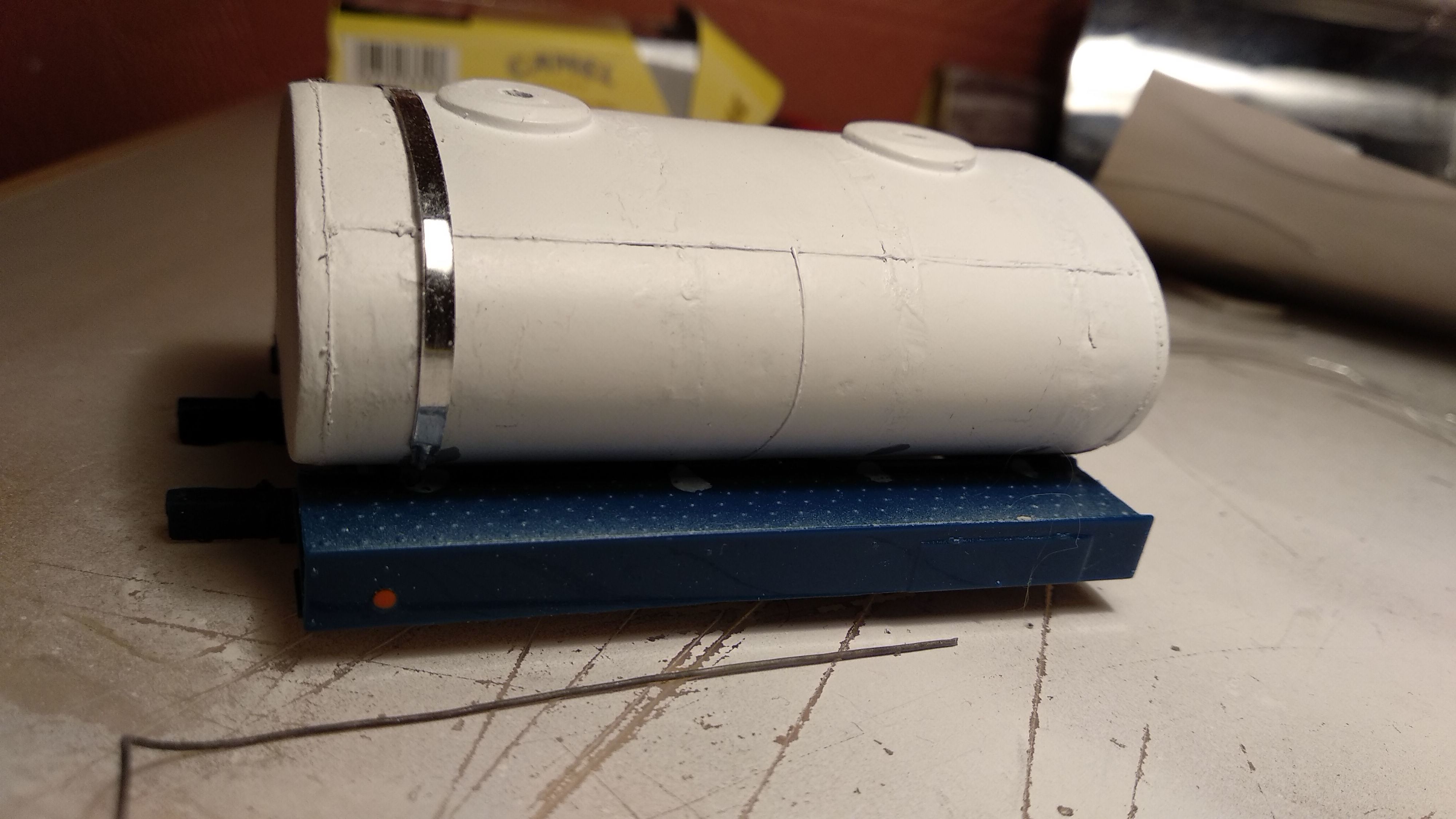 Загрунтовал цистерну, доделал поручни, ошкурил и опять загрунтовал. Собираюсь клеить люки и приступить к окраске цистерны.