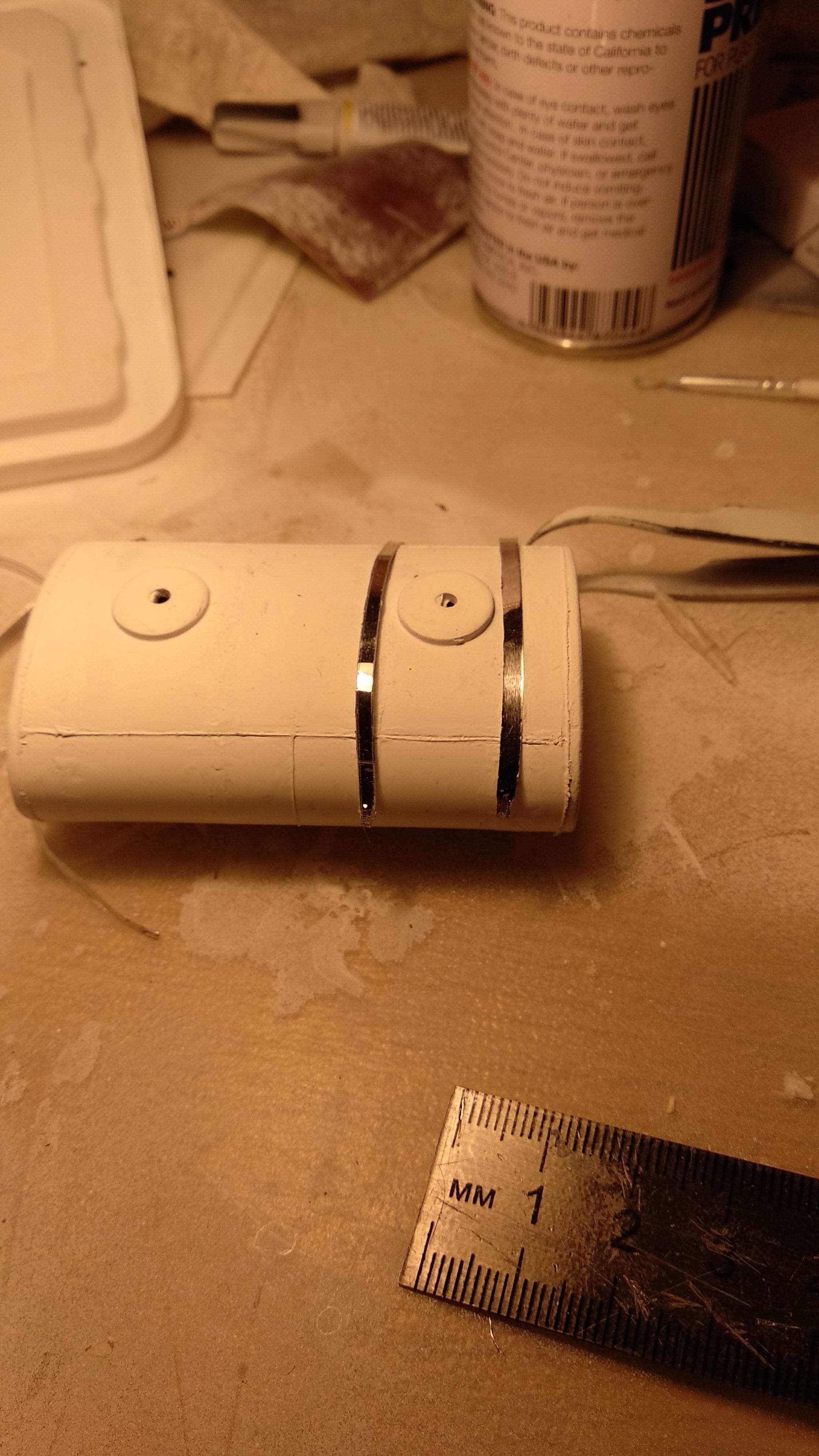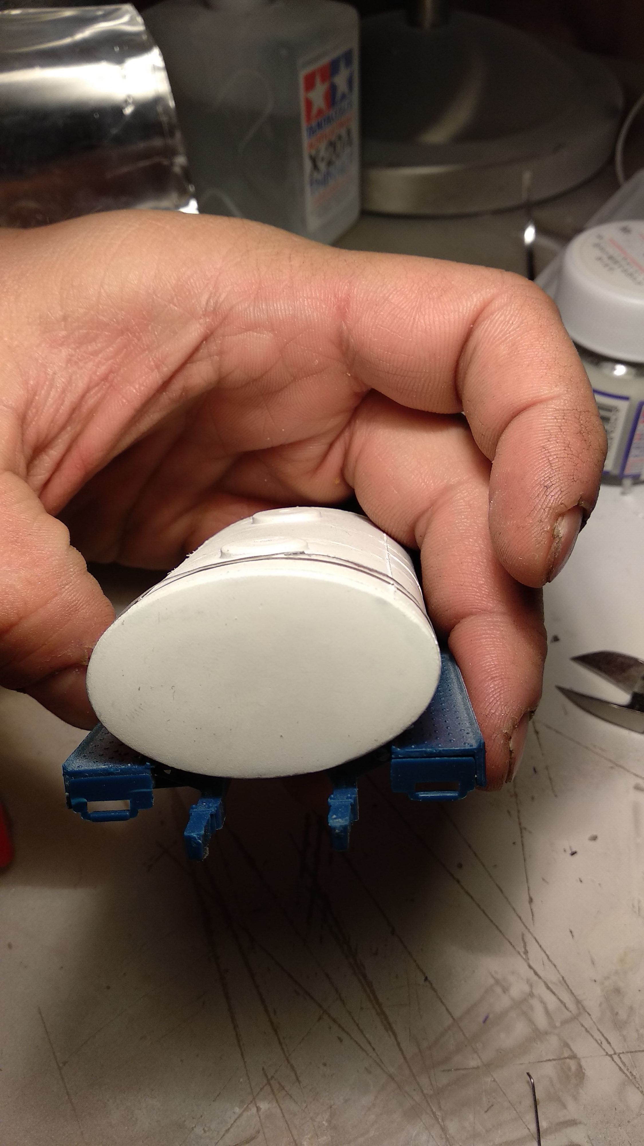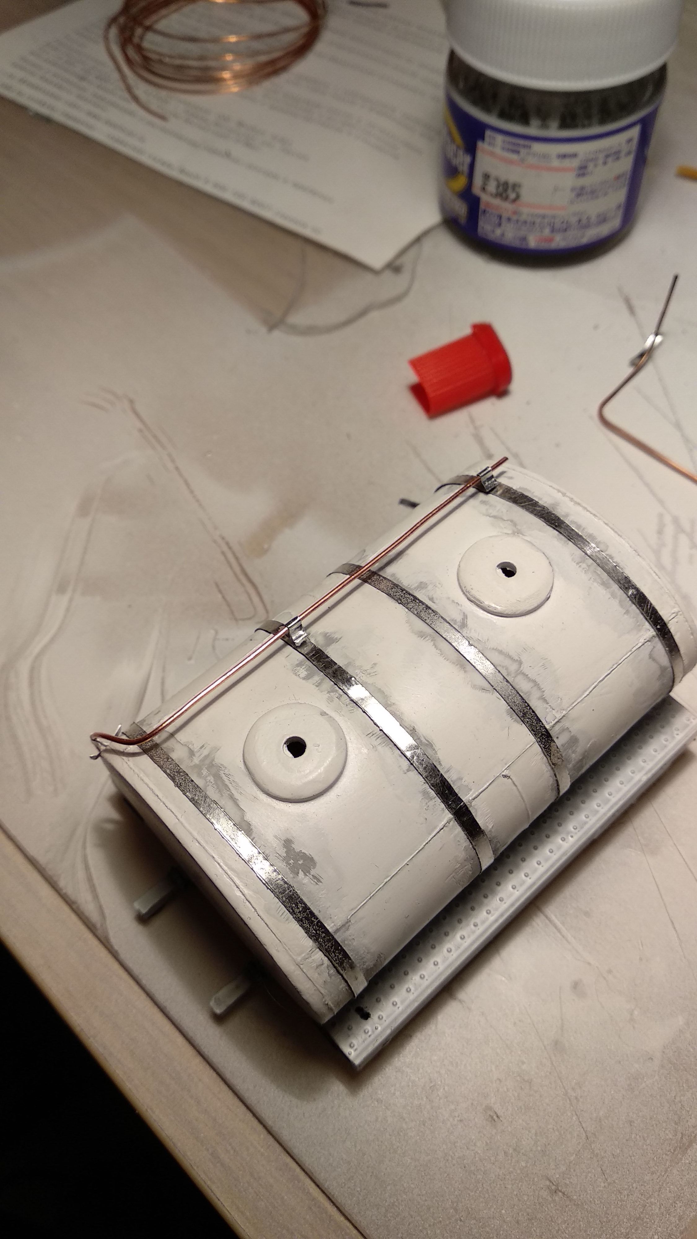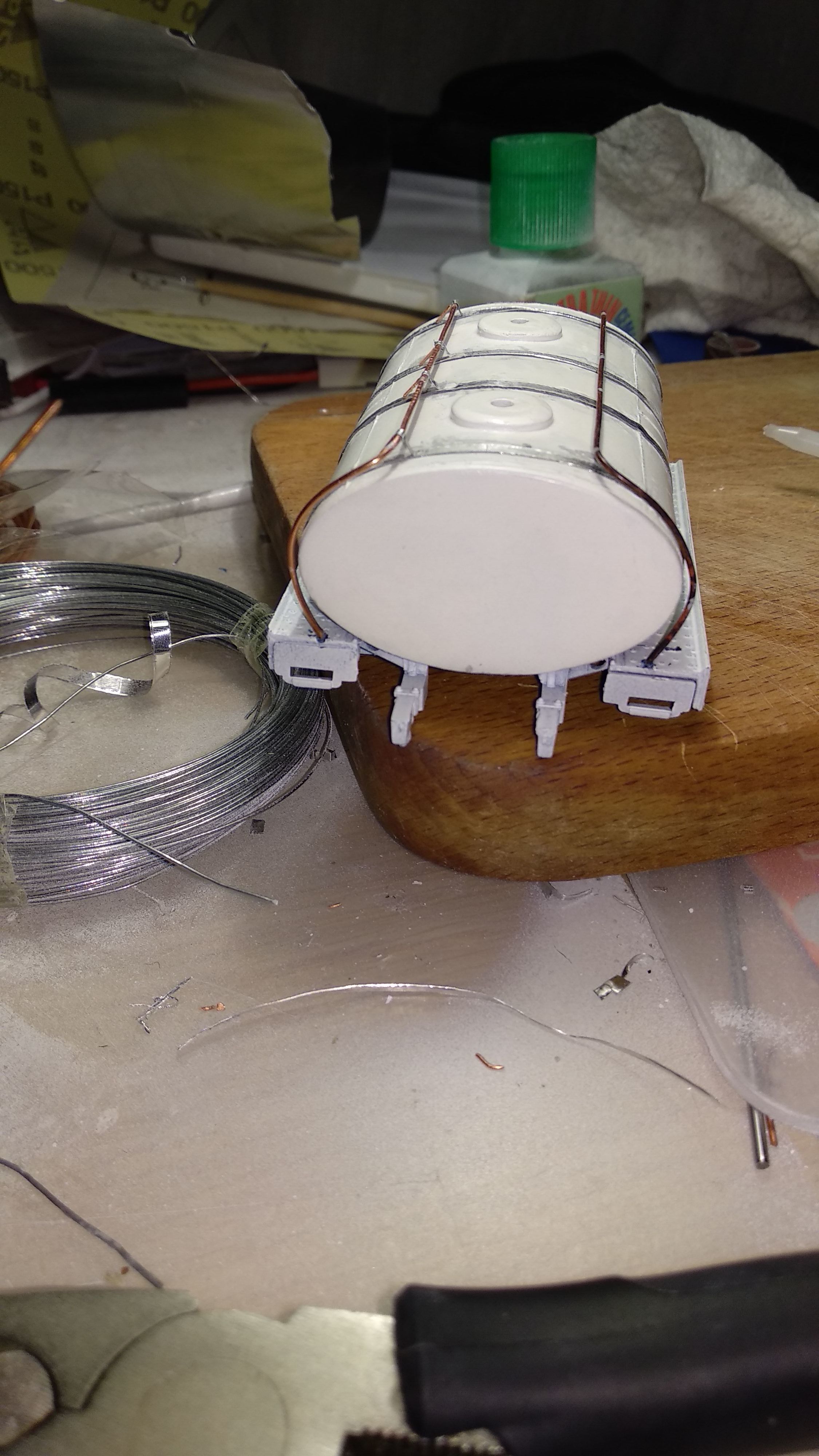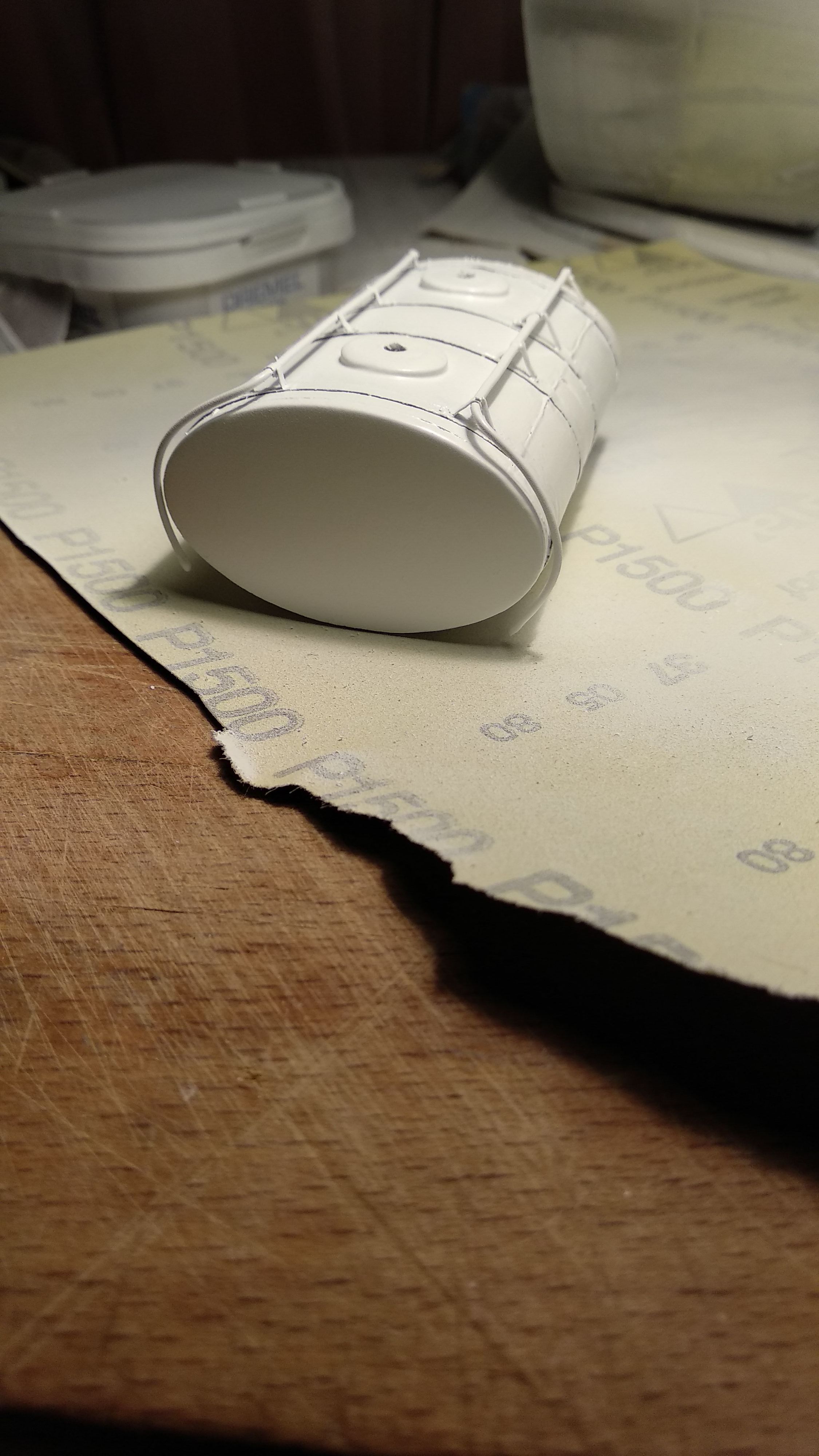 Загрунтовал цистерну, доделал поручни, ошкурил и опять загрунтовал. Собираюсь клеить люки и приступить к окраске цистерны.