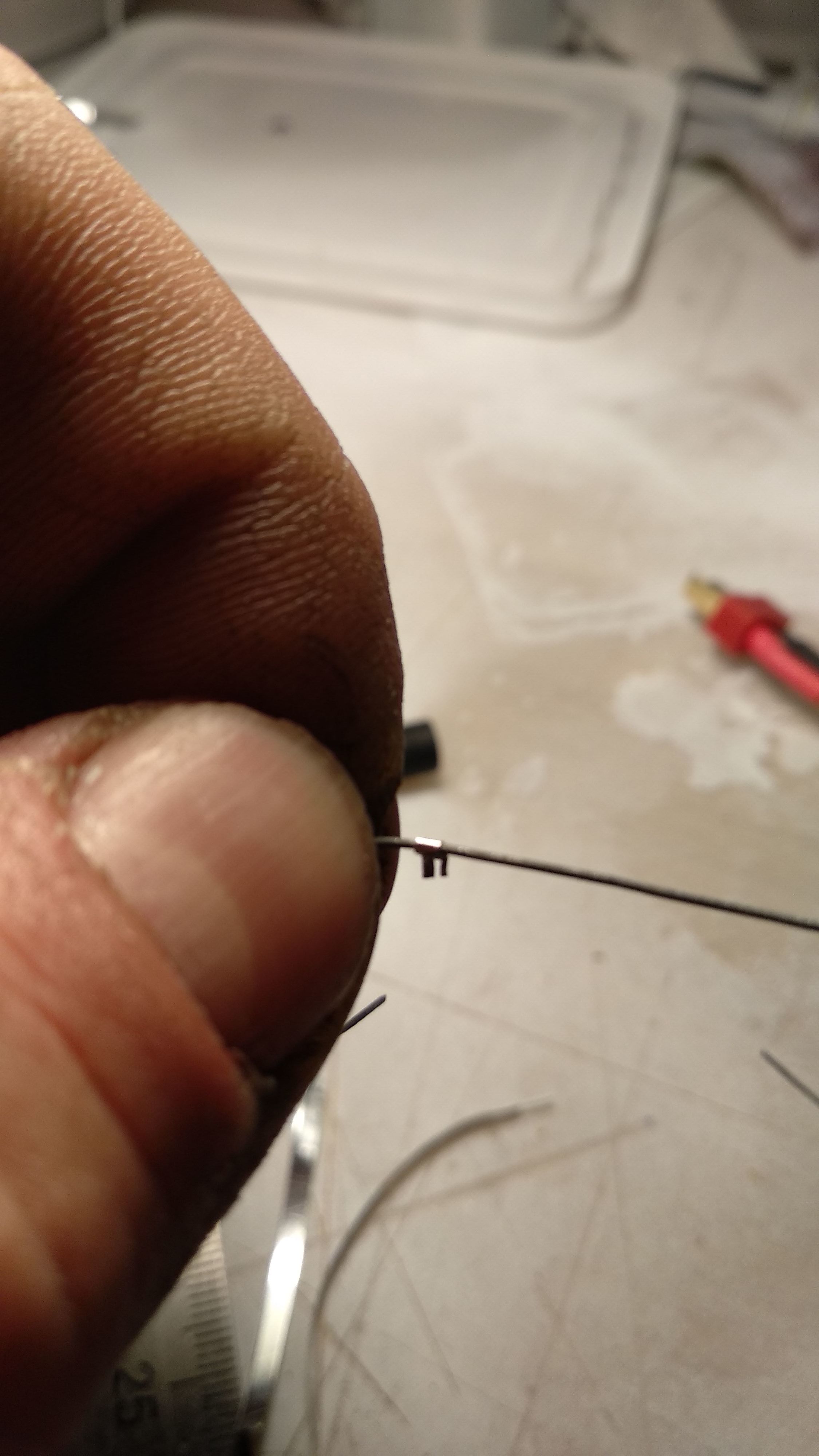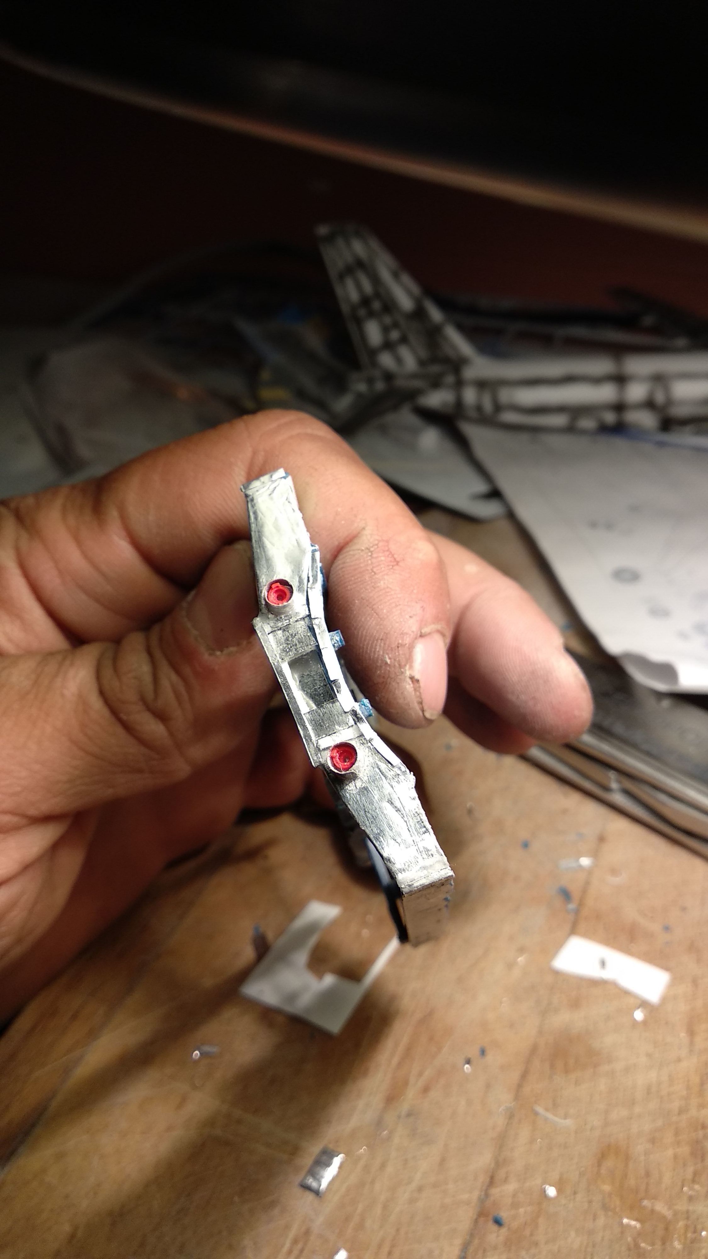 Собственно, вот что получилось. Думаю насчёт натяжки. Пинцетом, если тянуть за хвостовики, вся "слабина" убирается, но сразу возникает вопрос "а как мне это чудо зафиксировать в таком положении"? Кстати, не подскажите, каким клеем лучше клеить алюминий (хомуты из Al фольги, концевики из стальной проволоки).