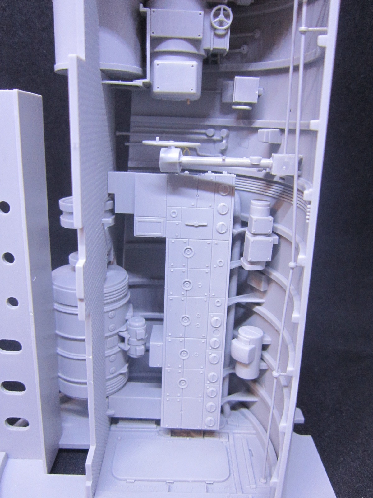 По интерьеру тоже есть упрощения . Например рубочный отсек на фоне отсеков корпуса упрощён до безобразия , несколько манометров пара каких то коробочек , перископ и всё . Так же практически полностью отсутствует силовой набор корпуса и межкорпусная инфраструктура .Так что отсеки лодки показать можно очень подробно а вот силовую структуру корпуса нет , с этим всё плохо . Ну и сам способ показать внутрянку путём половинки корпуса сделанного из прозрачного пластика весьма спорен . По любому будут искажения и ограниченная видимость . А если делать вырезы , то тут вы сами думайте как , трумпетер вам не помошник . Зато есть экипаж )))